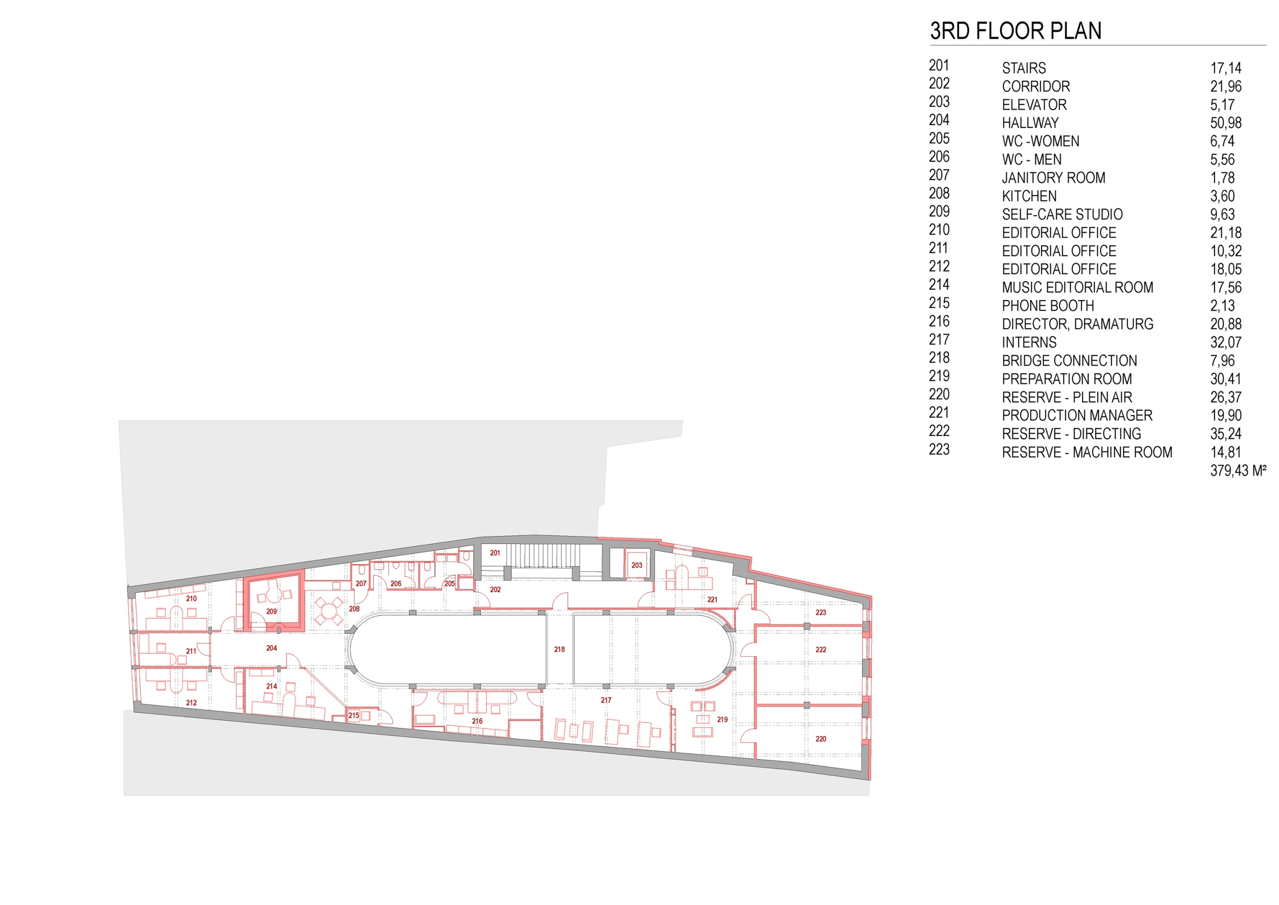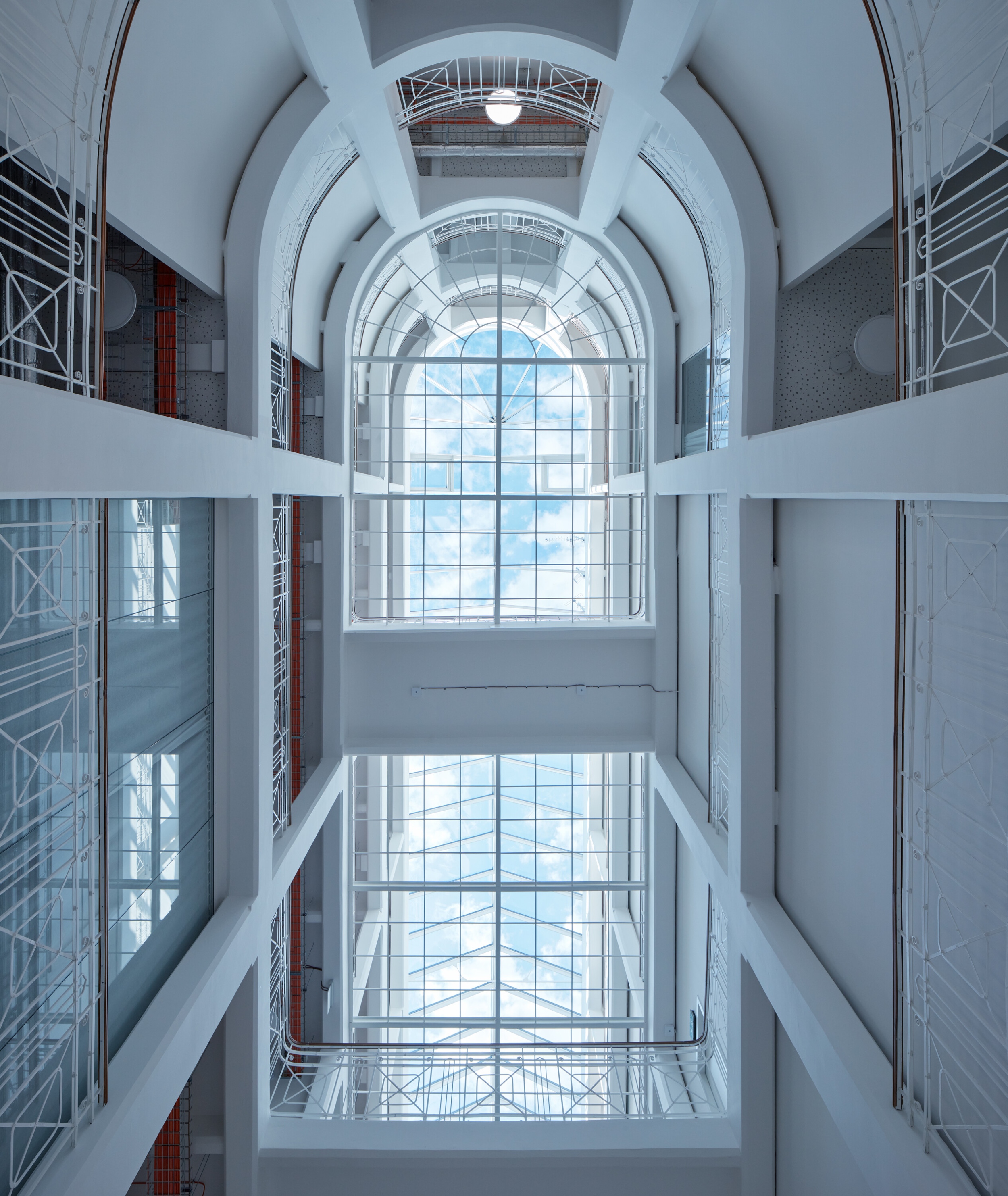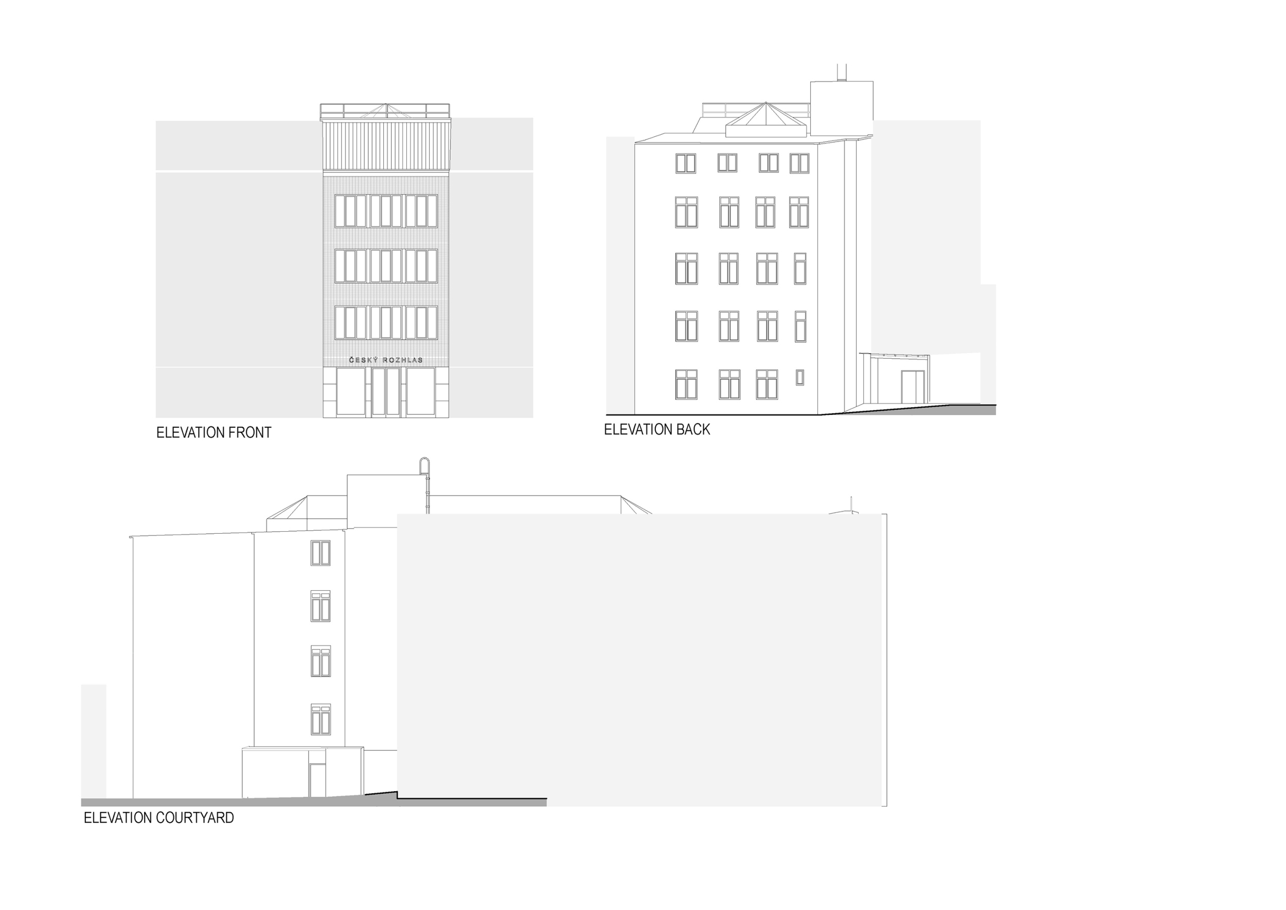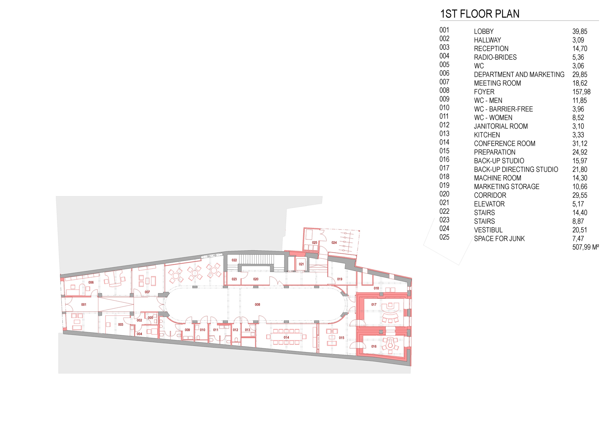 Az egész házban a fehér szín dominál, amely az üveg felülvilágítón keresztül az ég kékjével és sötétjével alkot erős kontrasztot. A végtelenbe nyíló tér utal a rádióhullámok szabad terjedésére. A funkció megkövetelte új helyiségek kialakítása az eredeti vázszerkezethez igazodik. Az eredeti tervet – az épület hátsó, az átrium mögötti szárnyának elbontását, és új, akusztikailag ideális alakú és méretű helyiségek építését – anyagi okokból elvetették.