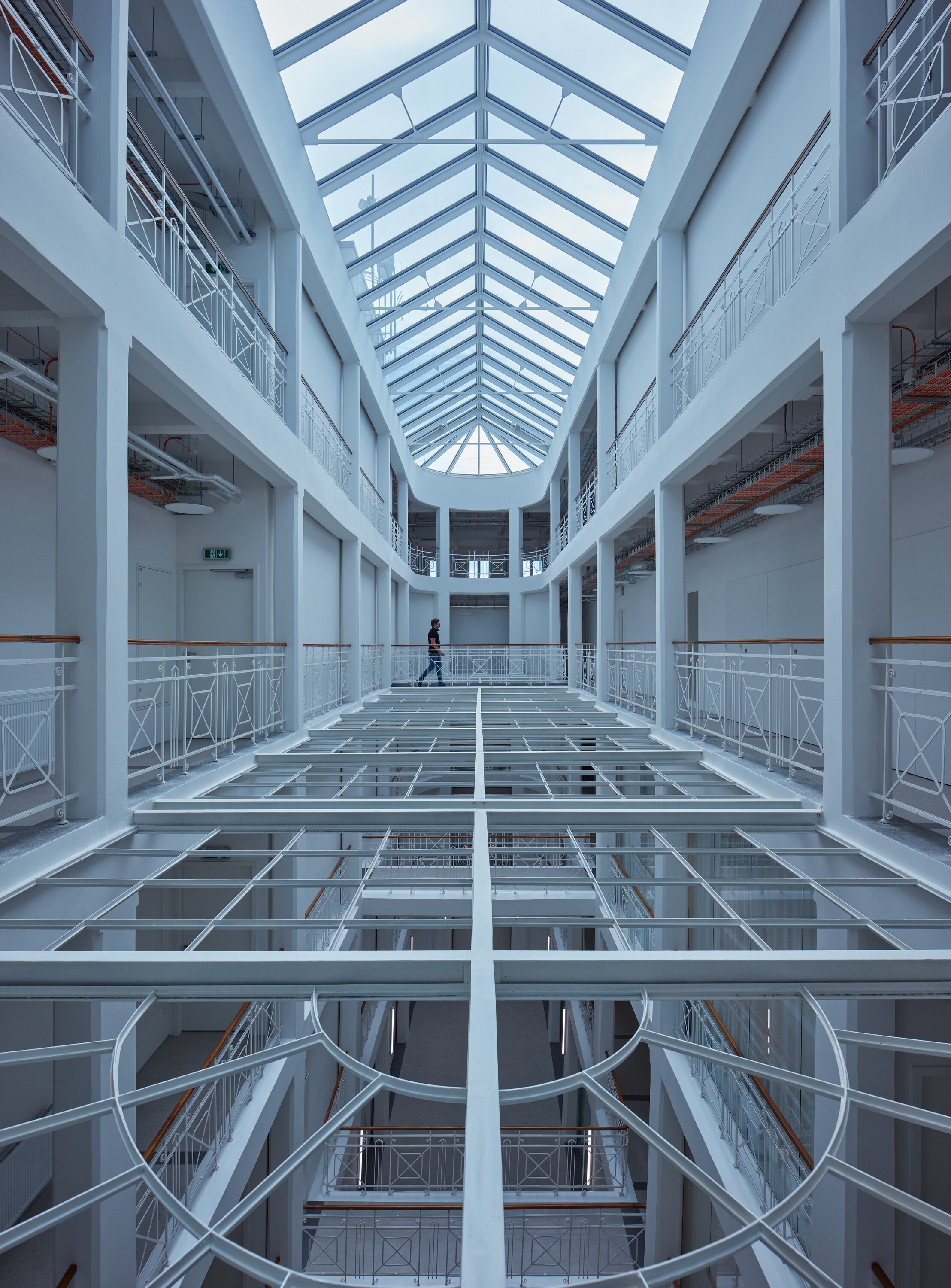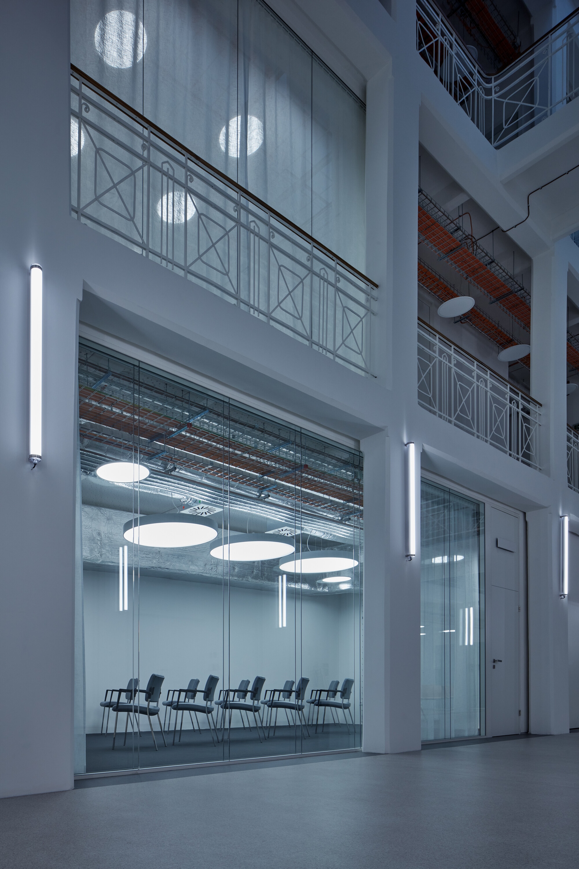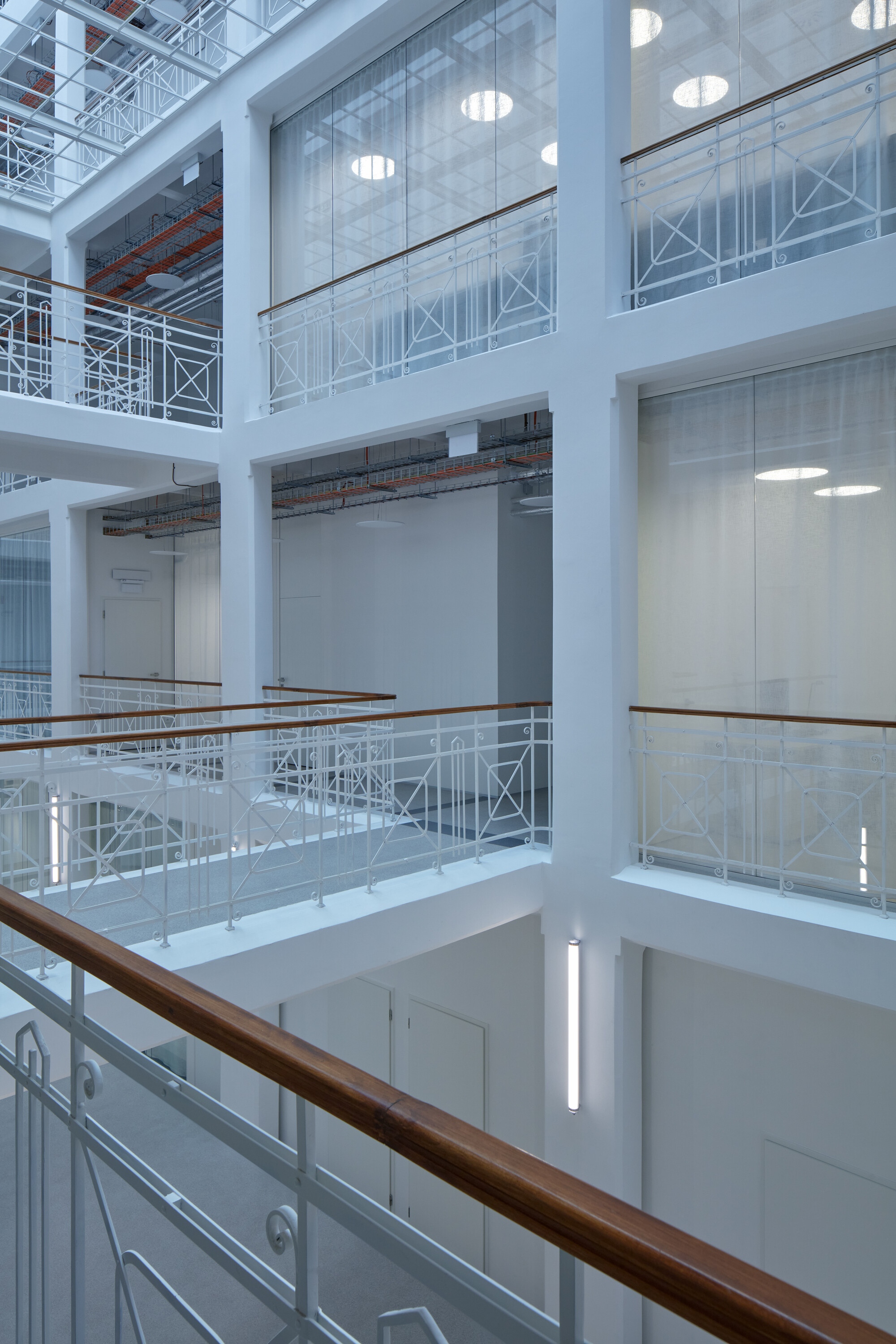 A felújítás során nem csak a funkció változott, de értelemszerűen meg kellett felelni a korszerű hő és hangtechnikai követelményeknek is. A tervezők ugyanakkor maximálisan törekedtek az eredeti szerkezetek és a dekoratív belső tér láttatására. Az új beavatkozások jól megkülönböztethetők, a technikai berendezkedés színes layerként jelentkeznek a monokróm térben. A térelválasztások a galérián ahol lehetett, üvegből készültek, hogy ne akadályozzák a tér szabad áramlását.