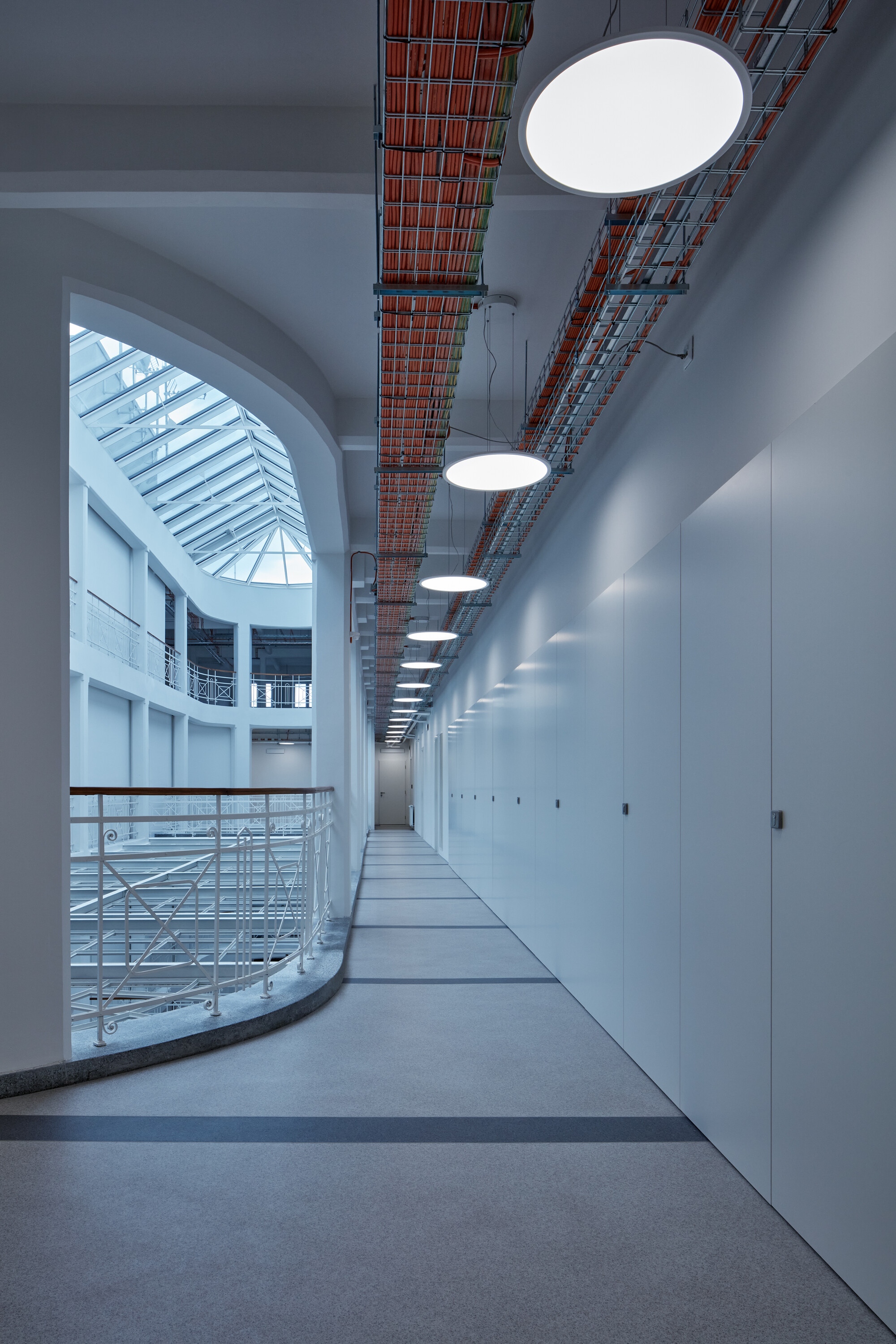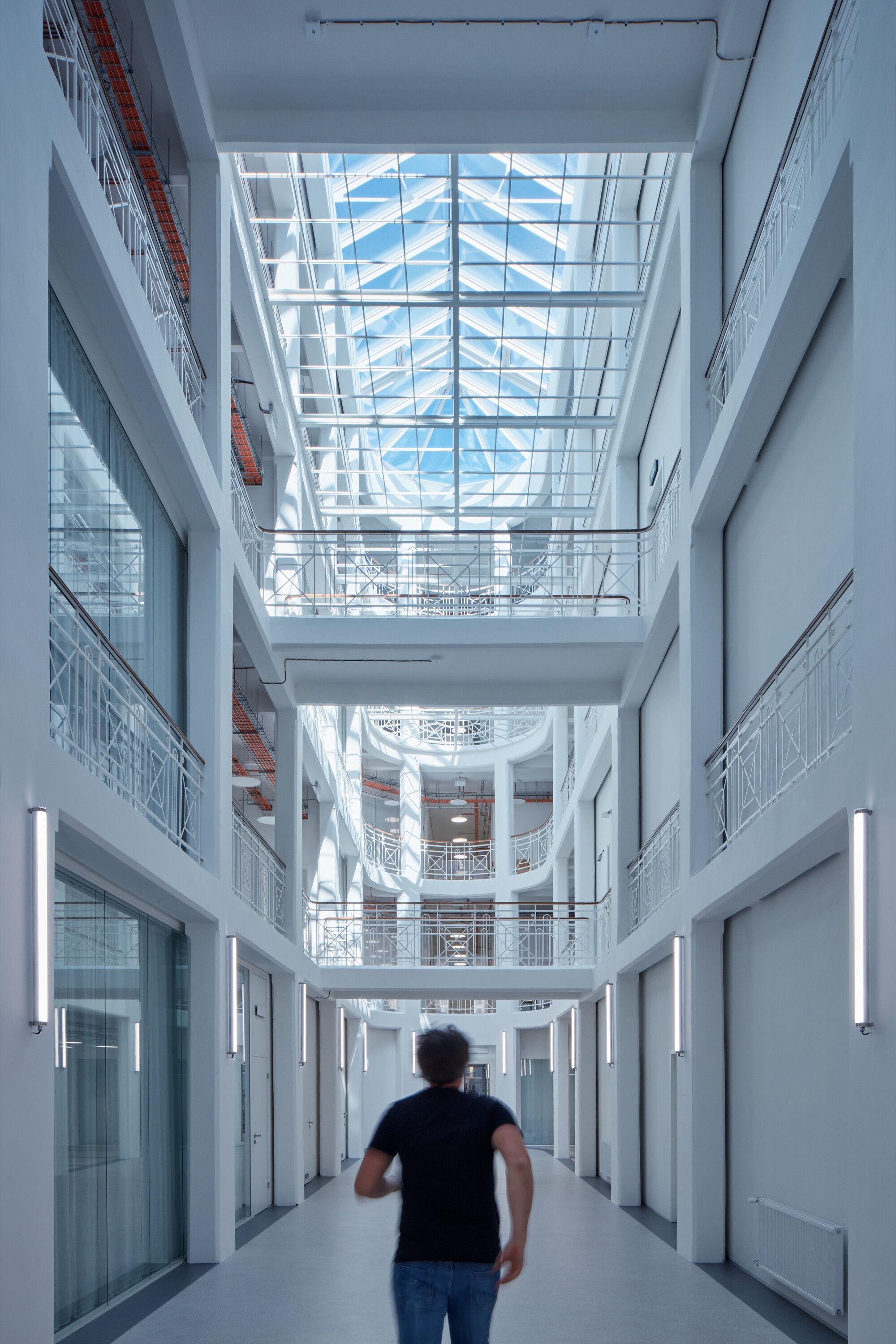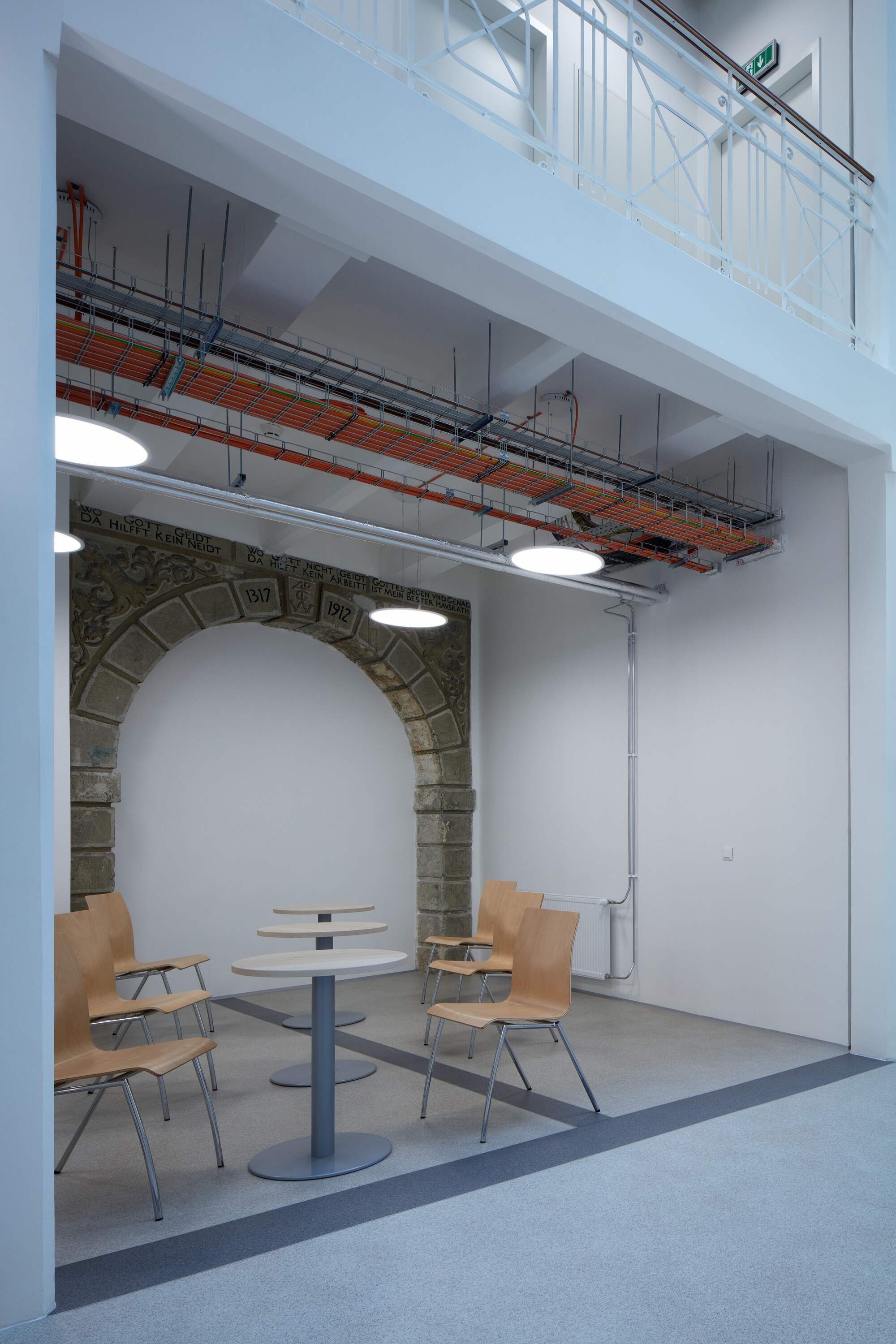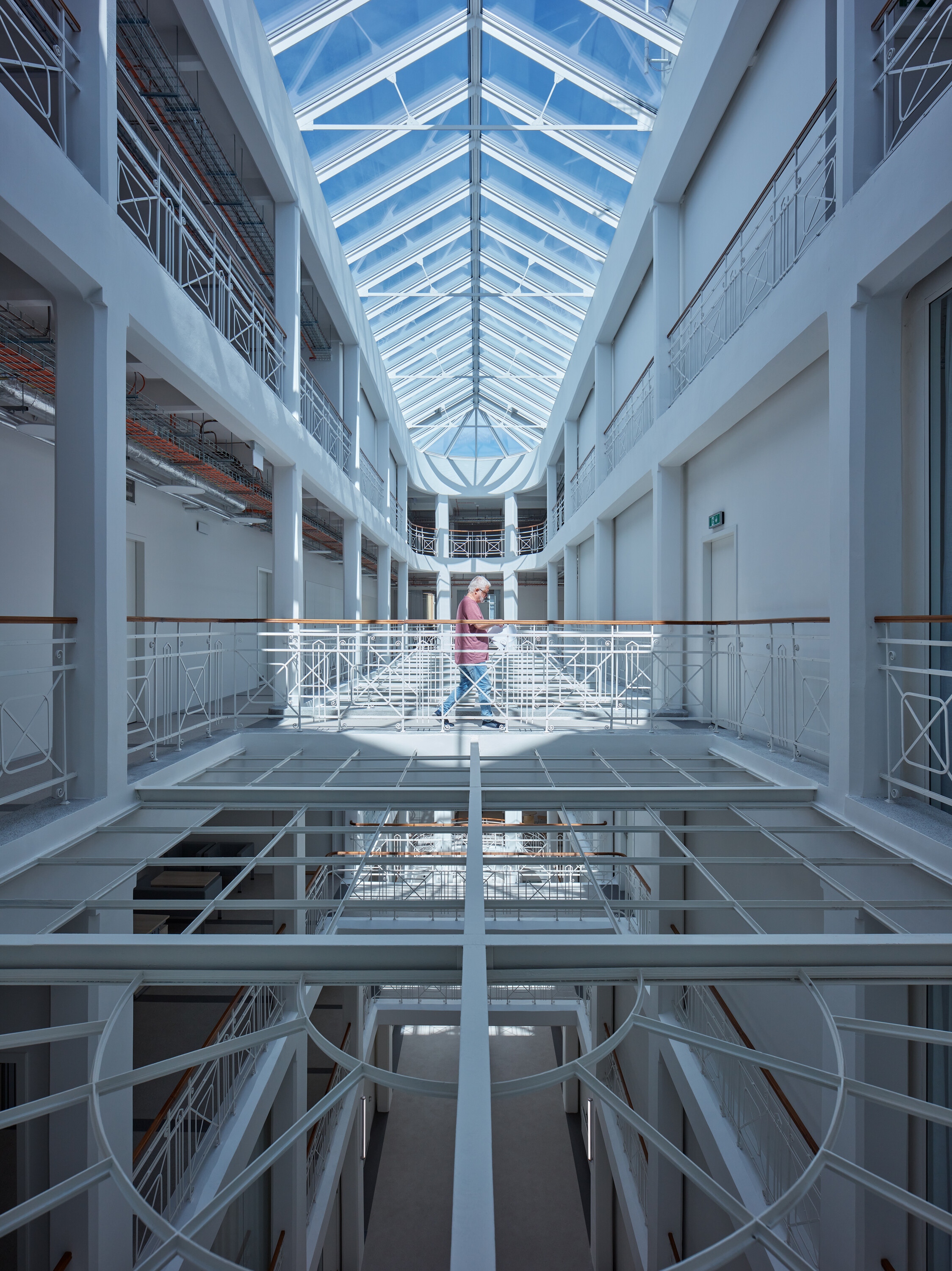A felújítás során nem csak a funkció változott, de értelemszerűen meg kellett felelni a korszerű hő és hangtechnikai követelményeknek is. A tervezők ugyanakkor maximálisan törekedtek az eredeti szerkezetek és a dekoratív belső tér láttatására. Az új beavatkozások jól megkülönböztethetők, a technikai berendezkedés színes layerként jelentkeznek a monokróm térben. A térelválasztások a galérián ahol lehetett, üvegből készültek, hogy ne akadályozzák a tér szabad áramlását.