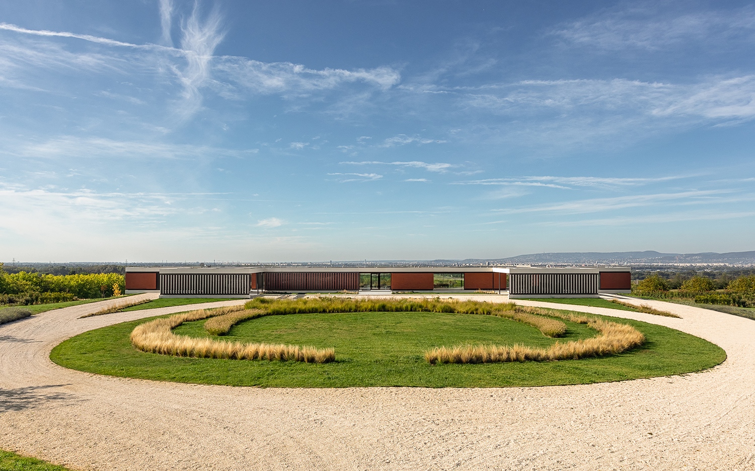 Odakintről egy hosszan elnyúló, egységes vonalú, egyszintes ház látványa fogad, amely azonban a tagoltsága révén szépen illeszkedik a környezetébe. Az utca vonalától 45 fokos szögben elforduló kapu mögött egy kis birtokközpont látványa tárul fel: ahogyan a klasszicizmus idején épült vidéki kastélyok és kúriák előtt, itt sem egyenes út vezet a házhoz, hanem egy nagyobb, kör alakú, növényekkel beültetett rész mellett kell körforgalom-szerűen kanyarodni az érkező autóknak. Ez a megoldás nemcsak egy reprezentatív építészettörténeti minta modern átirata, de optikailag is távolabb helyezi a házat az utcától, jelezve, hogy a nyugalom, az elvonulás az itt élők számára igen becses.