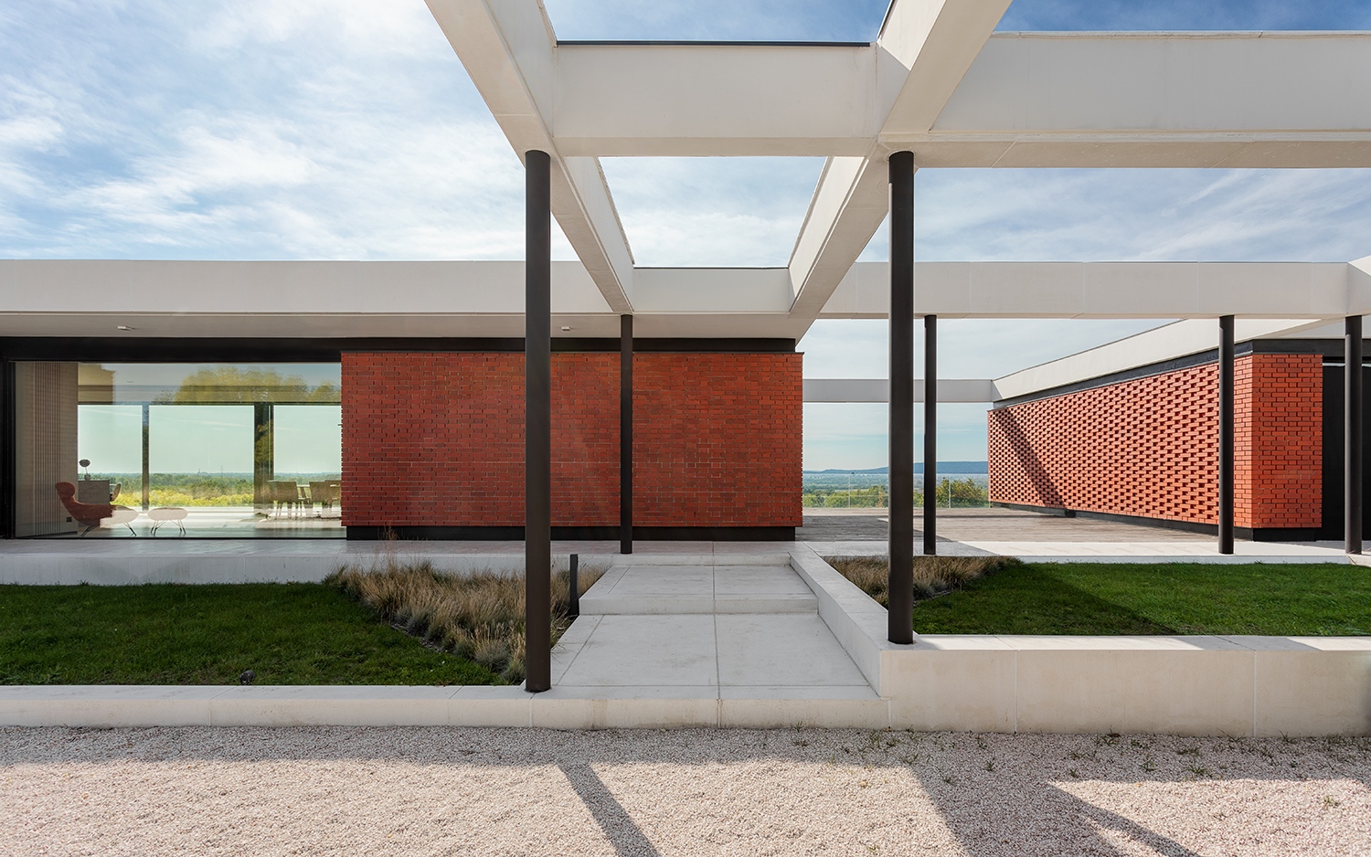 A ház elé érve derül ki az érkező számára, hogy nem egy, hanem három egységet fog össze a hófehér tetősáv, ráadásul a homlokzat is több síkból áll. Kétoldalt egy-egy téglából rakott, áttört pergola rejti a kocsibeállókat, a téglák itt a fekete és a fehér váltakozásával, oszlopszerűen tagolják a síkokat, közöttük rejtelmesen sejlik át a ház látványa és a hatalmas üvegfalak mögött nyíló teljes panoráma. A ház horizontális sávját üvegfalak és téglasávok tagolják, a közös terek teljesen átláthatók a kert irányába, a privát tereket zárt homlokzat védi. A bejárat melletti téglafalak egyes darabjai kissé megmozgatva, plasztikusan törik meg a rájuk eső napfényt, finom árnyékhatásokkal bontva meg a felület látványát. A pergolák és a ház között oszlopokkal tagolt árkád húzódik, ami tovább növeli a tágasság érzetét, akárcsak a három különálló lakás közötti fedett átriumok.
