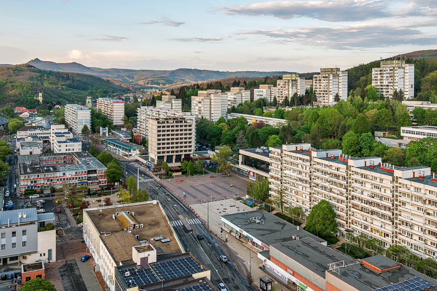 A városi főtér módosított beépítési tervét Magyar Géza (LAKÓTERV) késztette el 1962-ben, amely már számolt a két központi elemmel: a tervezés alatt álló Karancs Szállóval és a Szrogh György tervezte József Attila Művelődési Házzal. A főtér arculatának leginkább meghatározó eleme a Jánossy György (KÖZTI) tervei nyomán elkészült szálloda lett, amely annyira kiemelt szerepet kapott, hogy tervezője beleszólhatott a teljes tér beépítésébe, tömböket helyezhetett át.