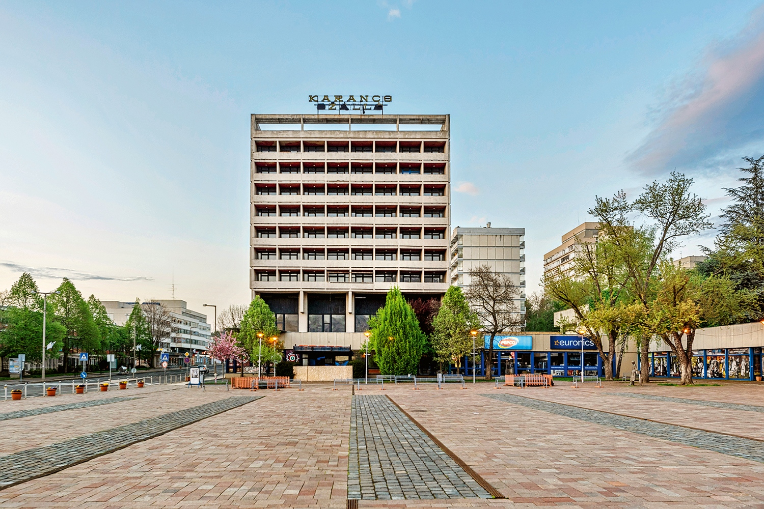A főtér csak a szálloda átadása után három évvel, 1967-ben készült el, a már említett művelődési házzal, a Magyar Géza tervezte nyolcemeletes, hat lépcsőházas nagyszabású lakótömbbel – az ún. erkélyházzal, amiből később még további három is készült –, valamint a Finta József tervezte, a maga idejében számos, ritkának számító szolgáltatást kínáló Pécskő Áruházzal. A helyiek által „Kari”-nak becézett szálloda nem csak a tér, hanem a város életében is kiemelkedő színfoltnak számított az eszpresszójában rendezett ötórai teáktól kezdve a zenés bulikig, így gyorsan a fiatalok közkedvelt szórakozóhelye lett.