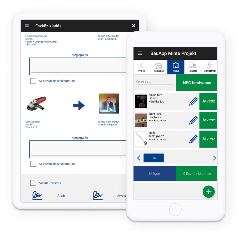 Képeken a BauApp-csapat, és az általuk fejlesztett termékcsalád és eszközkezelő: