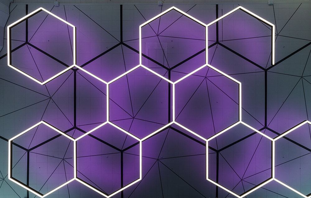 Hasonlóan egyedi tervezés és gyártás a 300 fős konferenciaterem mennyezetéről függesztett szabályozható RGBW-s „Hexagon” lámpatestrendszer.