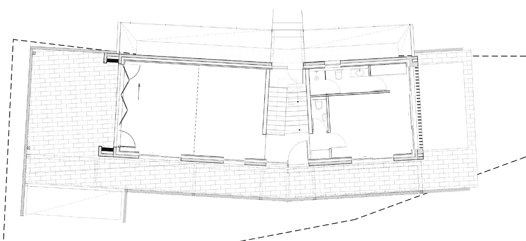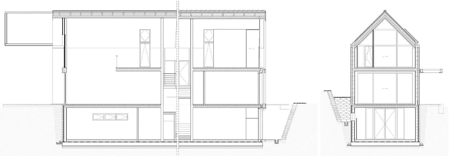 Az alsó szint egy zártabb, rekreációs tér, amely borkóstolásra, filmnézésre vagy pihenésre szolgál, valamint van itt egy hálószoba, ami a terepbe süllyesztett átrium révén közvetlen kapcsolatban marad a kerttel és a fény változásaival. A földszinten a ház kitárul: még egy hálószoba mellett a nappali, az étkező és a konyha egyetlen, nagyvonalú térben olvad össze, ahol a természetes fény és a kilátás szervezi az életet. A nagy üvegfelületek nem pusztán beengedik a fényt, hanem párbeszédbe hozzák a belső és külső világot – a ház így a táj folytatásává válik. Az emelet egy galériával és a harmadik hálószobával kapcsolódik a földszinthez.