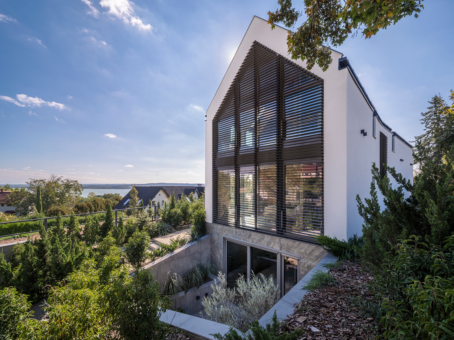 A tihanyi félsziget egyedi topográfiája különleges adottságokat, ugyanakkor kihívásokat is rejt. A domborzat, a növényzet, a tó közelsége mind meghatározzák, hogyan lehet és hogyan érdemes építkezni ezen a karakteres vidéken. A most bemutatott épület egyik legfőbb erénye, hogy nem pusztán elhelyezkedik ebben a tájban, hanem részévé válik annak. A telek ék alakú, enyhe lejtője befolyásolta az építész minden döntését. A tervezés során az volt a cél, hogy az épület ne ellenálljon a terep adottságainak, hanem kövesse és értelmezze azokat.
