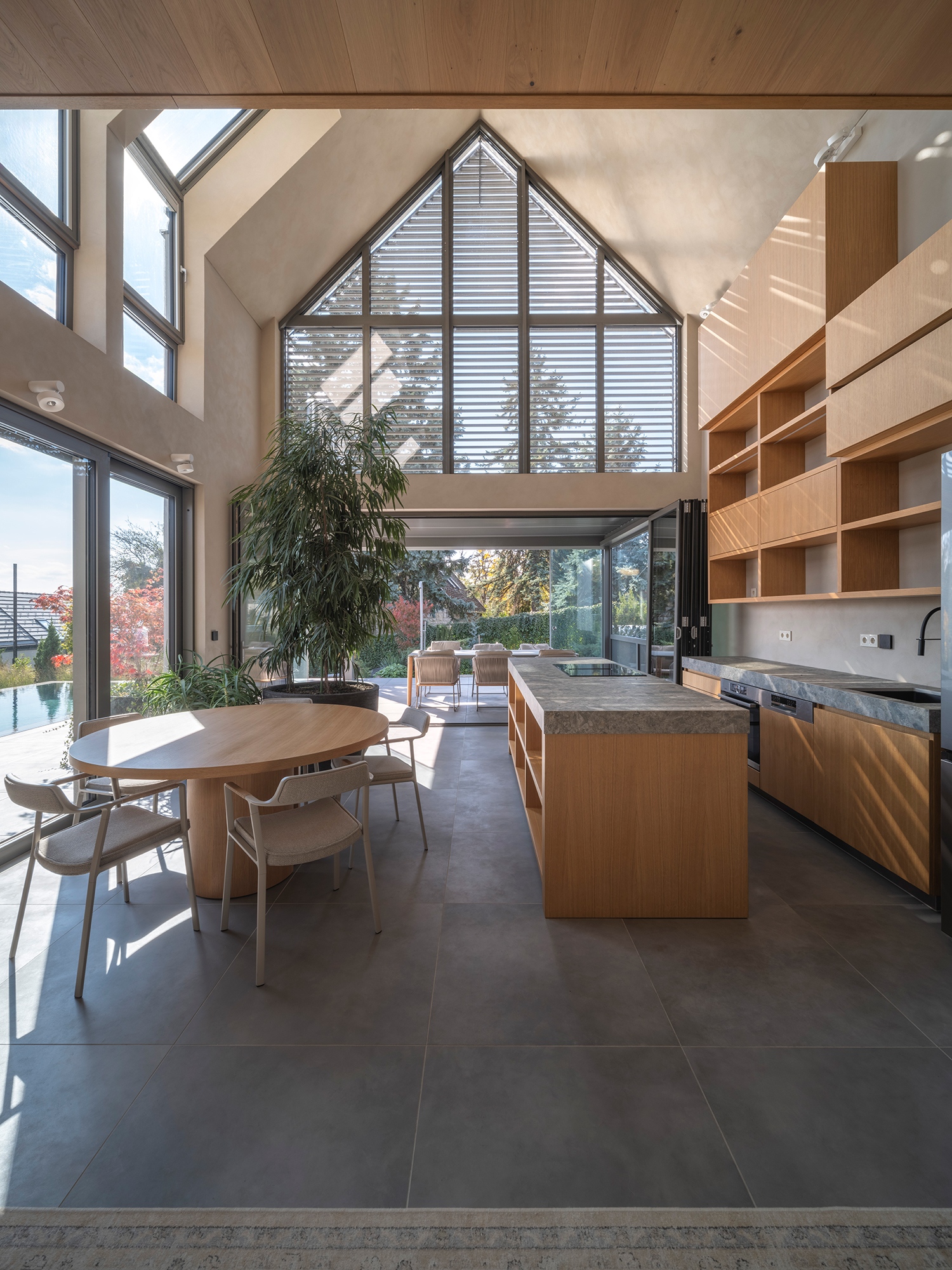 „A telek tenyérként tartja a rajta lévő házat” – fogalmazta meg Fónagy Dóra, aki a belsőépítészeti koncepciót jegyzi. Ez a szemlélet a ház egészén végigvonul: az épület nem tárgyként áll a természetben, hanem kapcsolatot keres vele. A terepbe metszett átrium és a földszinti üvegezett étkező-terasz, a visszafogott anyaghasználat és a finoman rétegzett térkapcsolatok mind a táj folytatásaként értelmezhetők. Példaértékű, ahogy a megbízó irányította a tervezők és kivitelezők csapatmunkáját. Így integrálódott a kerttervbe az épület, majd az építészetbe a belsőépítészet.