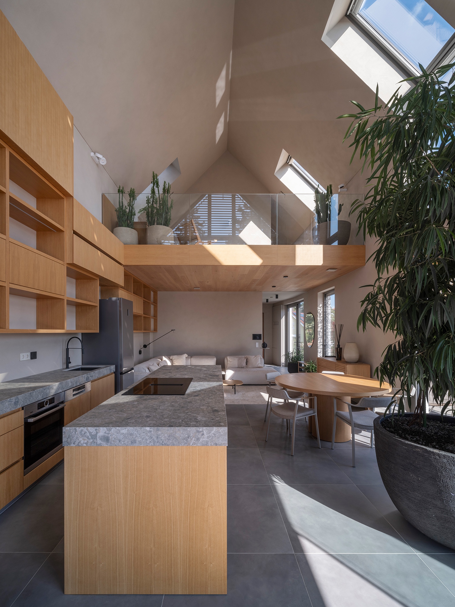 A belsőépítészeti koncepció Fónagy Dóra gondolkodására jellemzően a nyugalomra és egységre épül. A terek között nincsenek éles határok – minden átfolyik, minden körbejárható. A beépített bútorok, a konyhapult, a galéria és a mozgatható elemek egyetlen folytonos szerkezetként jelennek meg. Az anyaghasználat tudatosan visszafogott: természetes fa, neutrális árnyalatok. Ezek együtt olyan csendes hátteret teremtenek, amelyben a fény és az élet mozgása válik főszereplővé.
