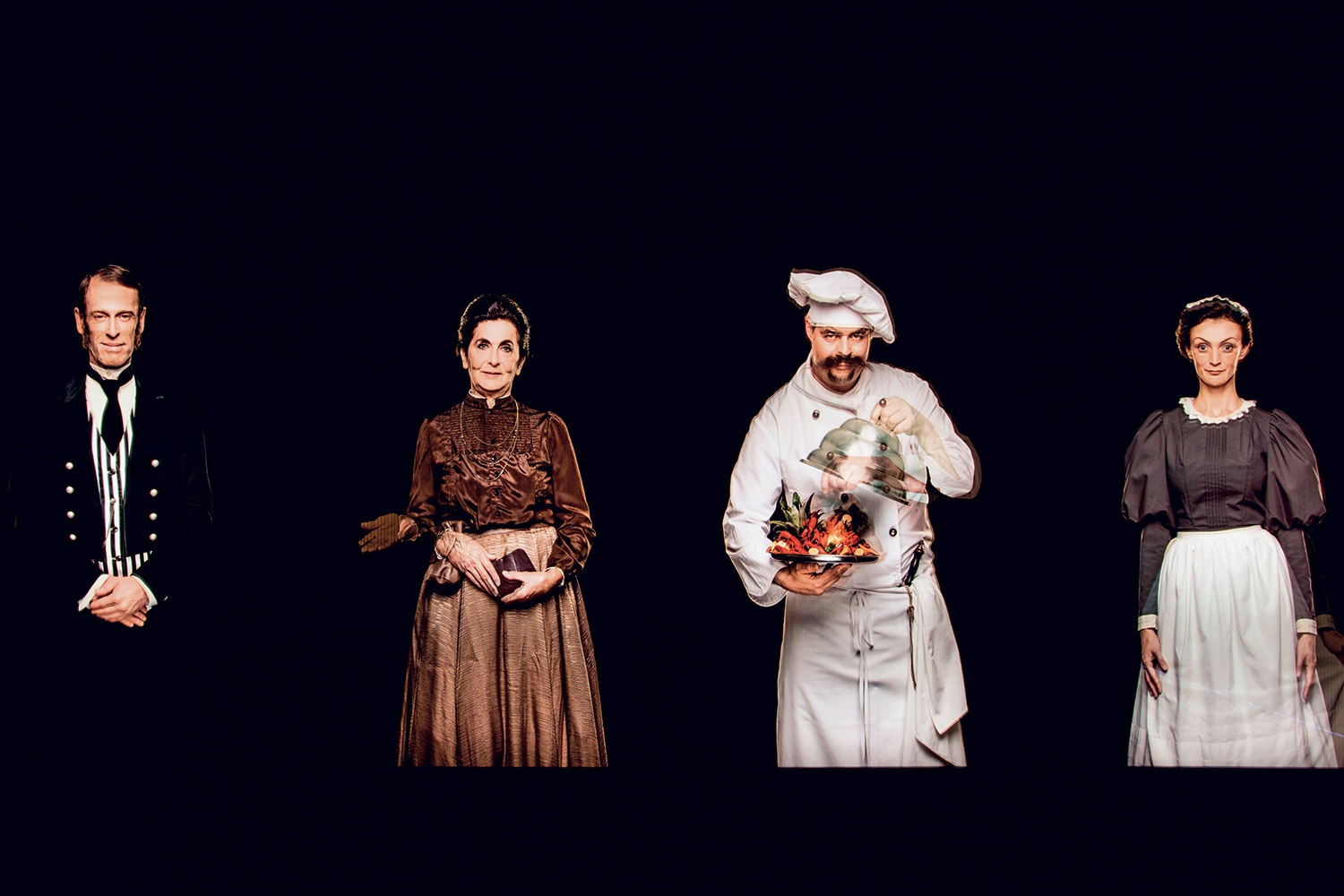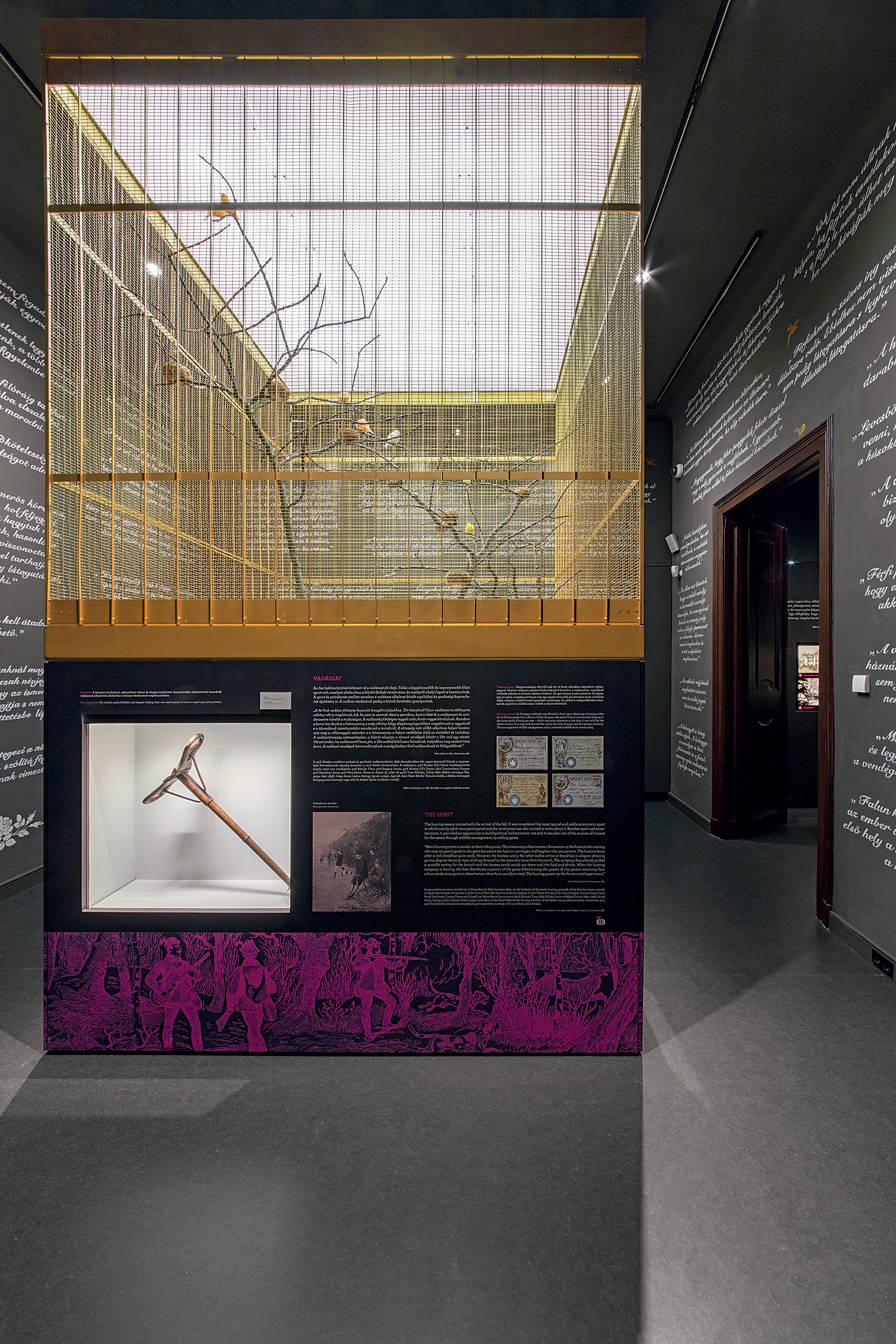 Alul ide telepítették a látogatóközpont bejáratát a pénztárpulttal, aztán ugyanez a hatás folytatódik, amikor a központi kiállítótérbe érünk: kiderül, nemcsak az épületet, de kiállítási bemutatását is lehet különlegessé avatni. A bejáratnál – ahogy egykor a kastély vendégeit is – életnagyságú libériás inas, komorna, szakács fogadja. Mindezt egy lentikuláris képen (a több képből összerakott installáció, ami a változó nézőpontból bemozdul, másképp néz ki, szinte kikacsint, mint egykor a kacsintós pénztárcák esetében), és a Sz. Szilágyi Gábor az érdekességeket, ellentéteket, interaktivitást és szenzitivitást bevetve vonja be rögtön a látogatót, illetve, valamivel később, szinte a felmerülő gondolatait is előre kitalálja.