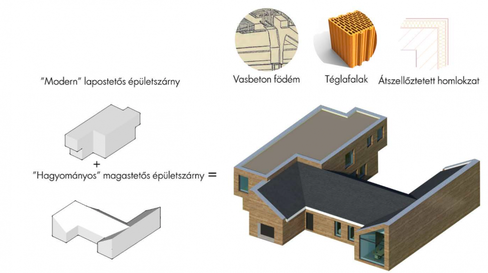 A pályázat épület-szerkezettani része is aprólékosan kidolgozott. A tervek szerint a falazat téglás, a födém vasbetonból készült, a kétszintes épületszárnyban lévő épületkonzolok miatt. A beépítetlen tetőtér fölé viszont lehetőség van előre-gyártott födémrendszer alkalmazására. Az ablakok a hőszigetelés síkjában helyezkednek el, a lehető legkedvezőbb energetikai kialakításért. Az épület kialakításánál fontos szempont volt, hogy lehetőleg ne legyen túl sok üvegfelület, a kedvező hő-átbocsátás érdekében. Az egyetlen nagyobb méretű üvegfelület a ház déli oldalán helyezkedik el, biztosítja a megfelelő fényt a konyhába és az étkezőbe. A déli fekvés télen is kedvező, a nap fűtő hatása miatt. A közös használatú helyiségek hő-visszanyerő szellőztetésűek.