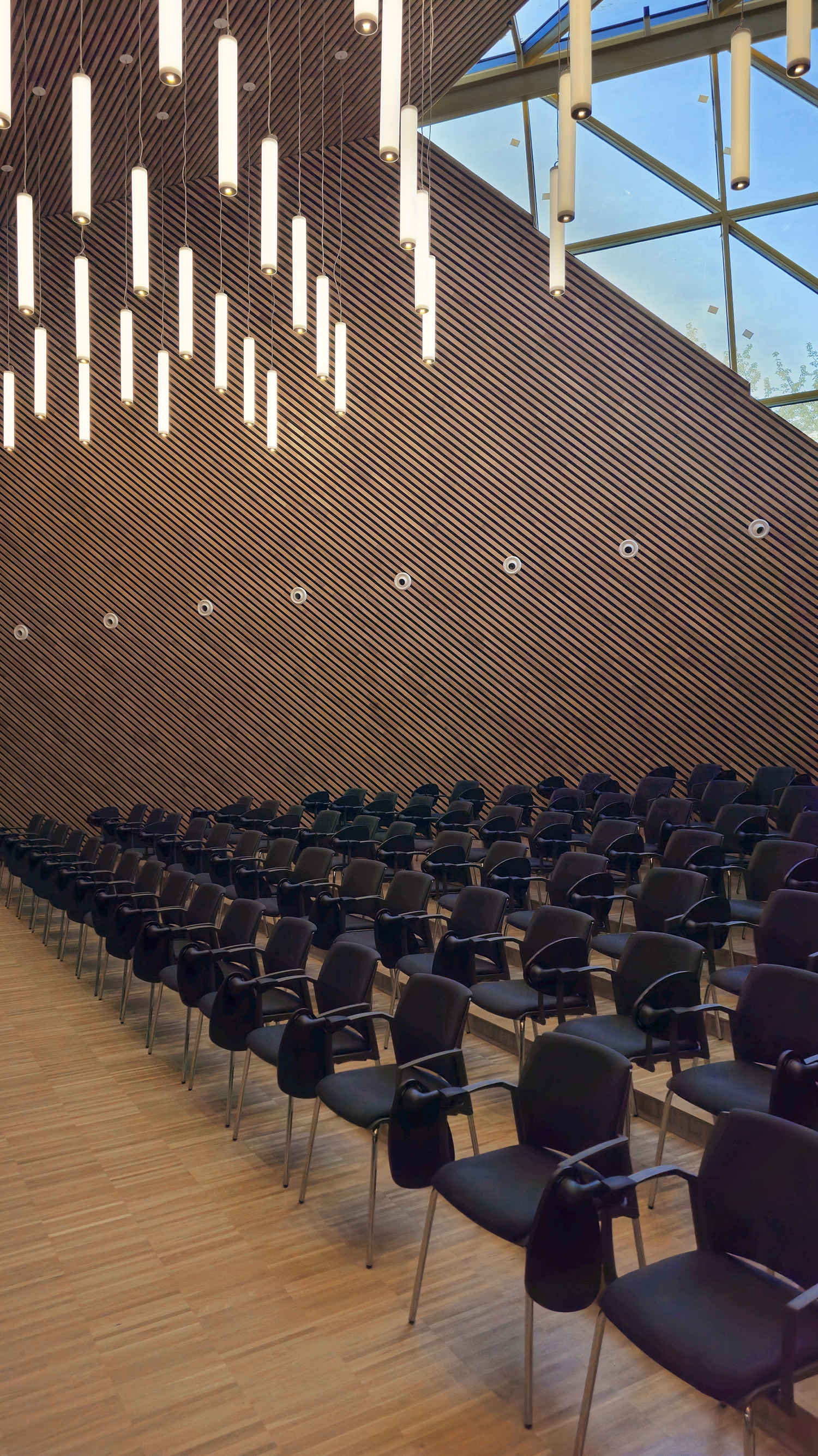 A szellős, faburkolatú tér felső sarkában megtörik, az ide behelyezett üvegbetétek kellő benapozást biztosítanak. A levéltári épület nagy része azonban csendes, a kutatást, az elmélyülést szolgálja, a belsőépítészeti kialakítás pedig jól kapcsolódik a megújult könyvtáréhoz. Az Egyetemváros markáns új épületszárnya kellőképpen zárja a könyvtárral indított folyamot, amely a terepviszonyokkal együtt finoman hullámozva emelkedik a völgy vége felé és alkot egy új, szimmetriával is kiegészített, immár beteljesült egységet.