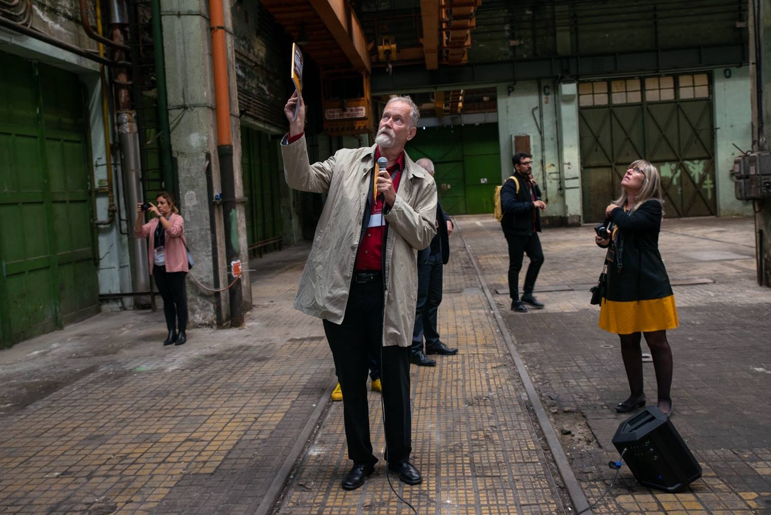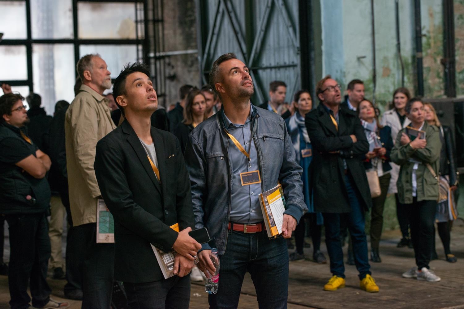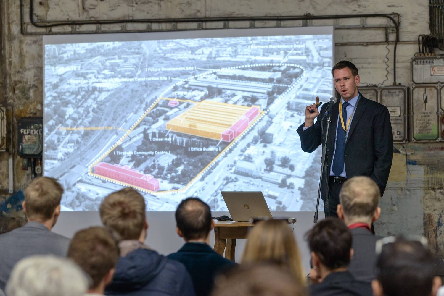 Végre a helyszínen, vagyis a kőbányai Északi Járműjavítóban üdvözölhettük a pályázat első fordulójában kiválasztott 15 sikeres magyar és világhírű nemzetközi építésziroda képviselőit. A héten lezajlott helyszíni bejárások során az építészek közvetlen, személyes benyomásokat szerezhettek az ún. Diesel-csarnokról és környezetéről, amelynek átalakítása a tervpályázat tárgya.