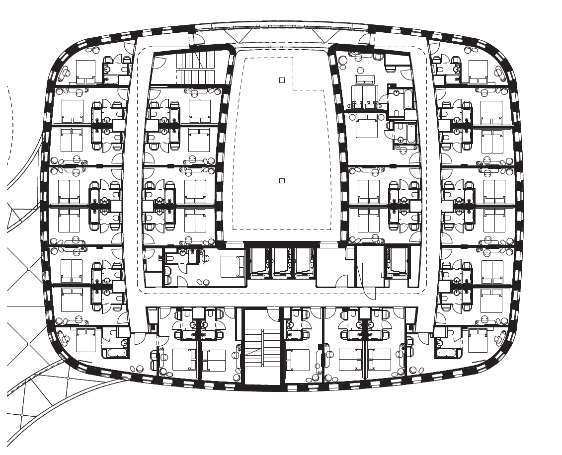 A két épületnek végül egy összekötő nyaktagban lett közös főbejárata, innen nyílik a TRIBE lobby és lounge része. Benne két fókuszt látunk: az egyik a tér „szíve”, a főként arany színekben pompázó bárpult, mögötte pedig a tér „idegrendszere”, a liftházat rejtő vörös tömeg. A felső öt szinten következnek a standard szobák, a hatodik emeleten pedig a nagyobb, akár négyszemélyes lakosztályok sorakoznak a helyiségek ívén végigfutó klassz panorámával és rálátással a futópályákra.