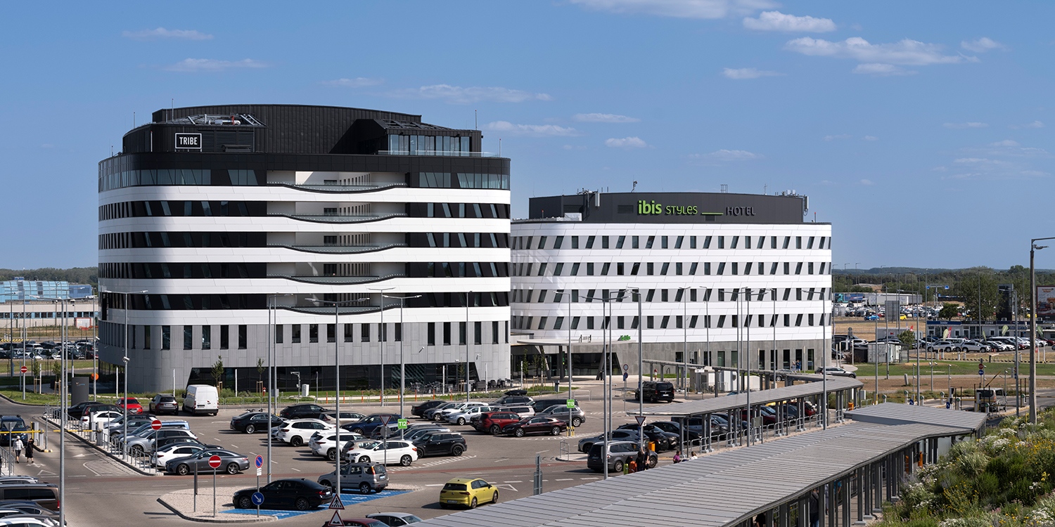 Annak idején, amikor a többségi tulajdont még a franciák szerezték meg a repülőtér üzemeltetésben, az első teendőjük a hiányzó szolgáltatások feltérképezése volt. A legközelebbi szálláshelyek Vecsésen voltak, a fővárosi közlekedési kapcsolatok jellemzőit pedig nem kell részleteznünk. Több verzió után végül a parkolón túli telket választották ki helyszínnek, ott viszont a hrsz-t kettészeli a közigazgatási határ, így tréfás módon ugyanúgy „Vecsésre kell menni” a legközelebbi alvóhelyért. A hét éve átadott Ibis Styles Hotelt [lásd Molnár Szilvia: Gép száll fölébe, OCTOGON 2018/1. – a szerk.] szintén a WING Zrt. fejlesztette és az Accor üzemelteti.