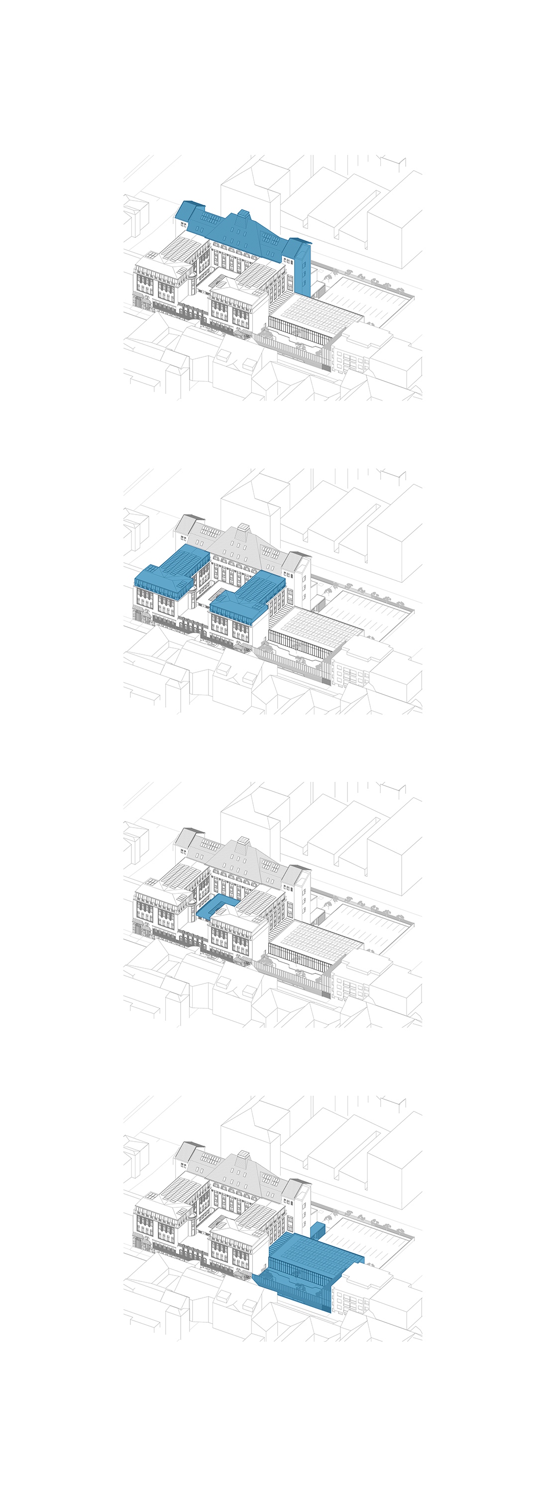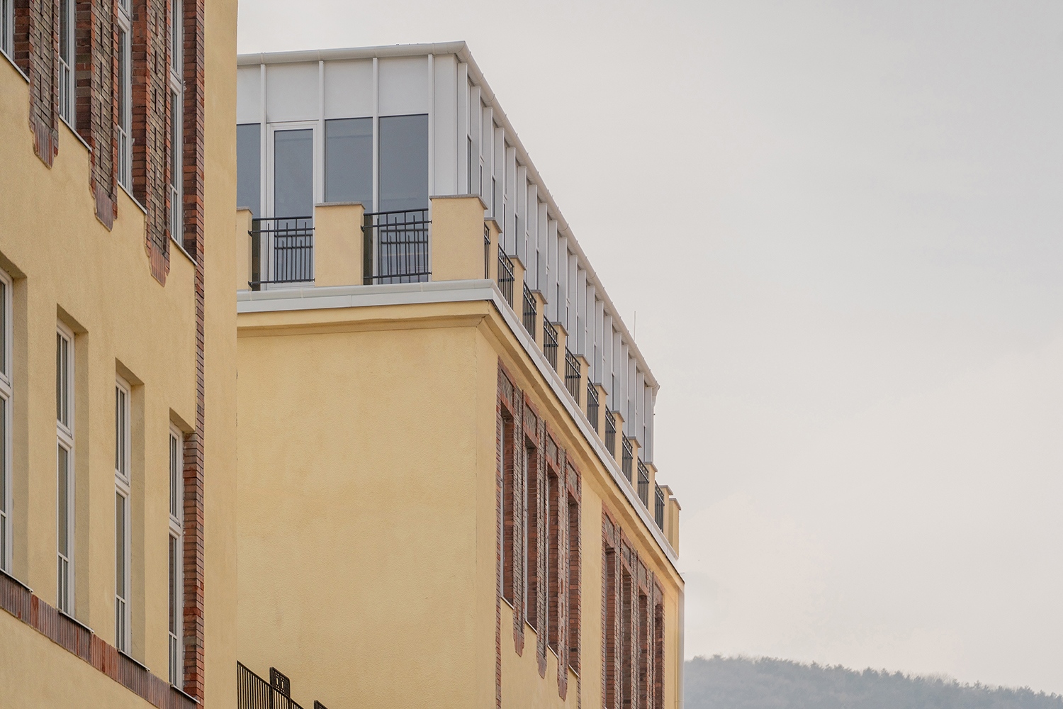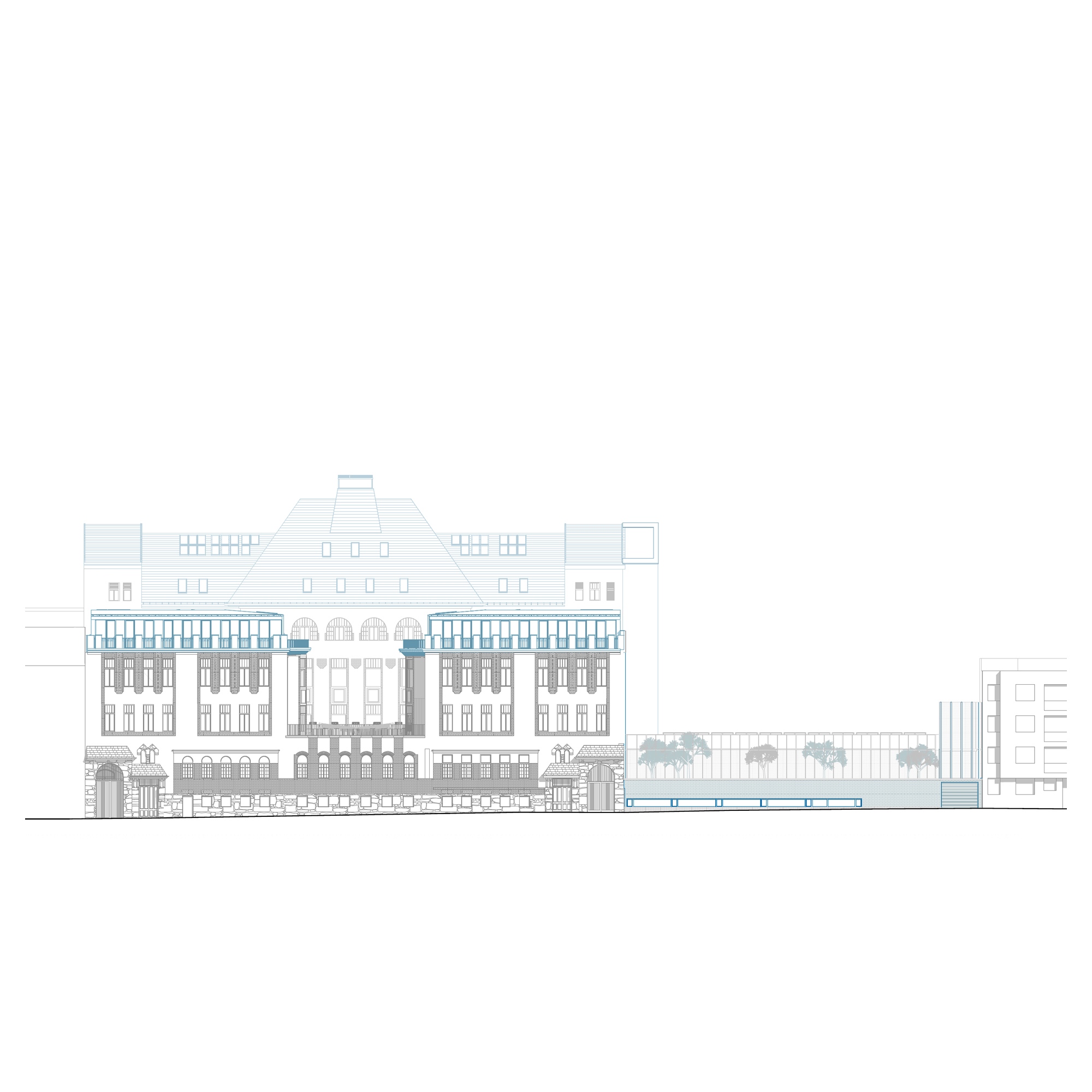 Az aula előtti ütem hozta a legnagyobb térbővülést: az épület két oldalsó, lapostetős szárnyán egy új szint készült el. Két, könnyű acélszerkezetű, üvegfalú, tökéletesen szimmetrikus ráépítés, amely lamella-osztásával az utcai, téglabetétes vakolt homlokzat ritmusát viszi tovább. Színében azonban elkülönül attól: fehér, szinte áttetszően könnyed, szolidan visszahúzódva az egykori tetőpárkány oszlopai és korlátjai mögött. Kívülről finom, szinte súlytalan kiegészítés, semmi dísz, csak egyszerű geometria; belül pedig az üvegfalaknak köszönhetően fénnyel teli, nyüzsgő, szerethető terek sora, laborok, fejlesztő- és tantermek, teakonyhával és szekrényekkel ellátott közösségi terek. Alacsony hajlású tetőzetét napelemek foglalják el.