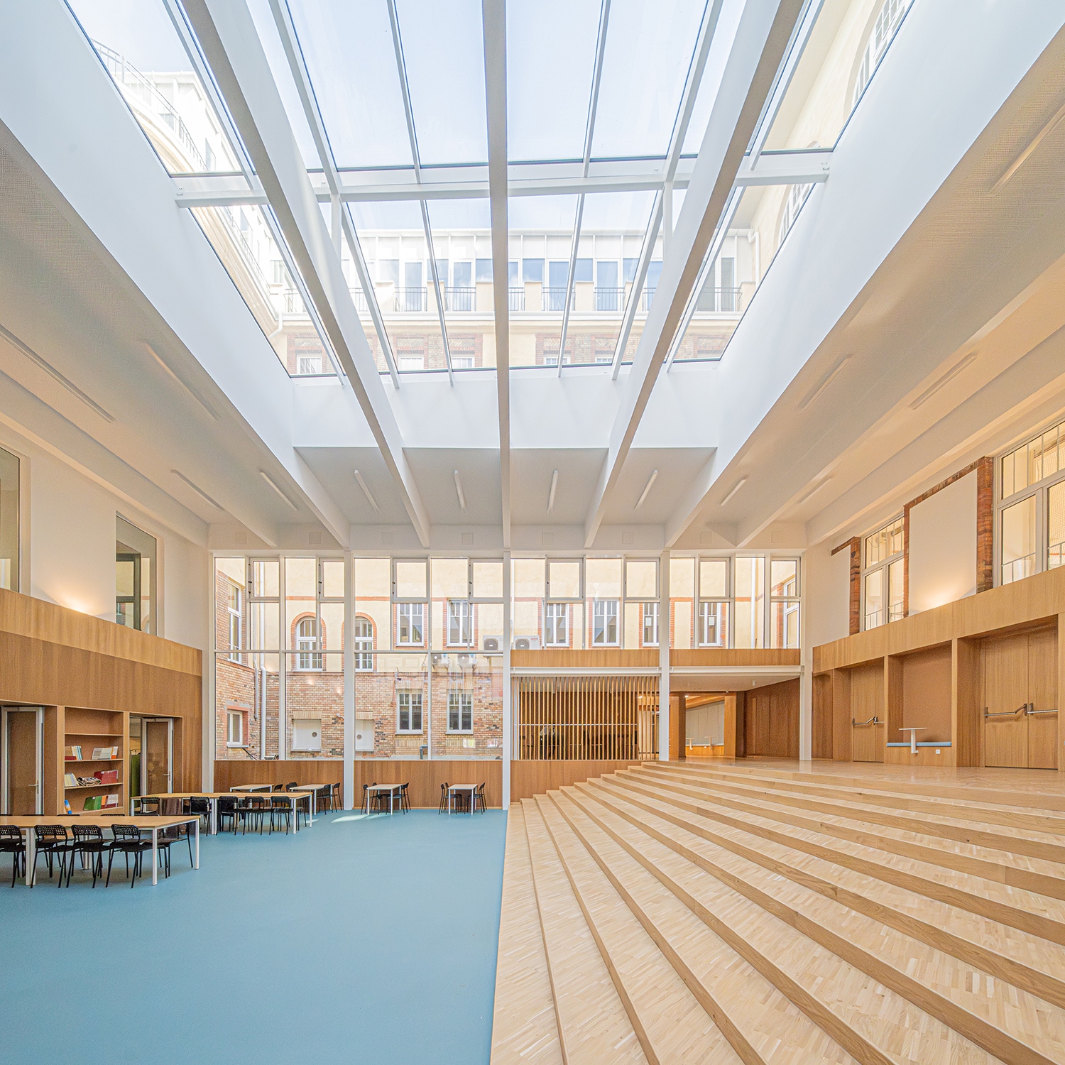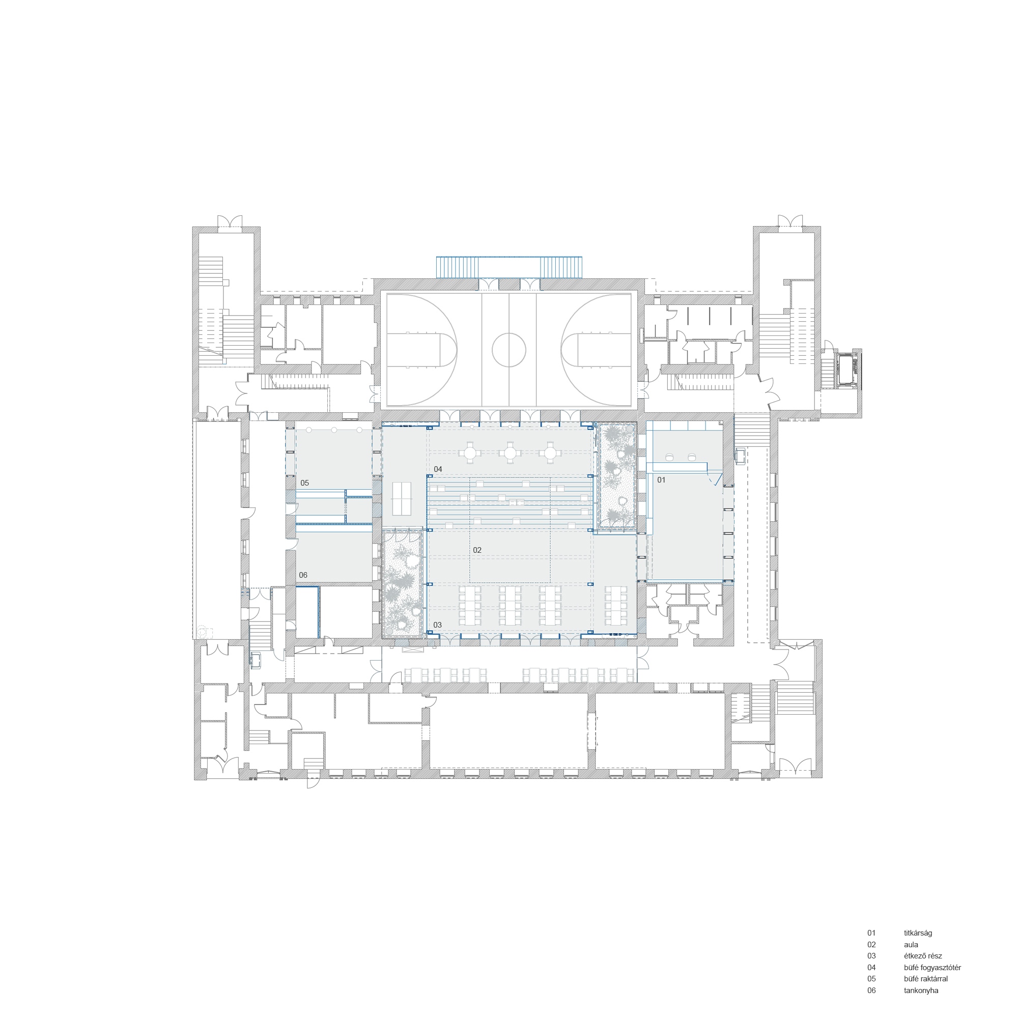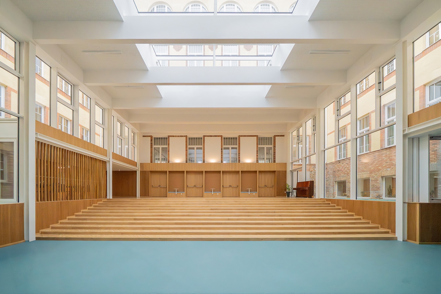 Az átalakítás talán legfontosabb elemei a 2. és 3. ütemben, 2024-2025 folyamán készültek el. Ezek során a középső, körbezárt udvarba egy, a belső oldalhomlokzatoktól tűzvédelmi és szellőztetési okokból kissé eltartott, felül üvegtetővel megvilágított, tágas aula jött létre, amely alkalmas arra, hogy az épületben tanuló összes gyereknek akár egyszerre közös teret adjon. Az aula két szintet hidal át: az eredeti mélyföldszint utcai traktusában megmaradt a konyha, ebédlő és az azokat kiszolgáló helyiségsor, melyek áttörésekkel és az aula teljes szélességében kialakított, faburkolatú lépcsősorral kapcsolódnak az egykori magasföldszinthez.