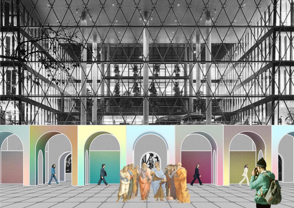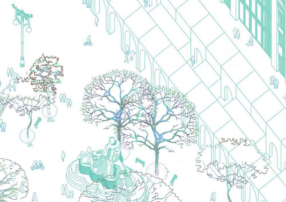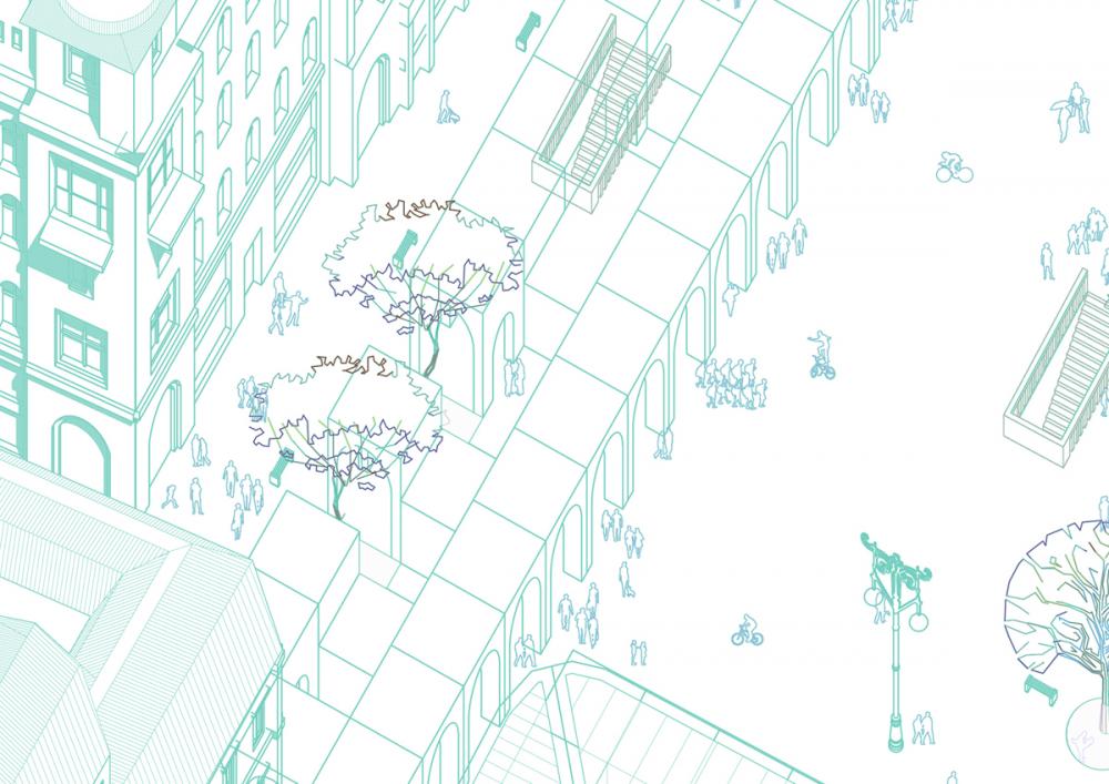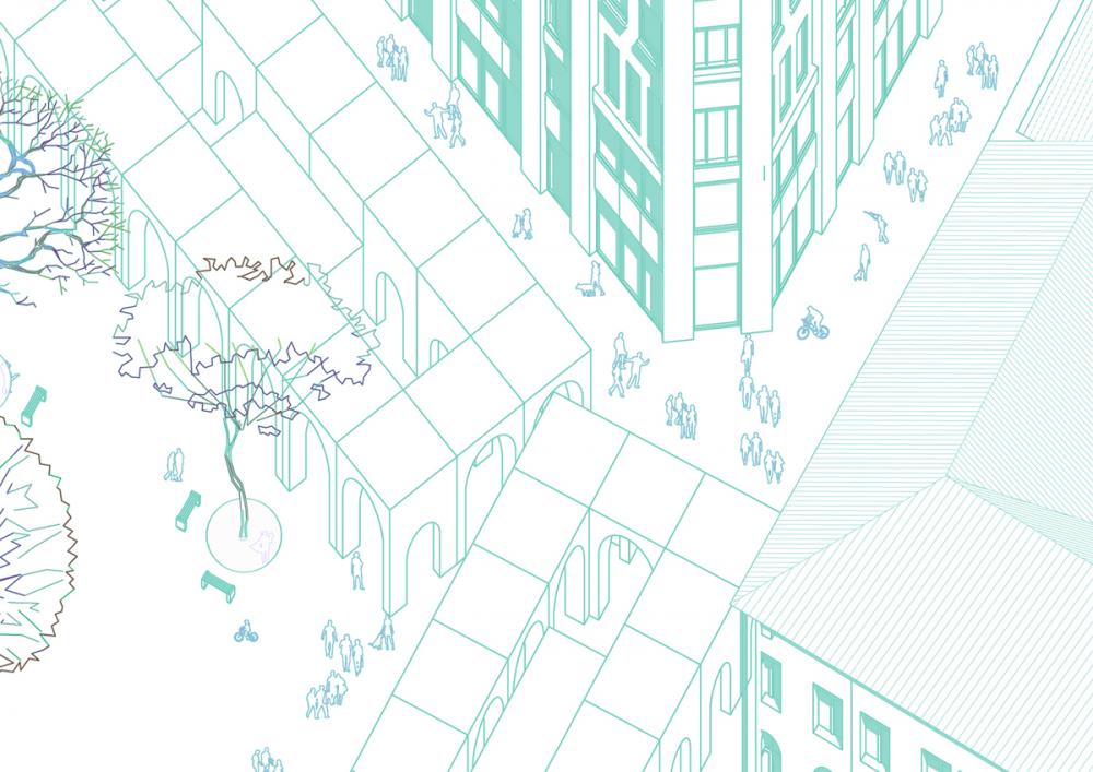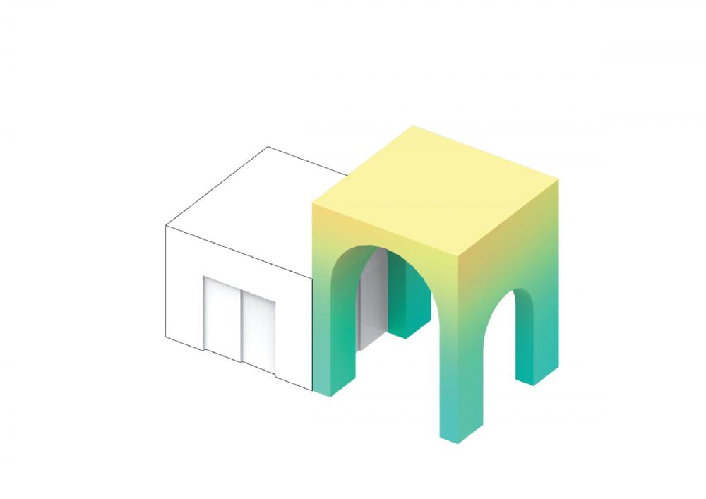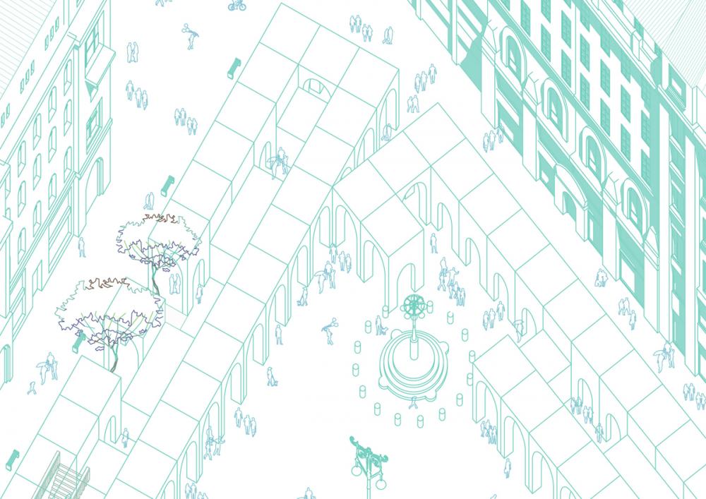 Az építészeti alapelem egy klasszikus primer térforma – a dongaboltozat, amely mátrixba állítva számos struktúrát képes alkotni; az egyoldalú árkádtól a keretes piazzán keresztül a paloták és vásárcsarnokok térbeli rendjéig. Ezek a térsorok a városi események narratívájának hátterei és aktív formálói is egyben.