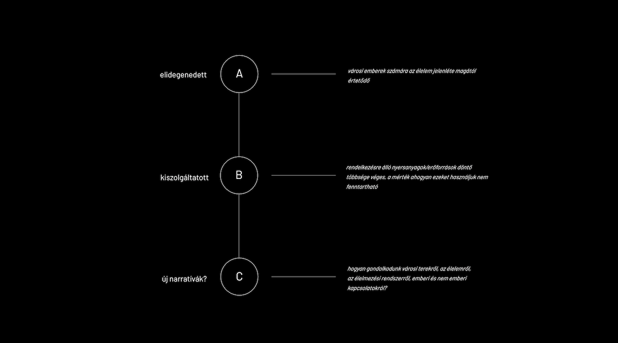 A problémafelvetésem az volt, hogy a városi emberek számára az élelmezési és termelési folyamatok rendkívül idegenek, az élelem jelenléte a városokban magától értetődő, a hiány fogalmával nem tudunk mit kezdeni. A tervem célja az, hogy az élelmezési rendszer egyes lépéseit és feltételeit szemléltesse. Ezalatt az eredet, a termelés, a feldolgozás, a fogyasztás és hulladékgazdálkodás egyes folyamatait és tereit értem. Ez az igény egy oktatási és lakhatási programmal egészül ki. Továbbá a terv alapállítása az, hogy az egyes épületekről és városi terekről ne csak téri viszonylatokban gondolkozzunk, hanem működési (materiális és immateriális) összefüggésekben is.