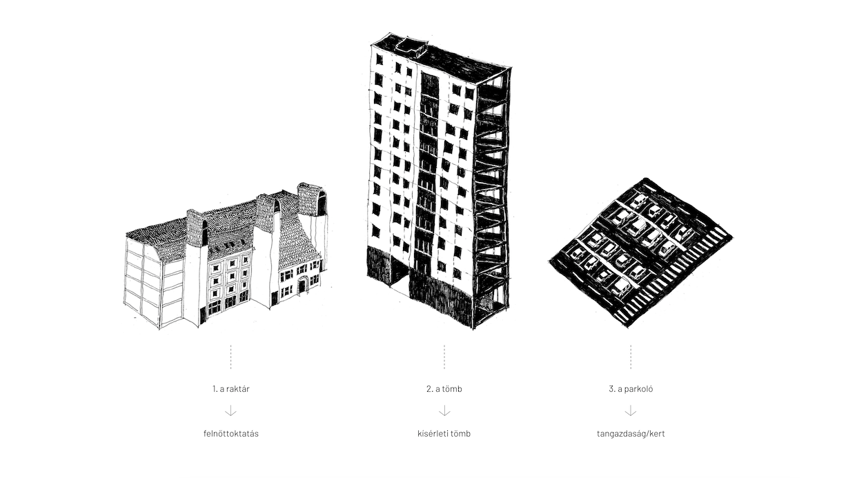 Magház: A panelek által körbezárva áll egy régi gyárépület. 1912-ben építették, eredetileg karosszéria, majd bútorgyárként funkcionált. A hetvenes években építették át a Budapesti Fővárosi Levéltár számára, mely jelenleg raktárként használja azt. A különös torzó egyszerre tanúja a józsefvárosi szanálásnak és lenyomata a különböző korok építészeti belenyúlásainak. Ebbe az épületbe helyeztem az oktatási és lakhatási funkcióimat. Oktatás alatt egyrészt értek civil edukációt, valamint egy speciális agrártudományi szakképzést is. A földszinten a köz számára is nyitott funkciók kapnak helyet, ahol a fogyasztás és feldolgozás egyes folyamatai zajlanak. Fentebb kutató, oktató és irodahelységek találhatóak. A harmadik emeletre kollégiumi szobákat terveztem, a kertet fenntartó és az oktatási programban résztvevő közösség számára. A tetőn található üvegházakba kutató jellegű termelés folyik. Az épület struktúrájába való beavatkozásaimra a bontás és a belsőépítészeti átalakítás jellemző. Az épület eredeti, vasbeton pillérvázas szerkezetét szerettem volna az új téri helyzetekkel kiemelni. Az eredeti struktúrától és anyaghasználattól az üvegház és az újonnan emelt közlekedőmag különül el. Mindkettő acélvázas, polikarbonáttal burkolt könnyed szerkezet. Utóbbi dimenzióiban ugyan hajaz a mellette álló lift tornyokra, de légiességével el is különül azoktól. Az épület energetikáján külső oldali hőszigeteléssel és új nyilászárókkal javítanék.