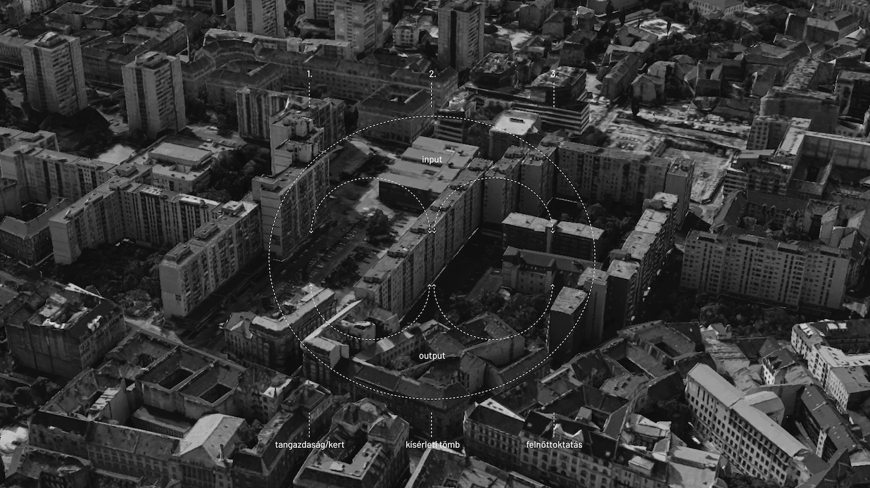 Kísérleti tömb: Építészetileg az előbb már említett panelépület földszintjével és tetejével foglalkoztam. Az volt a mondásom, hogy itt a lakásokkal nem foglalkozom, csak a földszinti és tetőtéri, nem használt tereket nyitom meg és javaslok számukra új használatokat. Az épület tájolása kedvező arra (É-D), hogy a tetőn kialakított üvegházak egy részére napelemeket lehessen telepíteni, a régóta nem használt gépházakba pedig akkumulátorokat helyezni. Így lépcsőházanként egy-egy energiaközösség alakul ki. Ugyanez a tetőfelület esővízgyűjtőként is funkcionál, melynek vizét a földszinten található kert locsolásánál lehet újrahasználni.