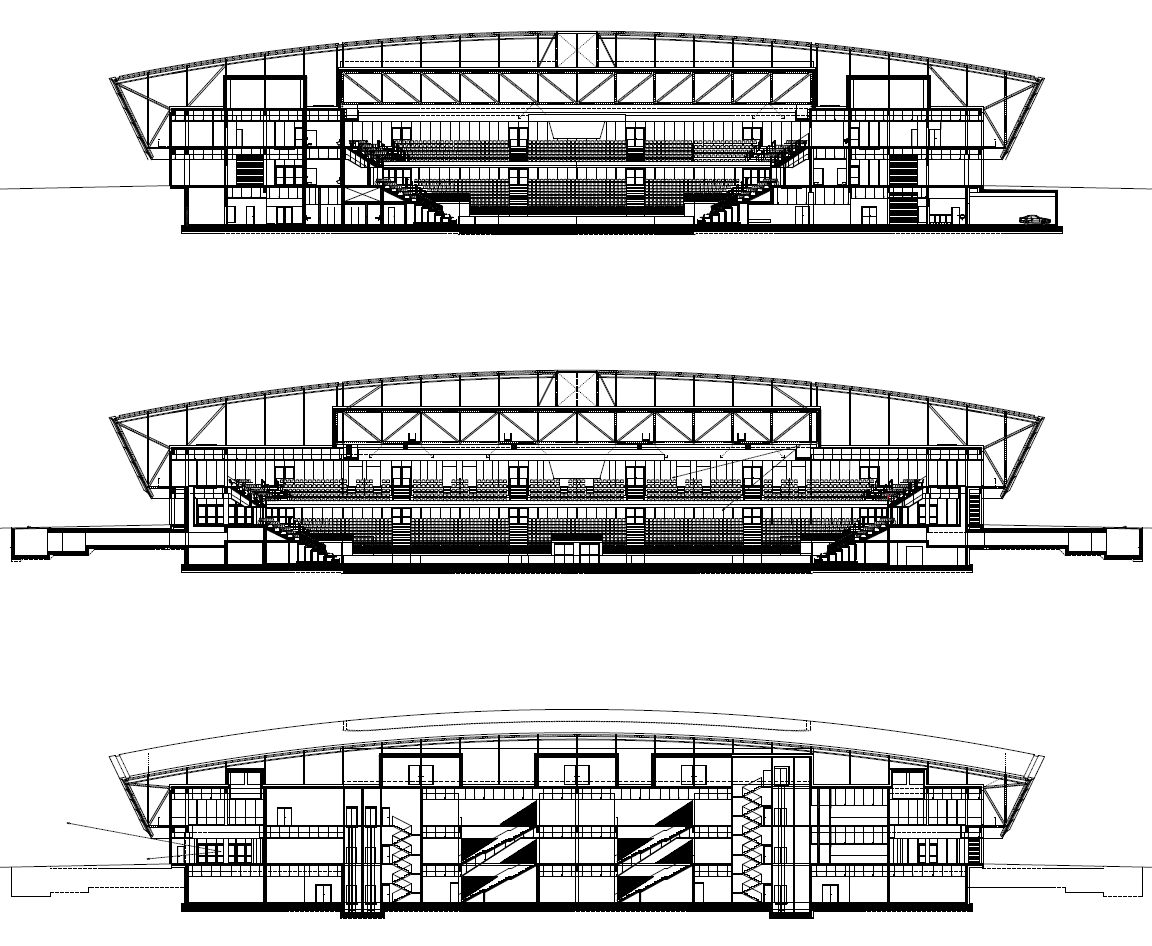 A drónképeken jól látszik, hogy az épület lekerekített sarkú, négyzetes alaprajzra rászerkesztett alapforma, erre borul rá az említett íves acél tetőszerkezet, ami a széleken lefordul és felnyílik. A kifelé döntött, dinamikusan komponált sávokból álló felület építészeti értelemben a tető lehajló része, de megélésében más, hiszen oldalról határolja az épületet. Hullámzó karakterével egyértelműen a „lehajló” tetőé a főszólam – súrolt, színes megvilágítása este messziről is mágnesként vonzza a tekintetet. Komplikált biomorf tervezés eredményének gondolhatnánk ezt a tetőt, pedig geometrikus szerkesztése egyszerűbb: egy 300 méter sugarú gömbszeletnek és a kifelé döntött homlokzati síknak a metsződéséből adódik. Az összhatás mozgalmas és légies, amit a lyukasztott fémlamellák közti átlátás fokoz. Ezek a lamellák olyanok, mintha valaki a sarkokon szalagokat fogna össze, amelyek a két fogási pont között szétnyílnak, kidagadnak, mint egy vitorla.