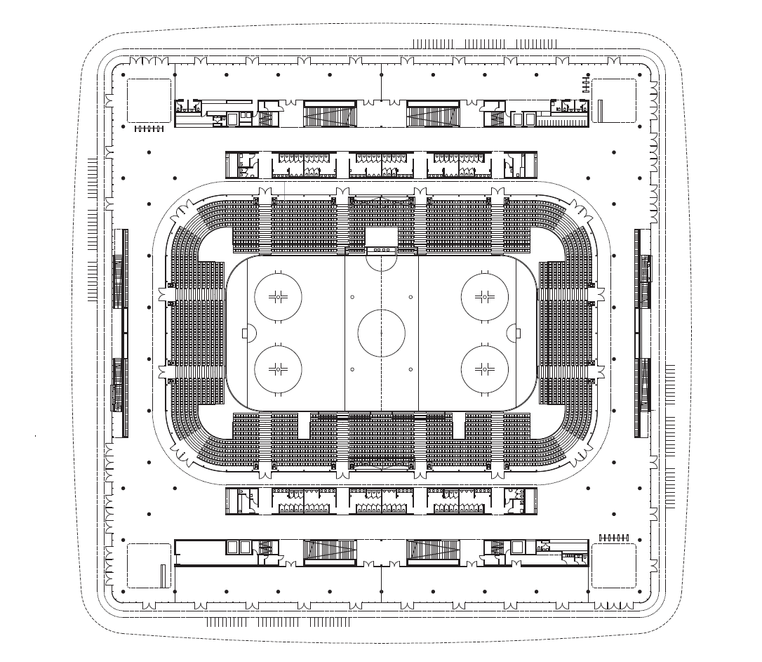 A lamellák sűrűsödése különös vizuális hangsúlyt ad a sarkoknak és ennek használati oka is van: a bejáratok onnan nyílnak, nem a homlokzatok közepéről. Szokatlan megoldás, a dinamika része. A sarkok négy különböző látogatócsoportot fogadnak, így a hazai sportklub és a vendégcsapat szurkolótábora átlósan szemben találhatók, az épület másik két ellentétes sarkán a VIP bejárat és a sportolói bejárat található.