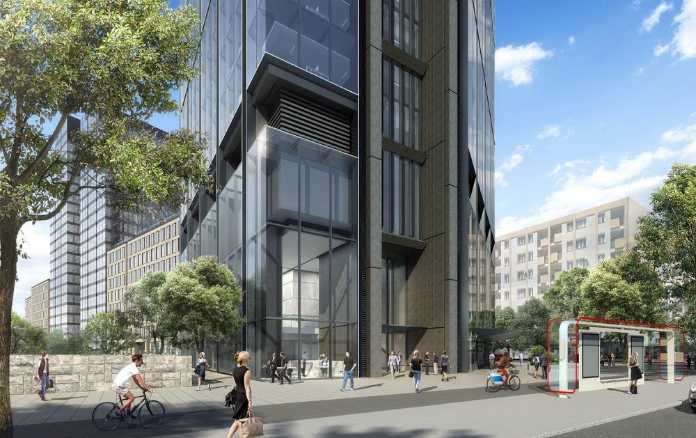 Az épületegyüttesben a két alacsonyabb, irodafunkcióval és szolgáltató egységekkel ellátott épület mellett helyet kap egy 53 emeletes irodatorony