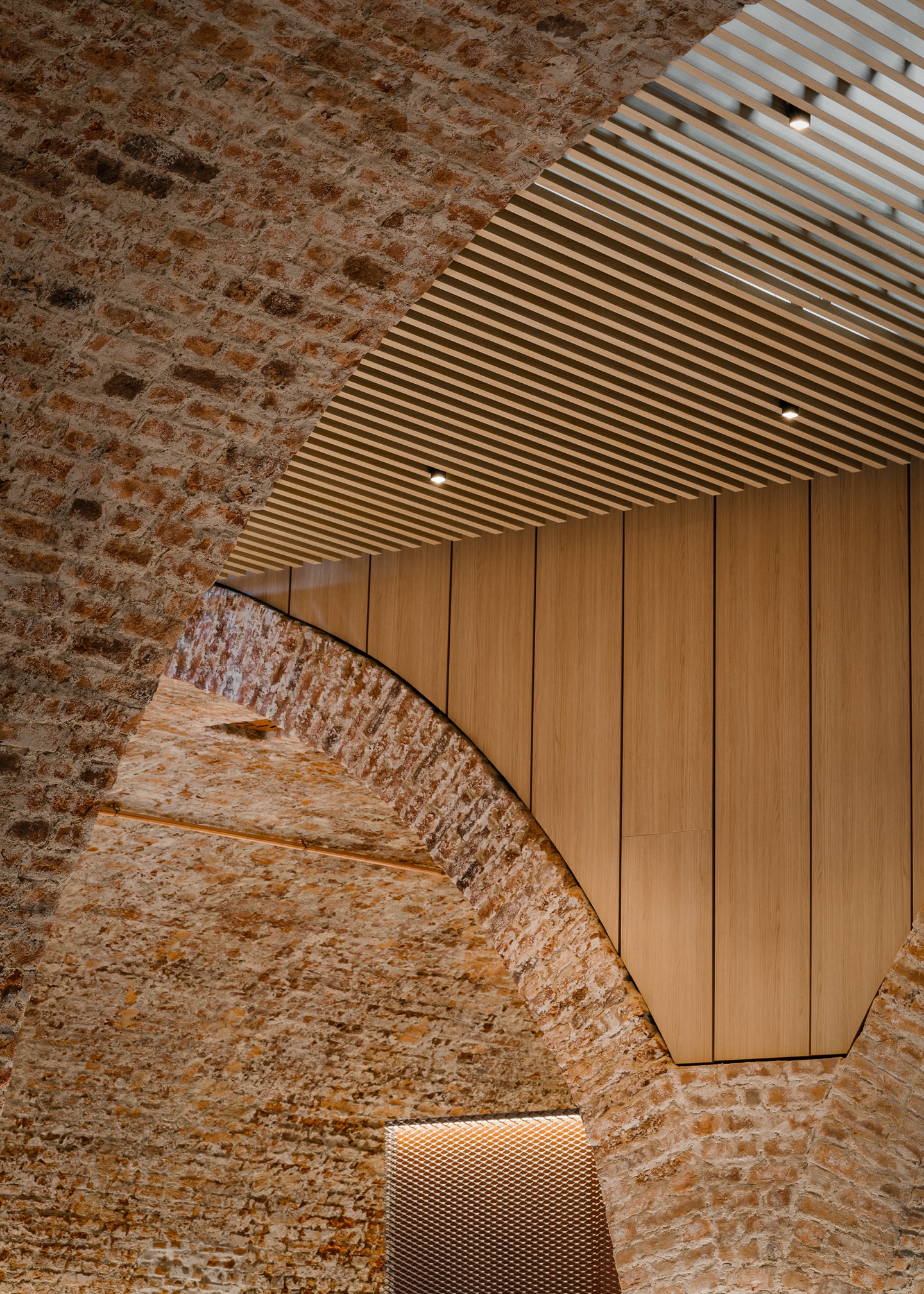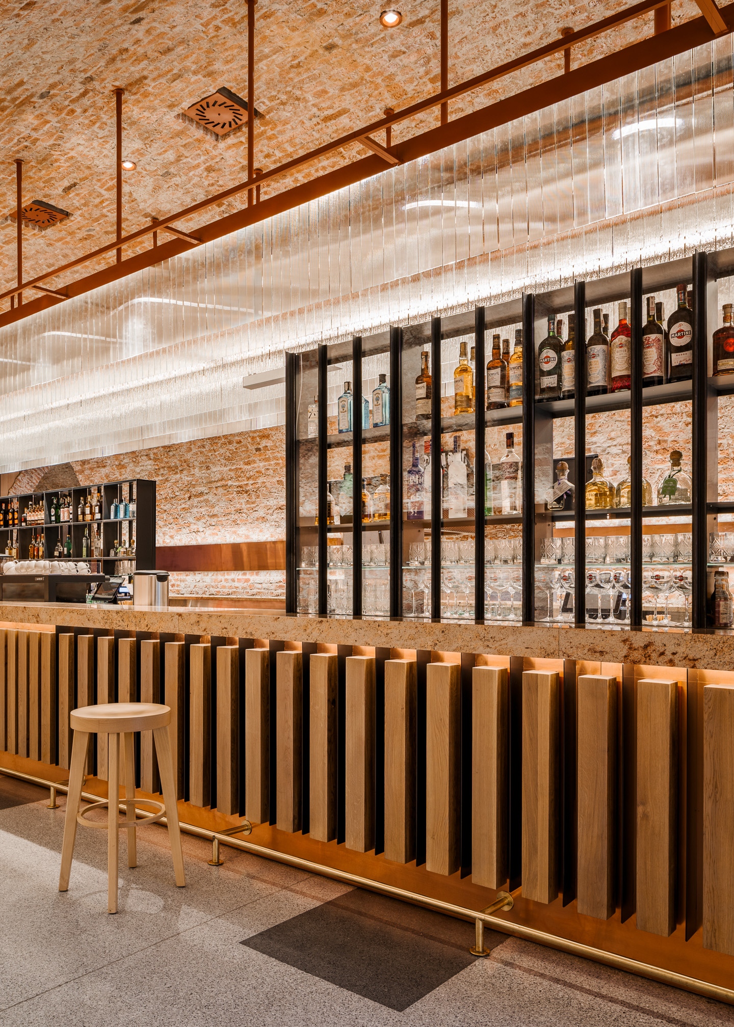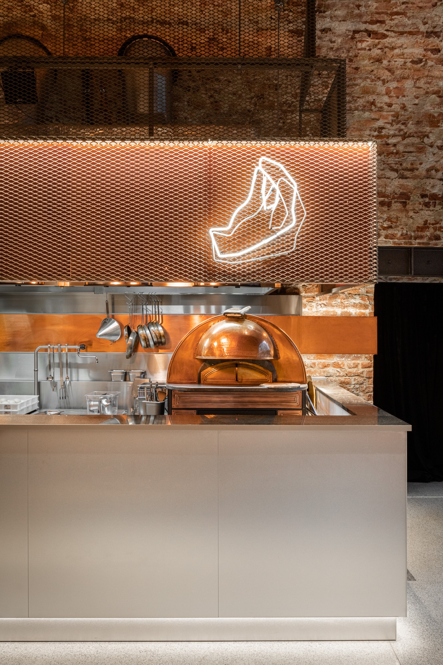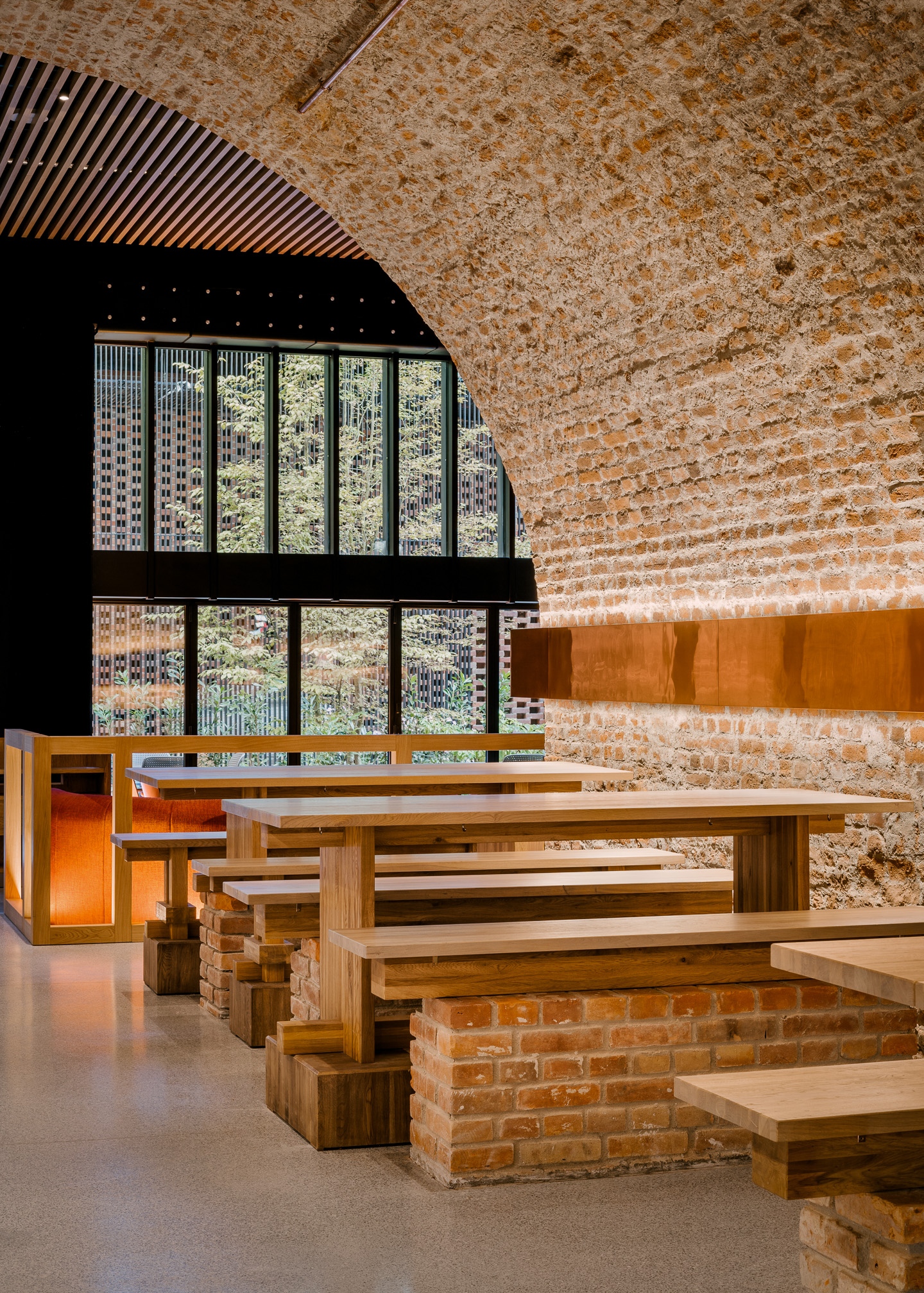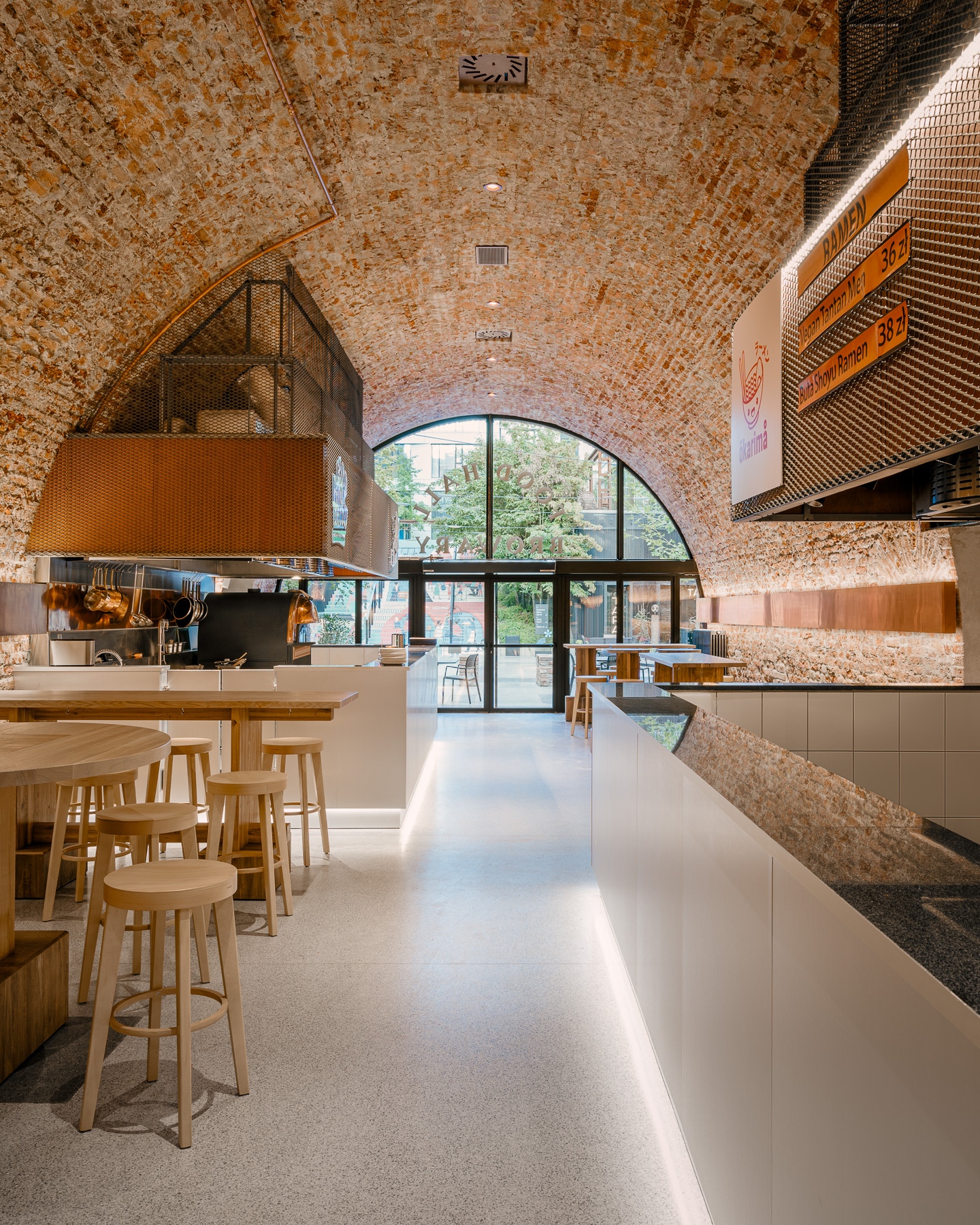 A tervezők a projekttel túl szerettek volna nőni a hasonló, városi udvarokra telepített sokszínű étterem- és ételkínálaton alapuló létesítményeken. „Előnyben részesítettük a koherenciát, a következetességet és az eredeti, egyszerű designt, nehogy túlgondoljuk a munkát, vagy esetleg stilisztikai kakofóniát teremtsünk” – meséli Piotr Maciaszek, a NOKE társalapító építésze. Az egykori pince három nagy, gyönyörű téglaboltozata alatt 11 ipari, rozsdamentes acélpultnál készítik a nemzetközi séfek illatos ételeit.