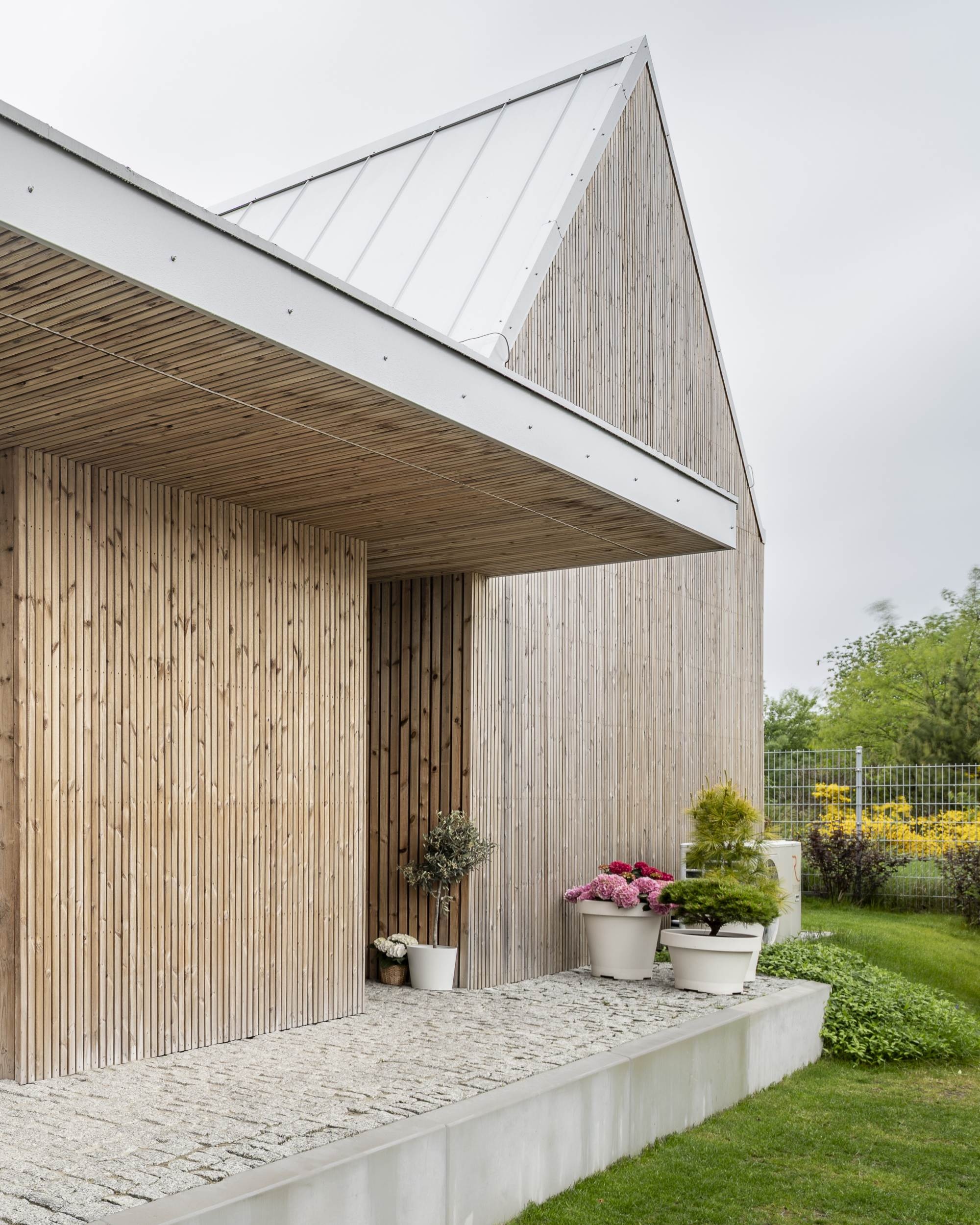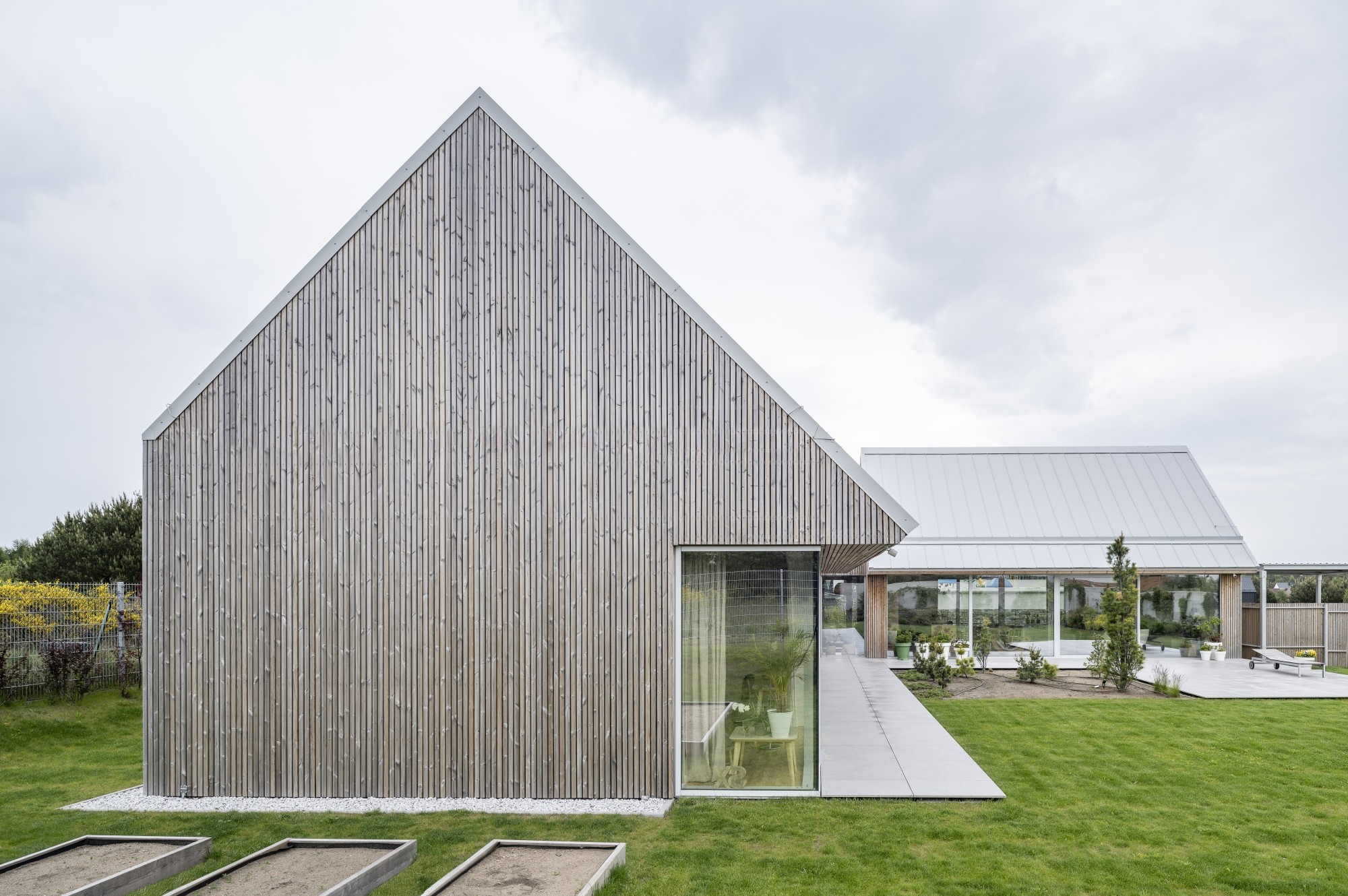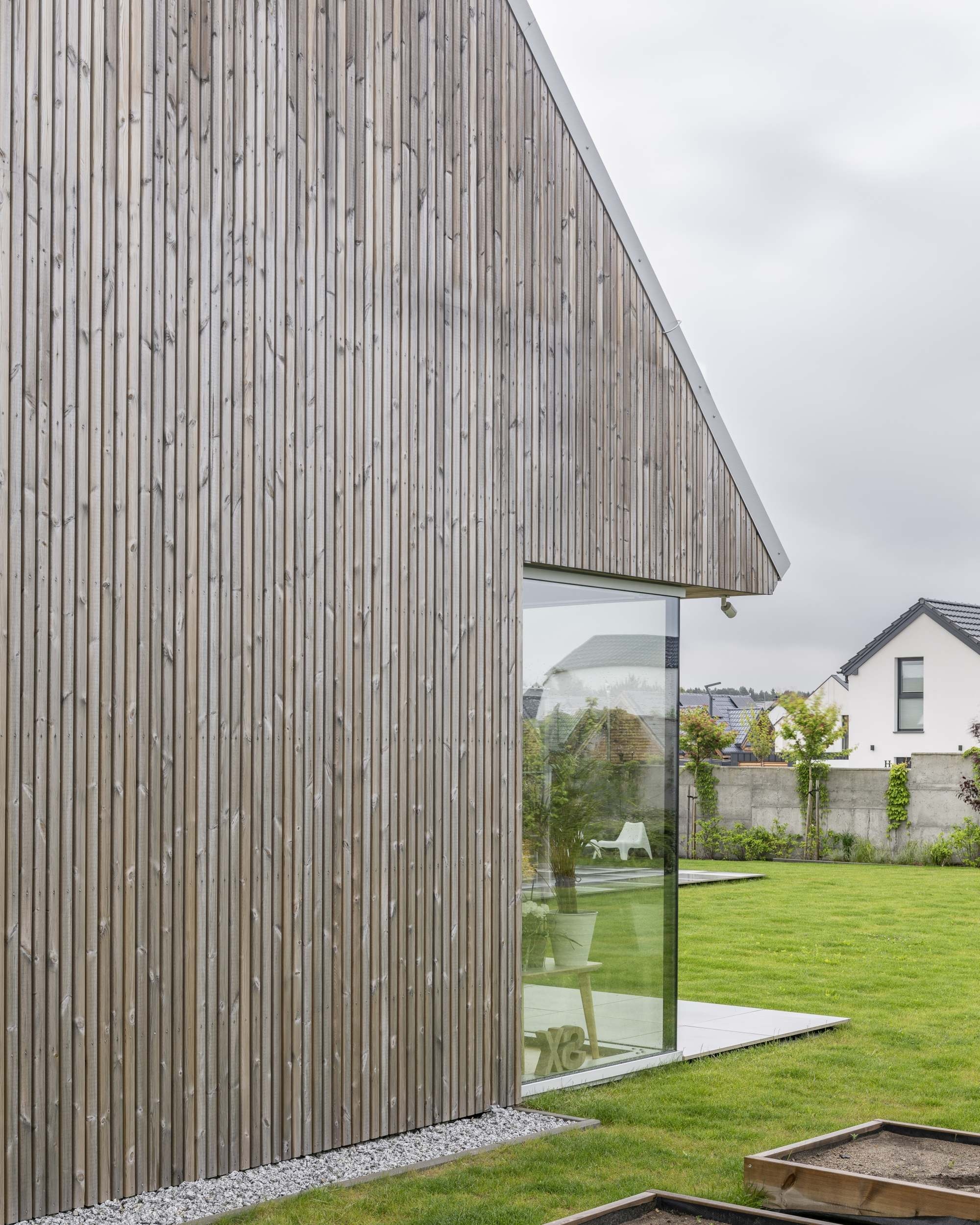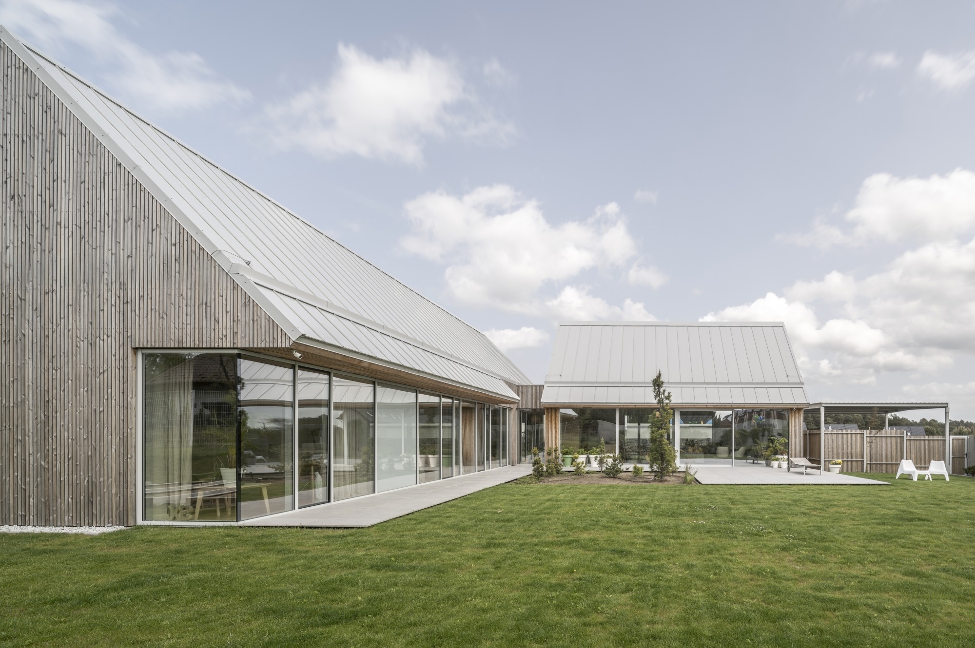 A ház egy pajta archetípusára utal, formája pedig kortárs, mért sziluetté finomodott. A homlokzatokat függőlegesen elhelyezett lucfenyő burkolat borítja, amely az idő múlásával természetesen öregszik, míg a világosszürke fémből készült iker tető a balti tenger horizontjának színeit idézi. A geometria tisztasága a hagyomány és a visszafogottság gondos egyensúlyát tükrözi.
