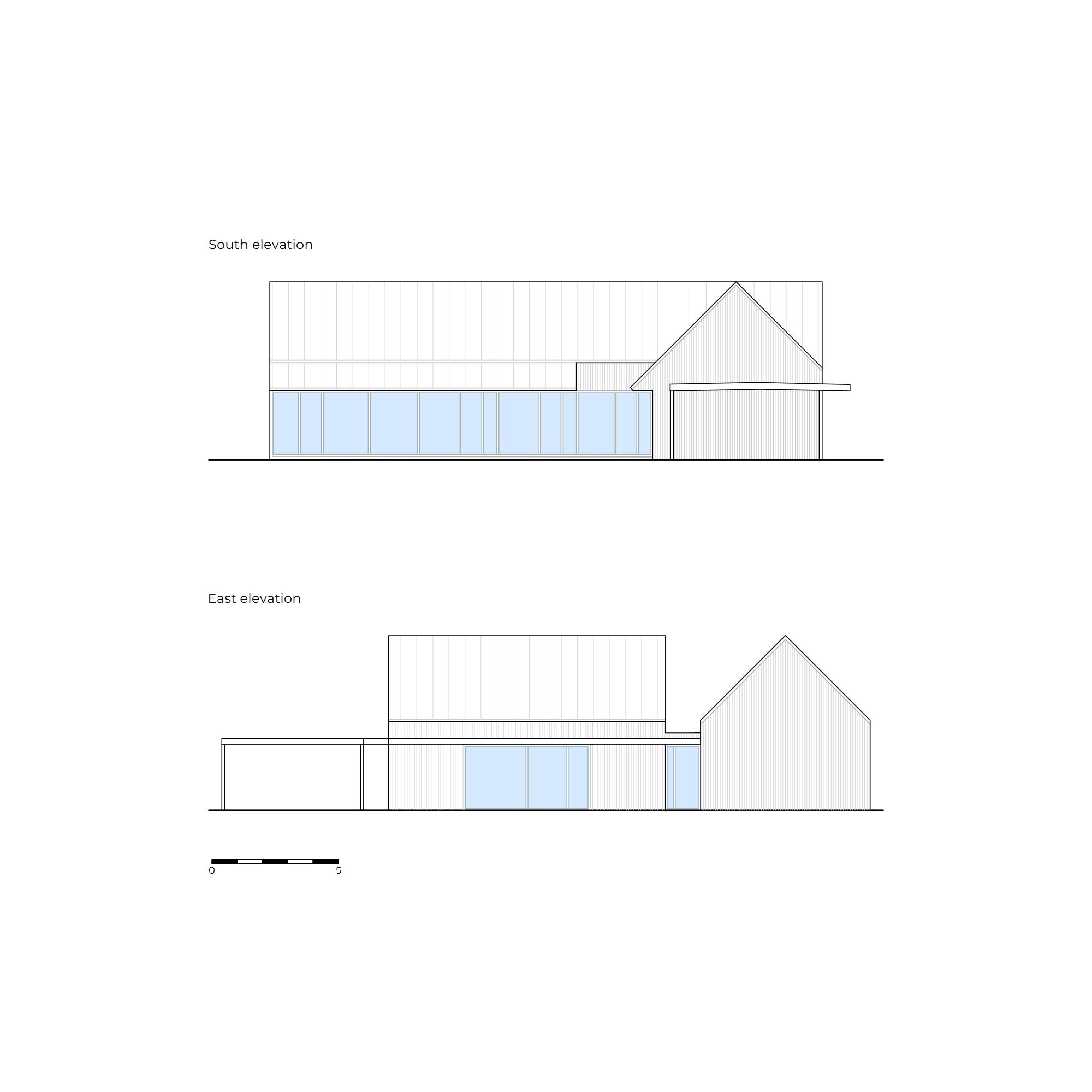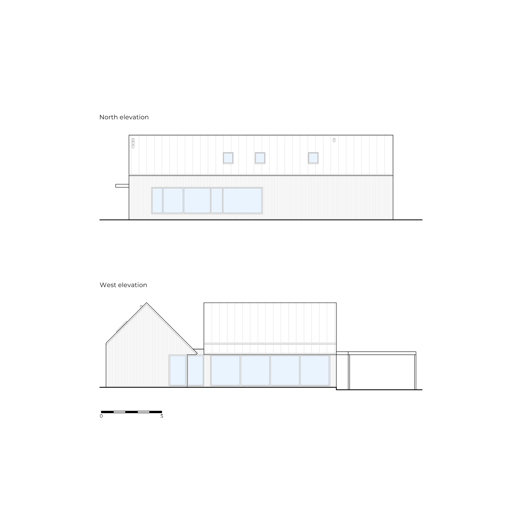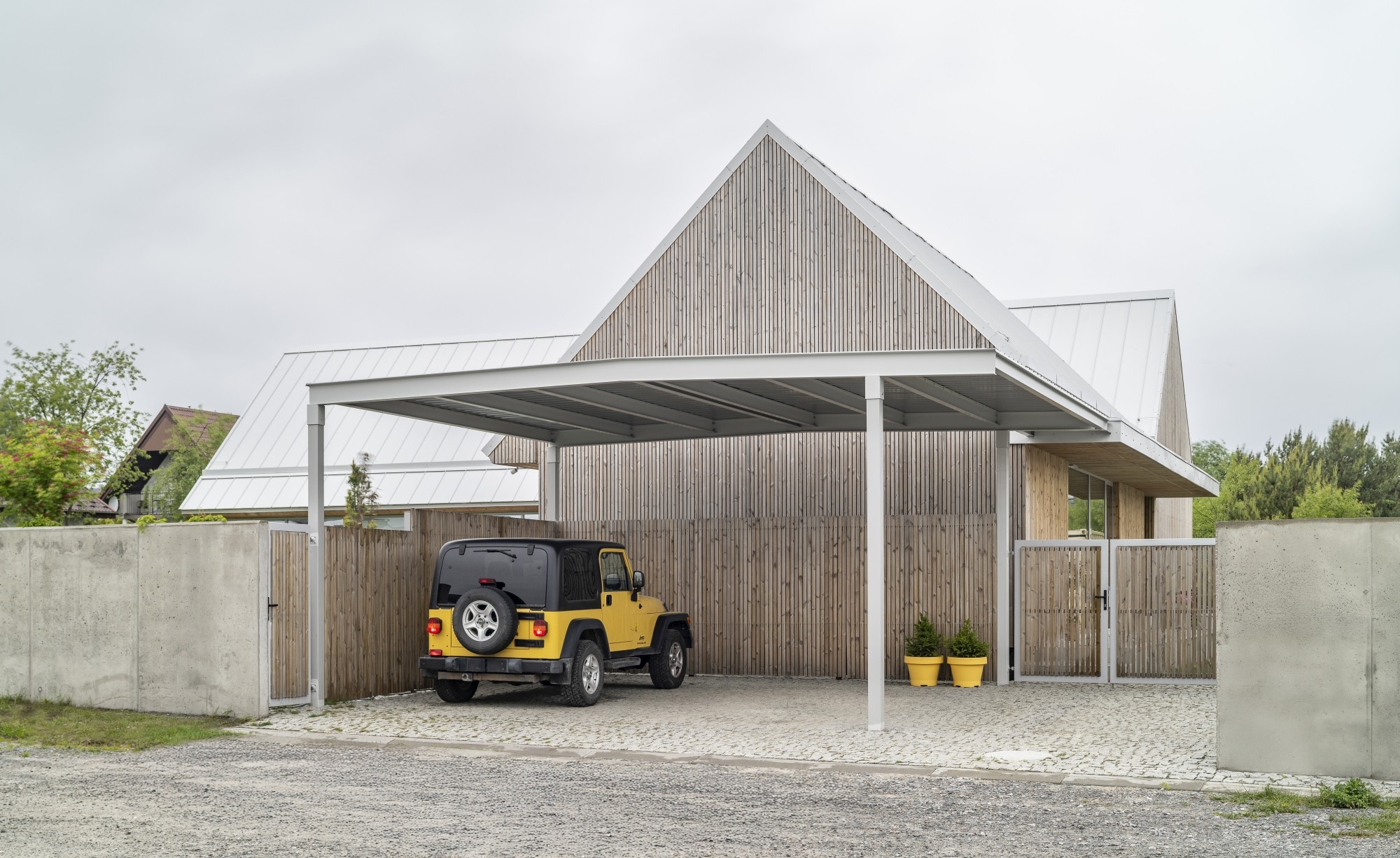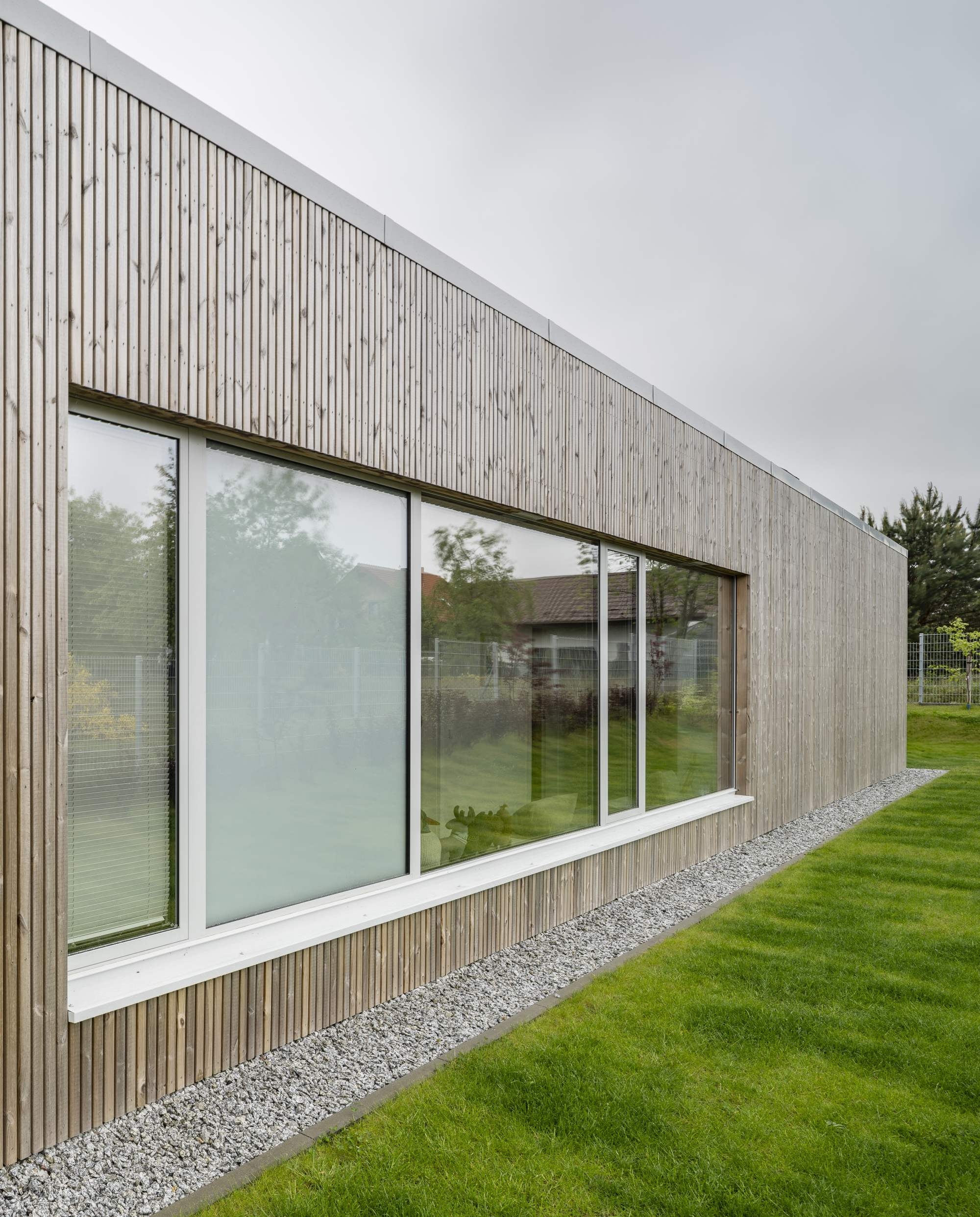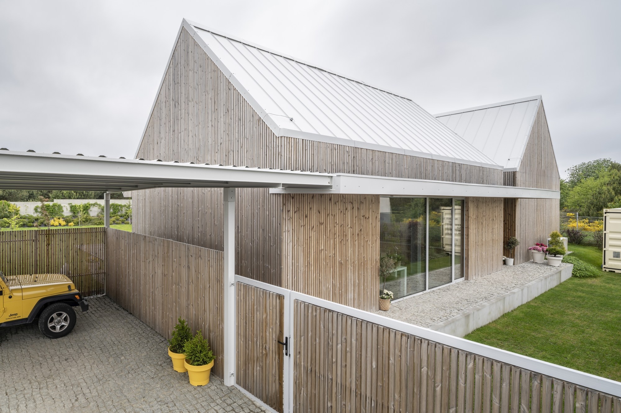 A ház egy pajta archetípusára utal, formája pedig kortárs, mért sziluetté finomodott. A homlokzatokat függőlegesen elhelyezett lucfenyő burkolat borítja, amely az idő múlásával természetesen öregszik, míg a világosszürke fémből készült iker tető a balti tenger horizontjának színeit idézi. A geometria tisztasága a hagyomány és a visszafogottság gondos egyensúlyát tükrözi.