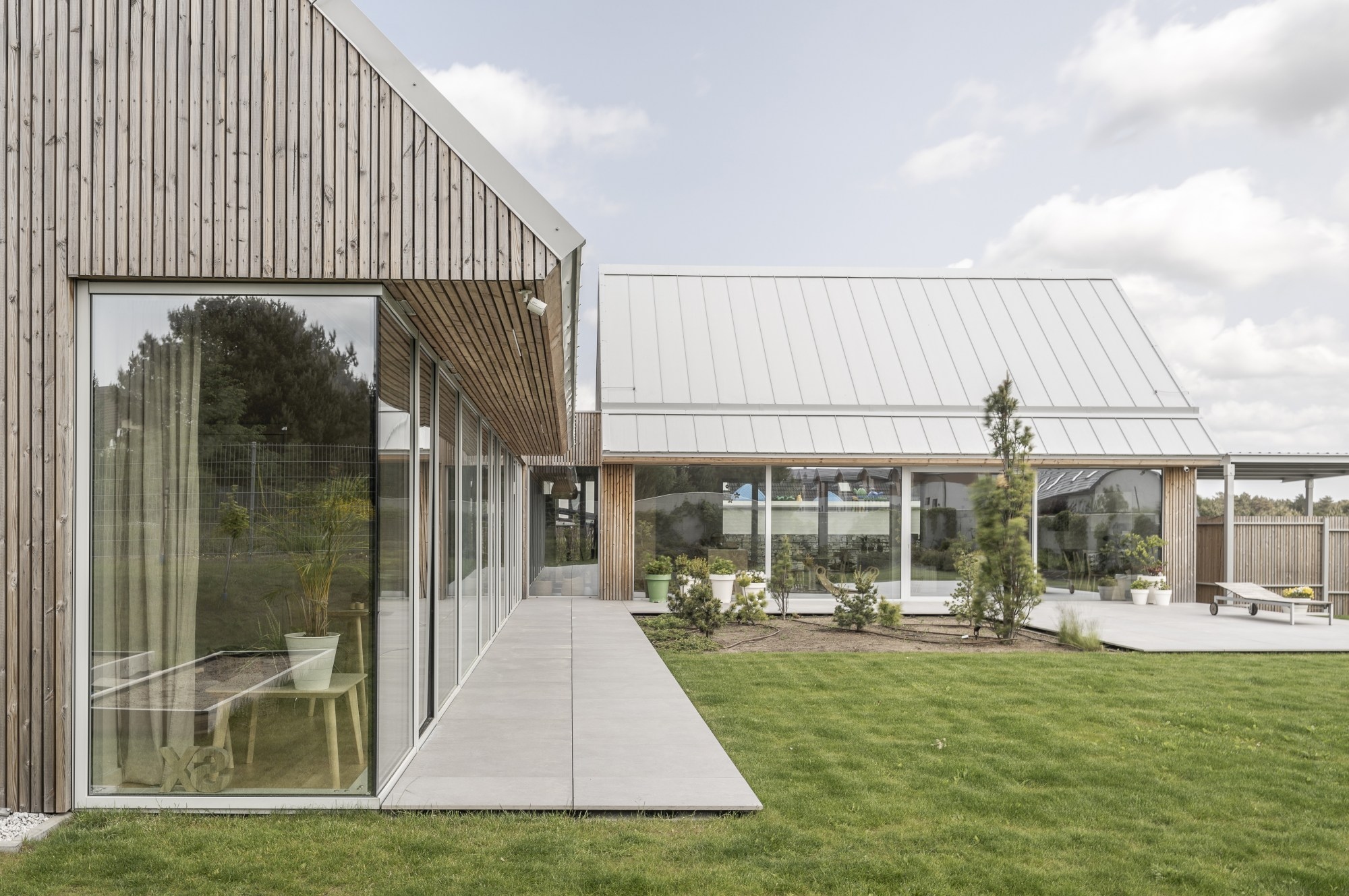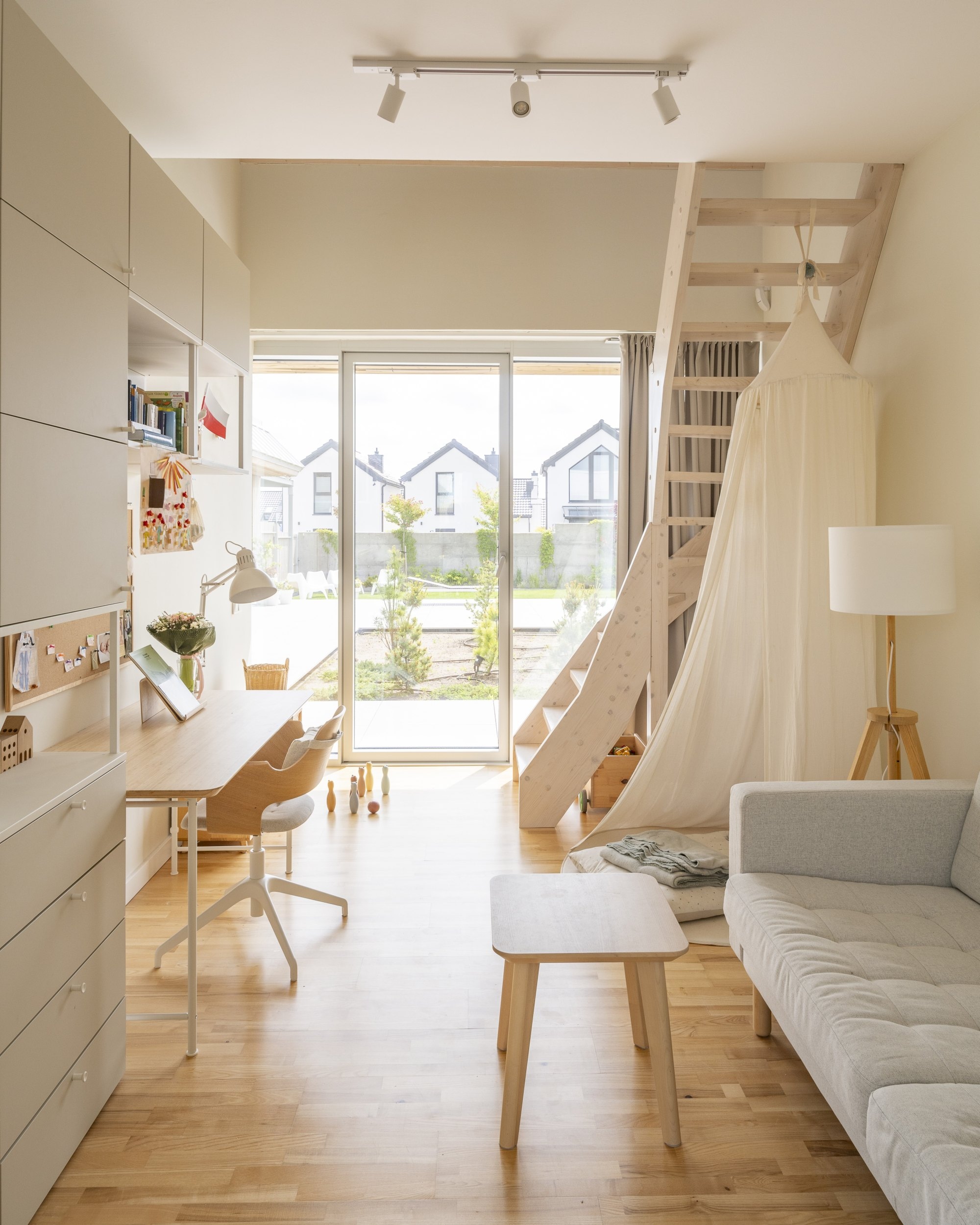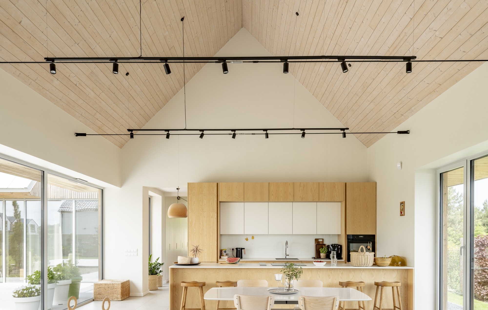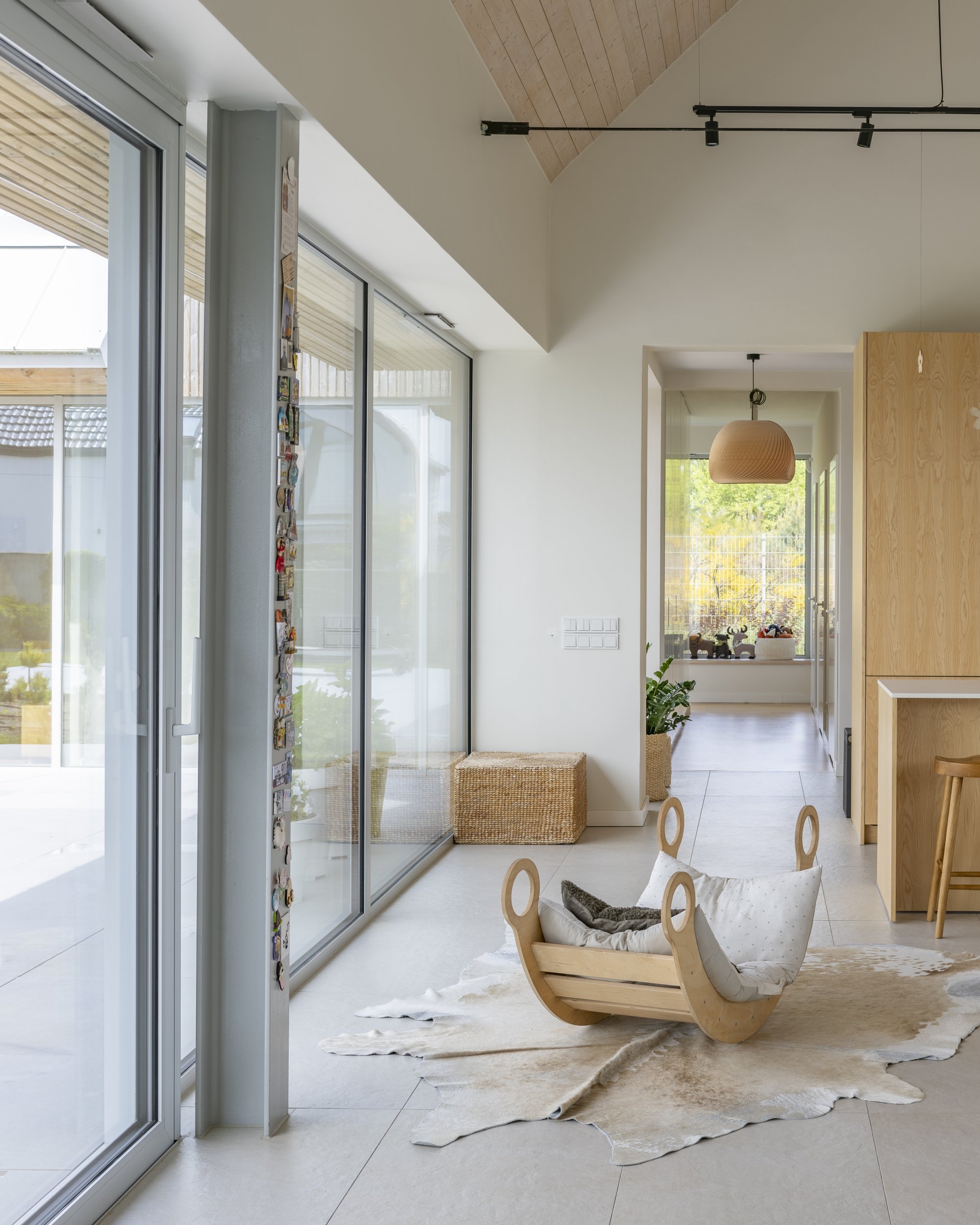 Középpontjában egy tágas, nyitott mennyezetű szoba található, amely a konyhát, az étkezőt és a nappalit ötvözi. Ez a család mindennapi életének találkozási pontja – egy világos és magas tér, amely elősegíti az összetartozást. A második szárnyban a gyermekek szobái találhatók, amelyek egymás után vannak elrendezve, és a tető alatt kompakt mezzanine szintekkel vannak kibővítve, így játékos privát zónákká alakulnak. A fő hálószoba szintén nyitott mennyezettel rendelkezik, ami növeli a levegő és a fény mennyiségét.