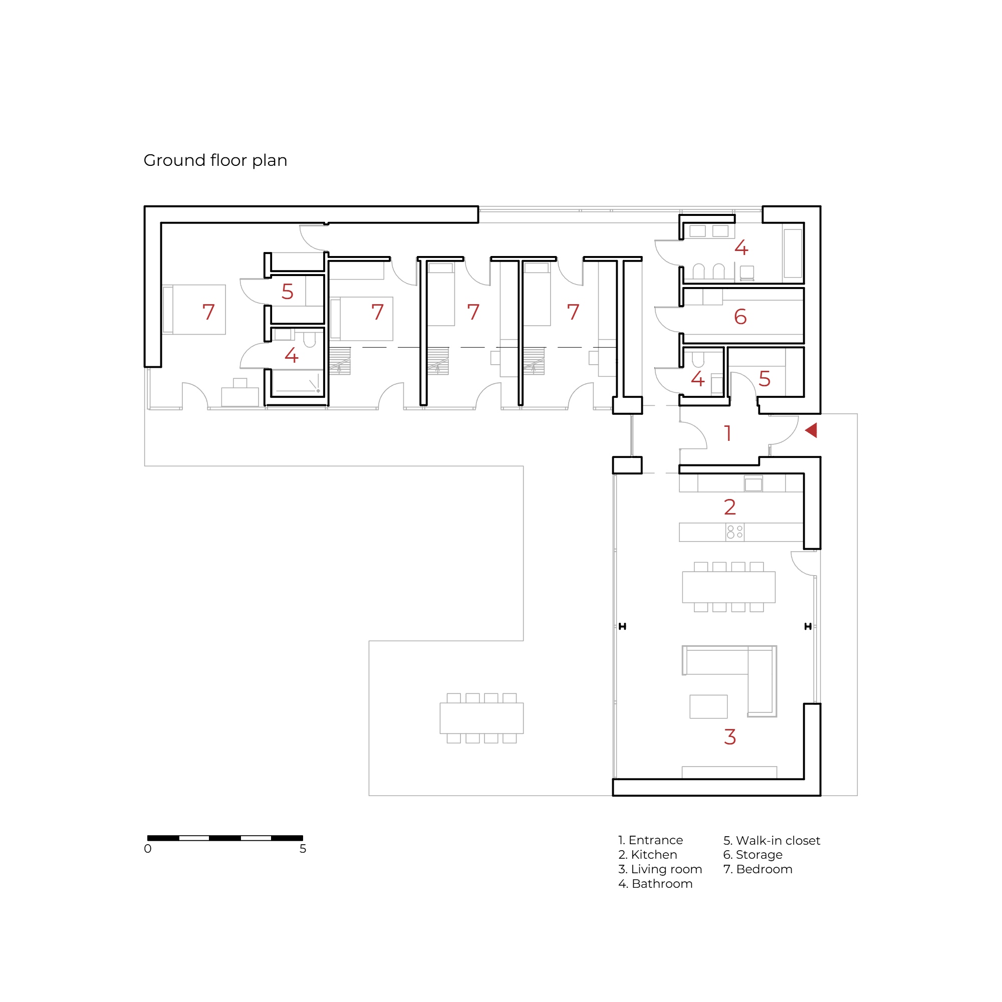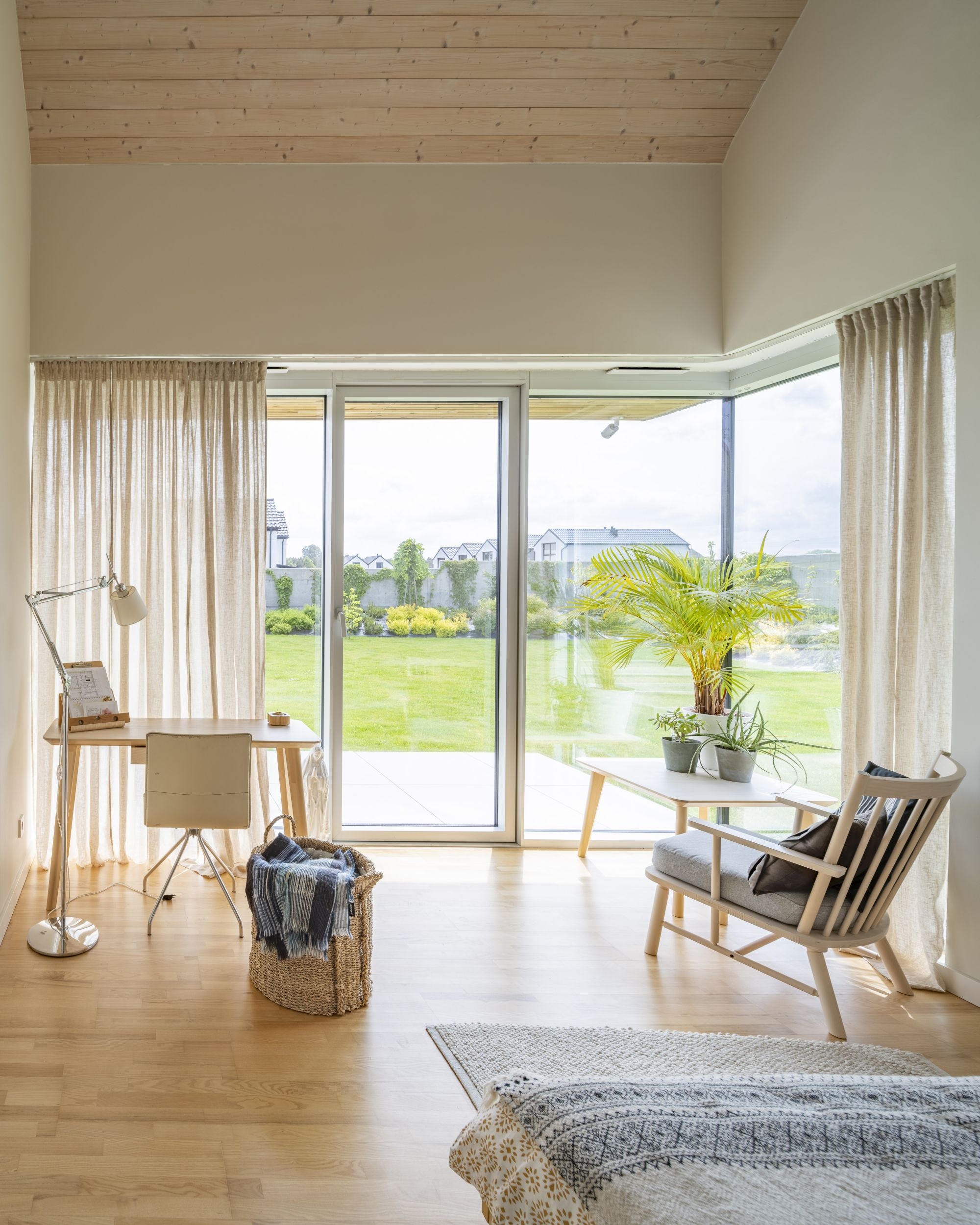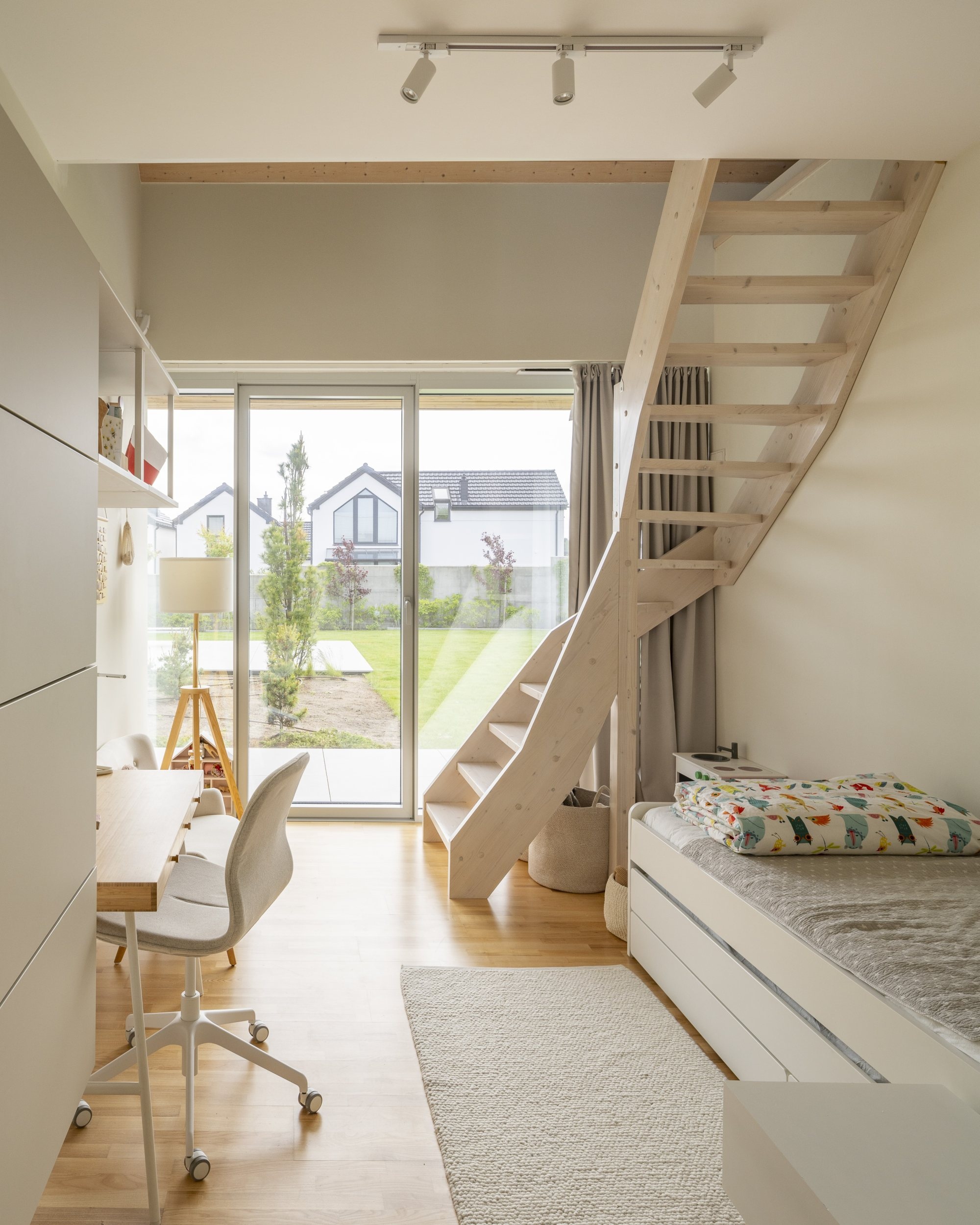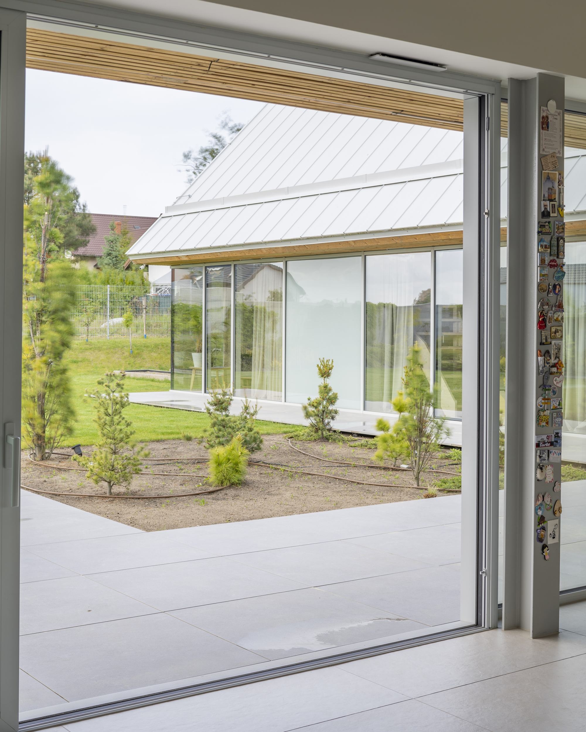 Középpontjában egy tágas, nyitott mennyezetű szoba található, amely a konyhát, az étkezőt és a nappalit ötvözi. Ez a család mindennapi életének találkozási pontja – egy világos és magas tér, amely elősegíti az összetartozást. A második szárnyban a gyermekek szobái találhatók, amelyek egymás után vannak elrendezve, és a tető alatt kompakt mezzanine szintekkel vannak kibővítve, így játékos privát zónákká alakulnak. A fő hálószoba szintén nyitott mennyezettel rendelkezik, ami növeli a levegő és a fény mennyiségét.