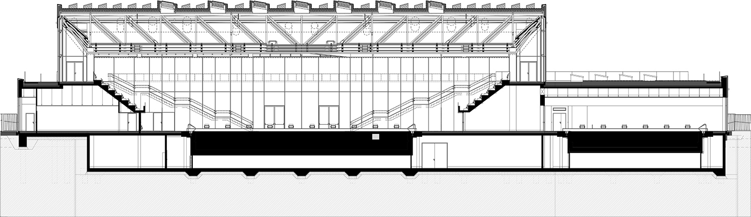 A medencetér fölé boruló, hol kissé megemelkedő, hol lehajló, fémbordákból kialakított álmennyezet nem takarja el teljesen a fölötte húzódó gépészetet, de leveszi a látványról annak részleteit, ráadásul az emeleten, a lelátók melletti büfé fölött izgalmas lehetőséget ad a világítótestek elhelyezésére a fémbordák között. Az üvegfalakon három oldalról beáramló természetes fény áradását a tetőn felülvilágítók is segítik, de a teljes homlokzati üvegfelület árnyékolható.
