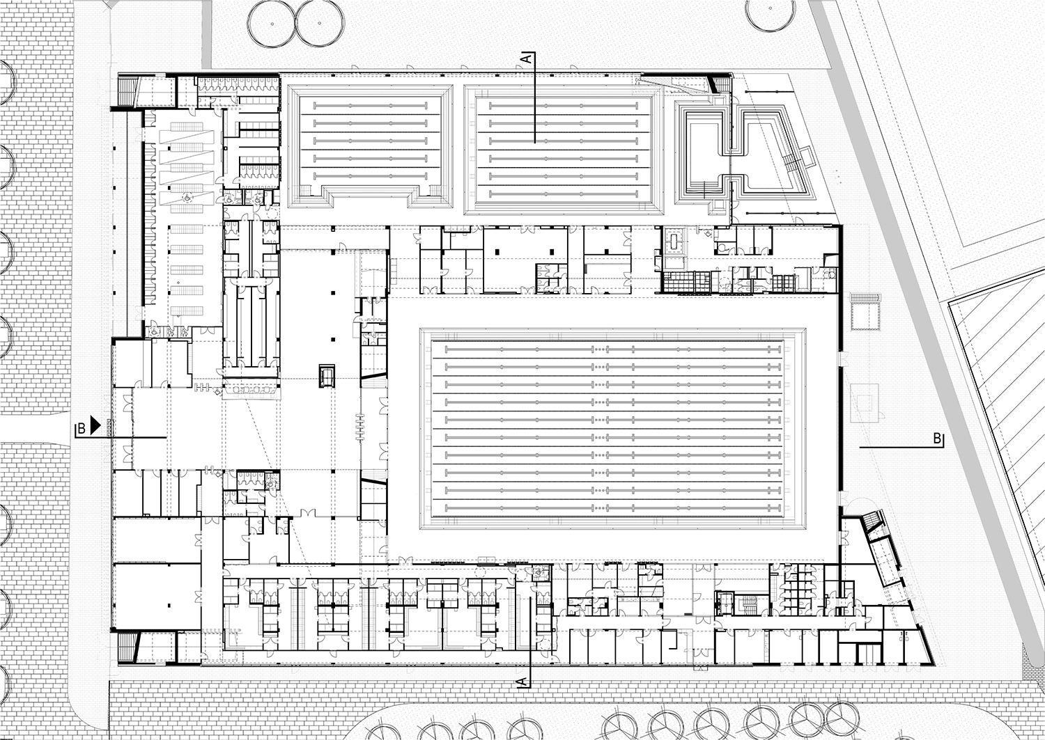 A központi térhez több kisebb is kapcsolódik: ide nyílnak az erőnléti és konditermek, illetve innen vezet át a wellness részleg a bemelegítő, meleg vizes, illetve tanmedencéből álló kisebb uszodarész felé. Utóbbi közvetlenül kapcsolódik a parkhoz, ahogyan a tetőkerthez és a kinti lazítómedencéhez is. Ezen kívül a földszinti részben konferencia- és irodahelyiségeket, elkülönített bejáratú VIP-részleget, tanulószobát, gyerekmegőrzőt, büféket és üzleteket is kialakítottak.