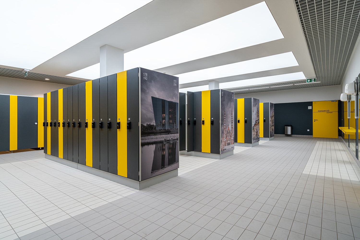 Az előcsarnok igazi látványossága az üvegfalon túl teljes hosszában feltáruló, két oldalán lelátókkal szegélyezett versenymedence. A lelátókra innen, az előcsarnok két szemközti végéből vezet egy-egy üvegkorláttal kísért lépcső. Az úszók is két irányból jutnak beljebb: az egyiken az óvodai és iskolai csoportok, illetve a hétköznapi úszók, a másikon a versenyzők érik el az öltözőiket. A két öltözőrész színeiben is markánsan különbözik egymástól: a sportolók számára kialakított helyiségek alaptónusa a sötétkék, ezt egészíti ki a szürke több árnyalata, az úszni tanulók és úszásra vágyók öltözője és zuhanyzója sárga burkolatú.