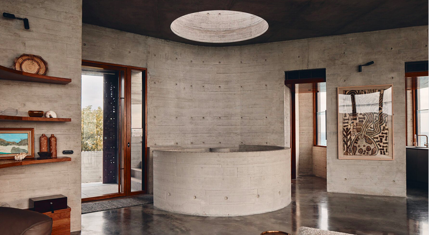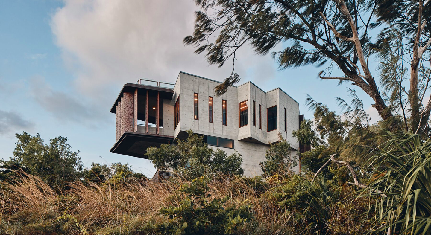 Az építtetővel szorosan együttműködve a JDA Co. a kényes egyensúly elérésére törekedett a környezet zavarásának minimalizálása és egy olyan tartós szerkezet létrehozása között, amely kiállja az idő próbáját. Az épület deszkából formázott betonból készült. Ez a robusztus anyag védelmet nyújt a szélsőséges időjárási viszonyok ellen, miközben kíméletes hatást gyakorol a környezetre. A ház külsejét borító perforált rézlapok mindeközben pajzsként működnek, ellenállva a zátonyokra jellemző erős ciklonális szeleknek.