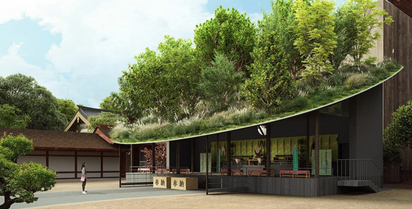 Zöldtetőt borított az ideiglenes szentély csarnokára Sou Fujimoto.