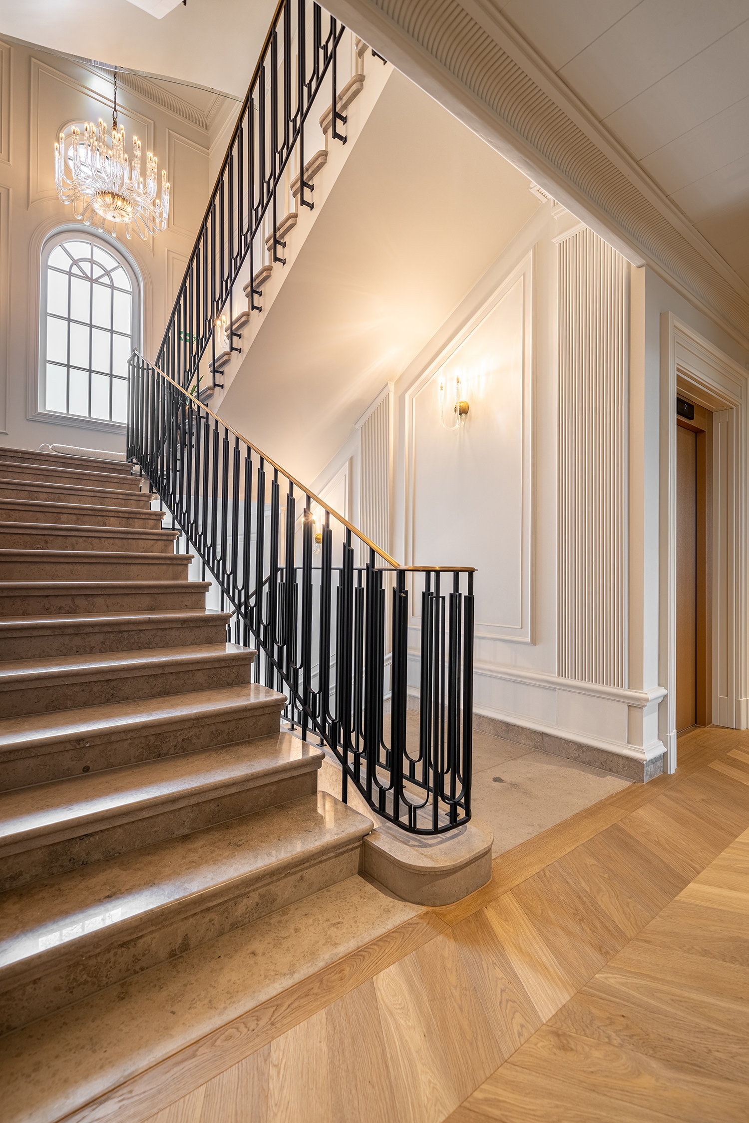 A beruházó LAKI Csoport elegáns és nyugodt hangulatot teremtett, részben felidézve a századforduló hangulatát, amikor a termálvizéről ismert város a fürdőváros nemeseinek és polgárainak fénykorát élte. A számos eredeti építészeti elem – eredeti kőburkolat és régi faablakok – mellett a belsőépítészek bátran alkalmaztak klasszikus és kortárs elemeket, többek között stukkókat vagy különleges anyagok kombinációját a kifinomult hatás elérése érdekében. A grafikai munkákban - például a tapétákon - Balatonfüred védett virága, a kökörcsin is megjelenik.