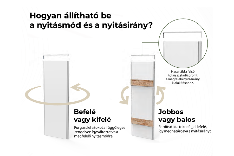 Az univerzális tapétaajtók különlegessége, hogy a „forgatható nyitásirány” funkcióval rendelkeznek, így nincs szükség külön jobbos vagy balos, kifelé vagy befelé nyíló változatra. Bármilyen megoldást is szeretnénk, elegendő a beszerelés során meghatározni a nyitás irányát, biztosítva, hogy az ajtó tökéletesen illeszkedjen a belső térhez.