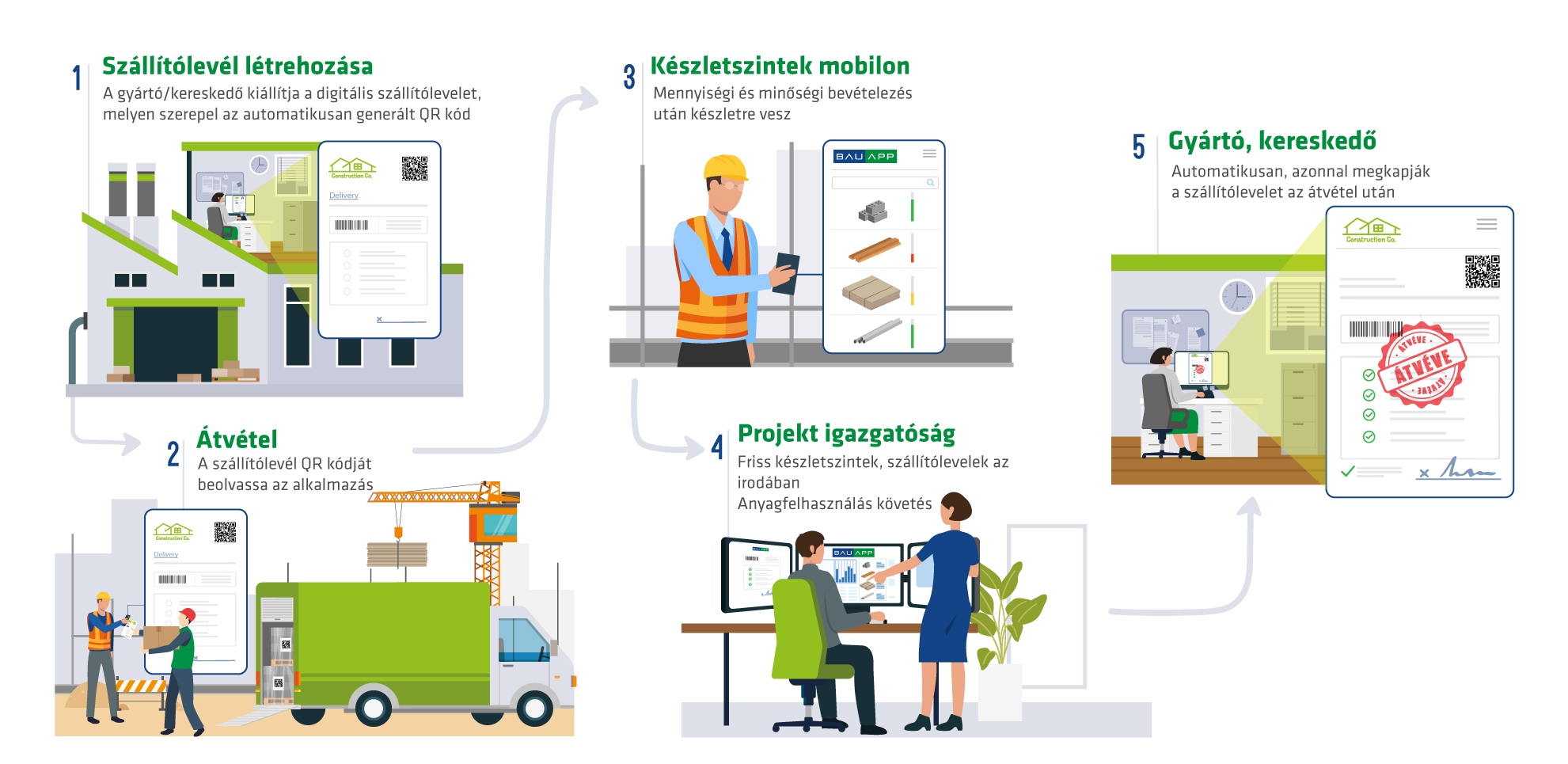 - A szállítólevélen található QR kód lehetővé teszi, hogy az áru átvételének helyszínén a kivitelező digitálisan azonosítsa és átvegye mobil alkalmazással a szállított anyagokat.