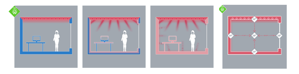 A levegő hőmérséklete mindig alacsonyabb, mint a padlóé, mennyezeté, falaké és bútoroké, így ezek folyamatosan meleget sugároznak magukból. A téli napsugárzásához hasonlítanám a rendszert: hiába hideg a levegő, a síelők gyakran pólóban ülnek a hütte előtti nyugágyakban a napon, és nem fáznak. Egy 26°C-os mennyezetfűtés esetén 24°C-ot mérnek a padlón, miközben a levegő hőmérséklete 20°C. Ezért nem fázik a láb, de a hőt sugárzó felületek miatt a hőérzetünk is kitűnő.