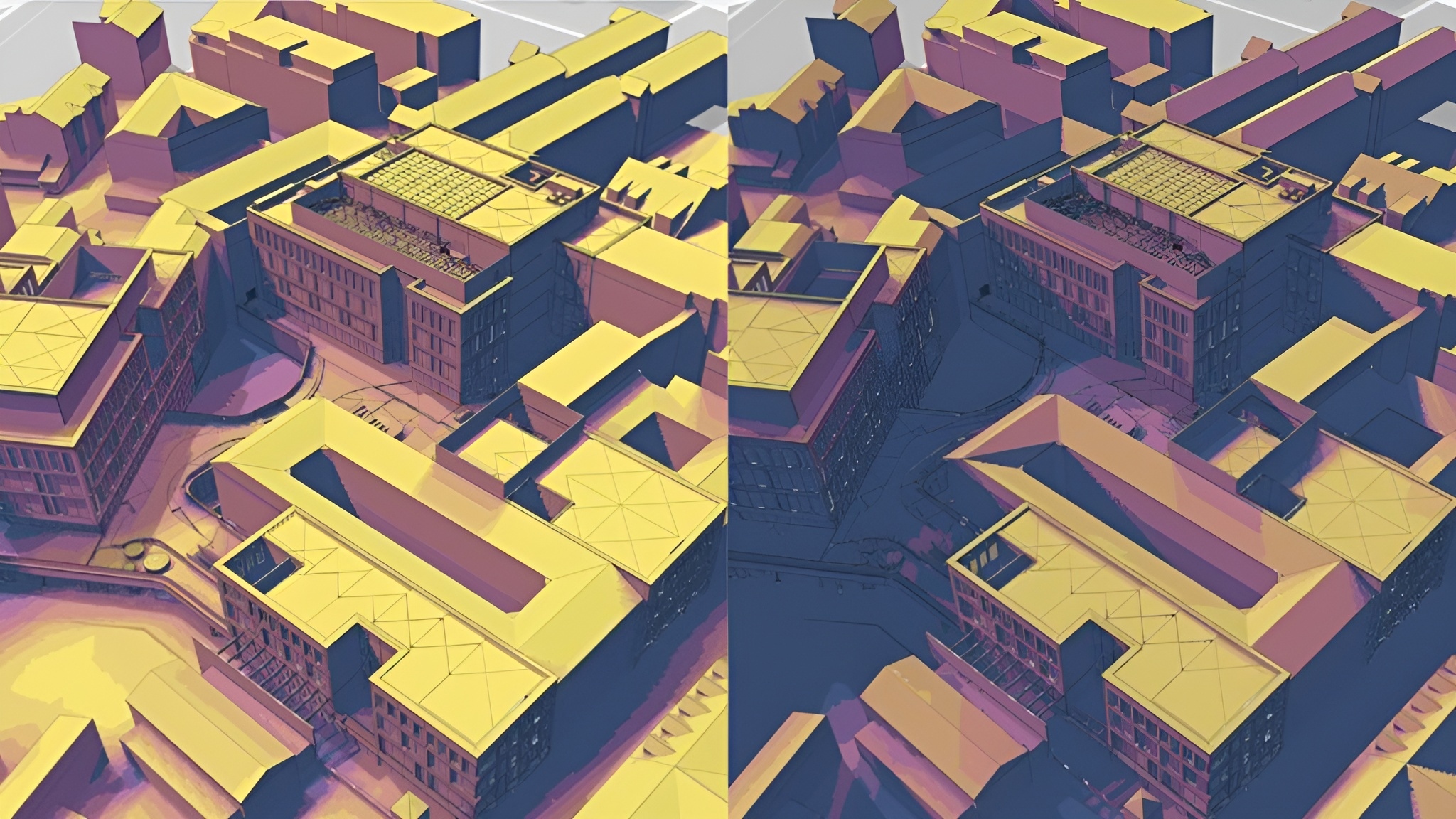 Szimuláltuk egyébként a zajterhelést is, ezt többek között az irodák és laborok elhelyezésénél vettük számításba. Ez pont ellentétes eredményt hozott, mint a benapozási vizsgálat: mivel a szűk utcák miatt az alsó szintekre kevesebb napfény jut, oda indokolt lett volna nagyobb üvegfelületet tervezni. A zajszimuláció szerint ugyanakkor az alsó szintek zajosabbak is, ez viszont az üvegfelület csökkentését indokolná. Végül a jobb benapozás mellett döntöttünk, de megemeletük az üvegezések akusztikai paramétereit.