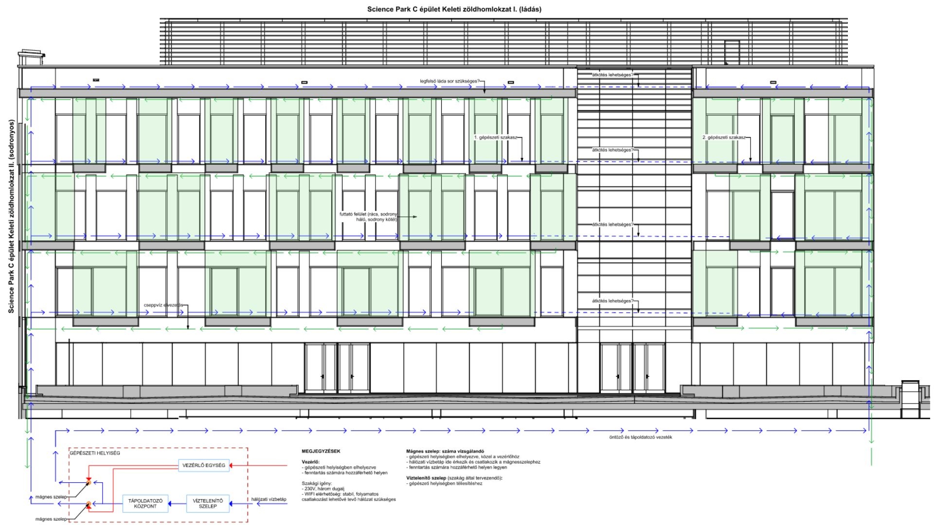 A zöldhomlokzathoz használt növények sorolható ültetőládái a támháló és a homlokzat közé kerülnek, ott eleve kell, hogy legyen egy 60 cm-es távolság. Kívülről emiatt ezek lényegében nem láthatók majd. A koncepciót egy automata öntöző-, vízelvezető- és tápoldatozó-rendszer egészíti ki, amit akár az egyes fajták eltérő igényeire is fel lehet programozni. Mindezek együttese lehetővé tette, hogy a növényfalakat sakktáblaszerű elrendezésben alakítsuk ki a homlokzaton, váltakozva az üvegfelületekkel. Az irodai üveghomlokzat elé feszített zöldhomlokzat tervezési elve az volt, hogy minden homlokzat mögötti helyiség rendelkezzen olyan üvegfelülettel is, ami előtt nincs zöld homlokzat. Emiatt adódik a zöld homlokzat „sakktábla” szerű kiosztása, ami emellett egyedi homlokzati képet is biztosít. A növényfalaknak egyébként nemcsak az árnyékolásban, de a zajszűrésben is szerepe van.