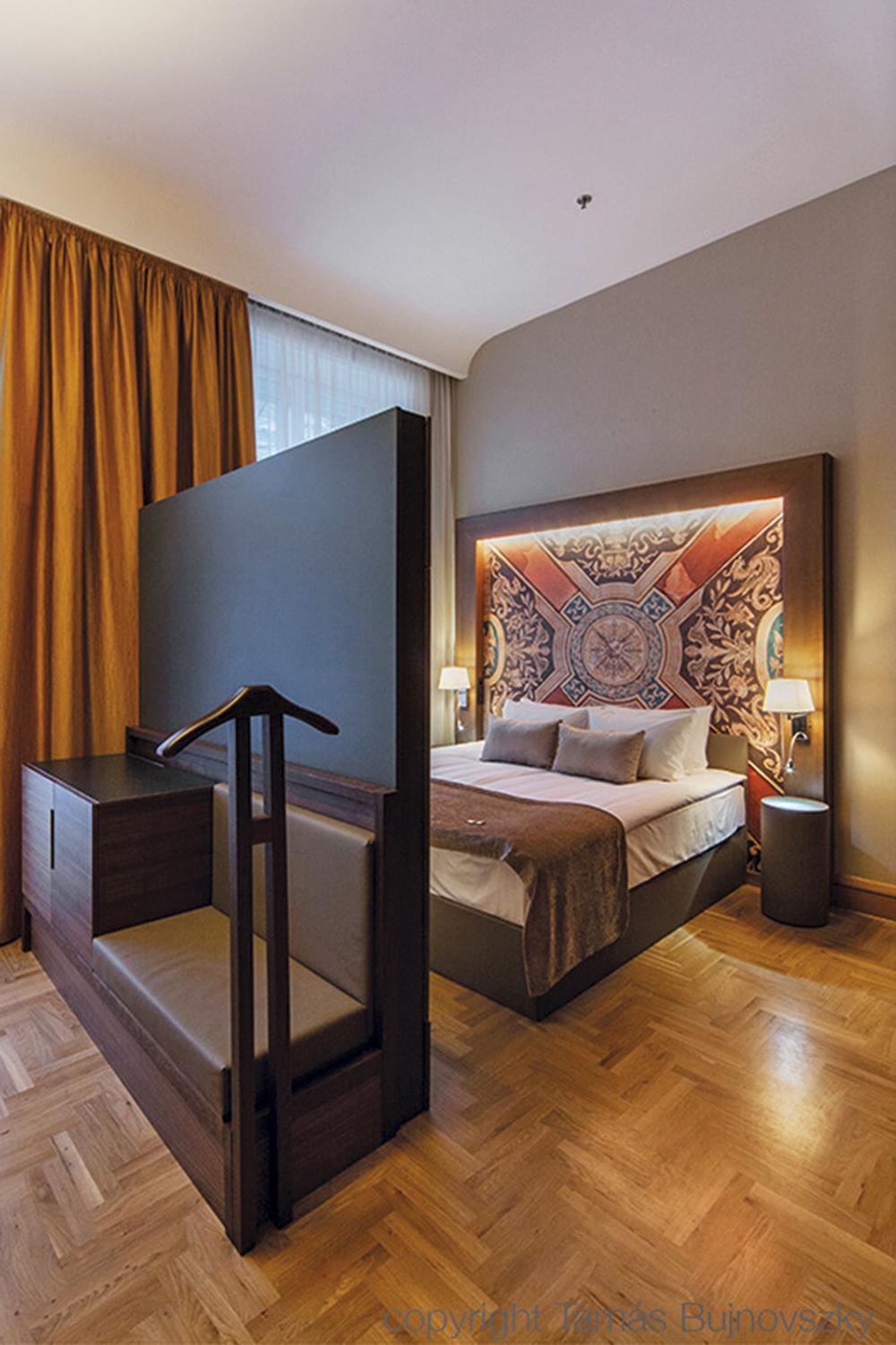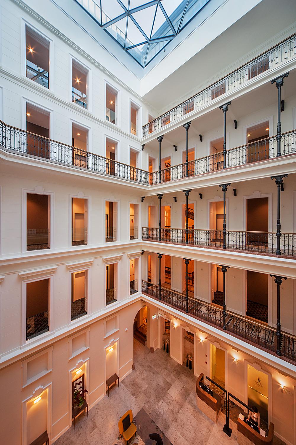 Térugrás. Nagy Csaba és Göde András közös tervezői zsenialitása több ponton is megmutatkozik. A függőfolyosó üvegfedése önmagában csak egy szellős, napfényes, de csarnokhangulatú, akusztikailag terhelt átriumot eredményezne, annak köszönhetően viszont, hogy egyedi világítótestekkel, szőnyeggel, zongorával berendezett zónát alakítottak ki a földszinten, a vertikális adottság ellenére is a belátható, horizontális térélmény dominál. A tetőszint megemelése az utcáról láthatatlan, miközben légies, üvegfalú, panorámás padlásszobák létrehozására adott lehetőséget. Már a szintén Nagy Csaba által tervezett Andrássy út 19. számú Il Bacióban is megjelent az újragondolt függőfolyosó koncepciója, a hotel esetében a kibontott ablak alatti parapetek és a nyílásokban megjelenő bélletek, valamint közös előszobává tett folyosók csalókán otthonos érzést keltenek. Arra, hogy az Archikon tetőátépítésben kiemelkedő, már a korábbi, Szabadság tér 14. számú irodaháznál példát mutatott.