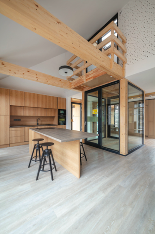 A meglévő épületek újragondolása, 21. századi térré alakítása korábban is foglalkoztatta a kivitelező cég szakembereit, így szívesen fogadták a kihívást, hogy egyedi bútorokat tervezzenek és gyártsanak le az ún. Kádár-kocka újraértelmezéseként született ökoházba.