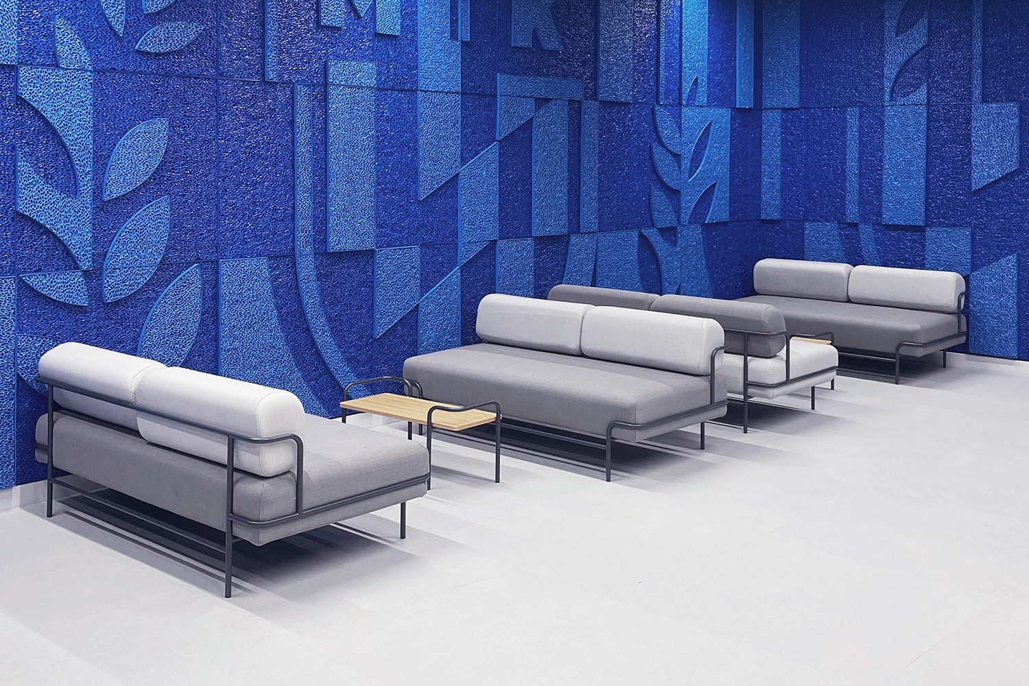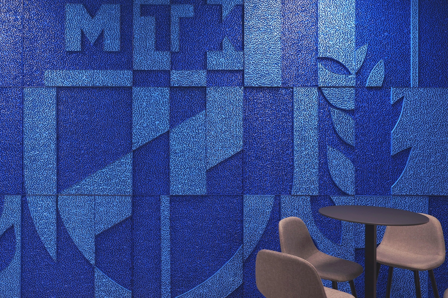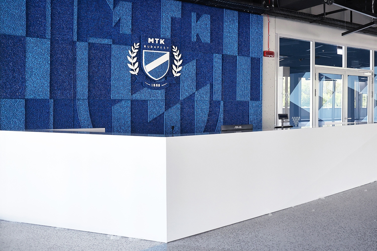 A több mint 135 négyzetméteres felületen a korszerű anyag nem burkolatként, hanem önálló művészeti alkotásként jelenik meg az építészeti térben, a korábban általunk is bemutatott új MTK Sportparkban.