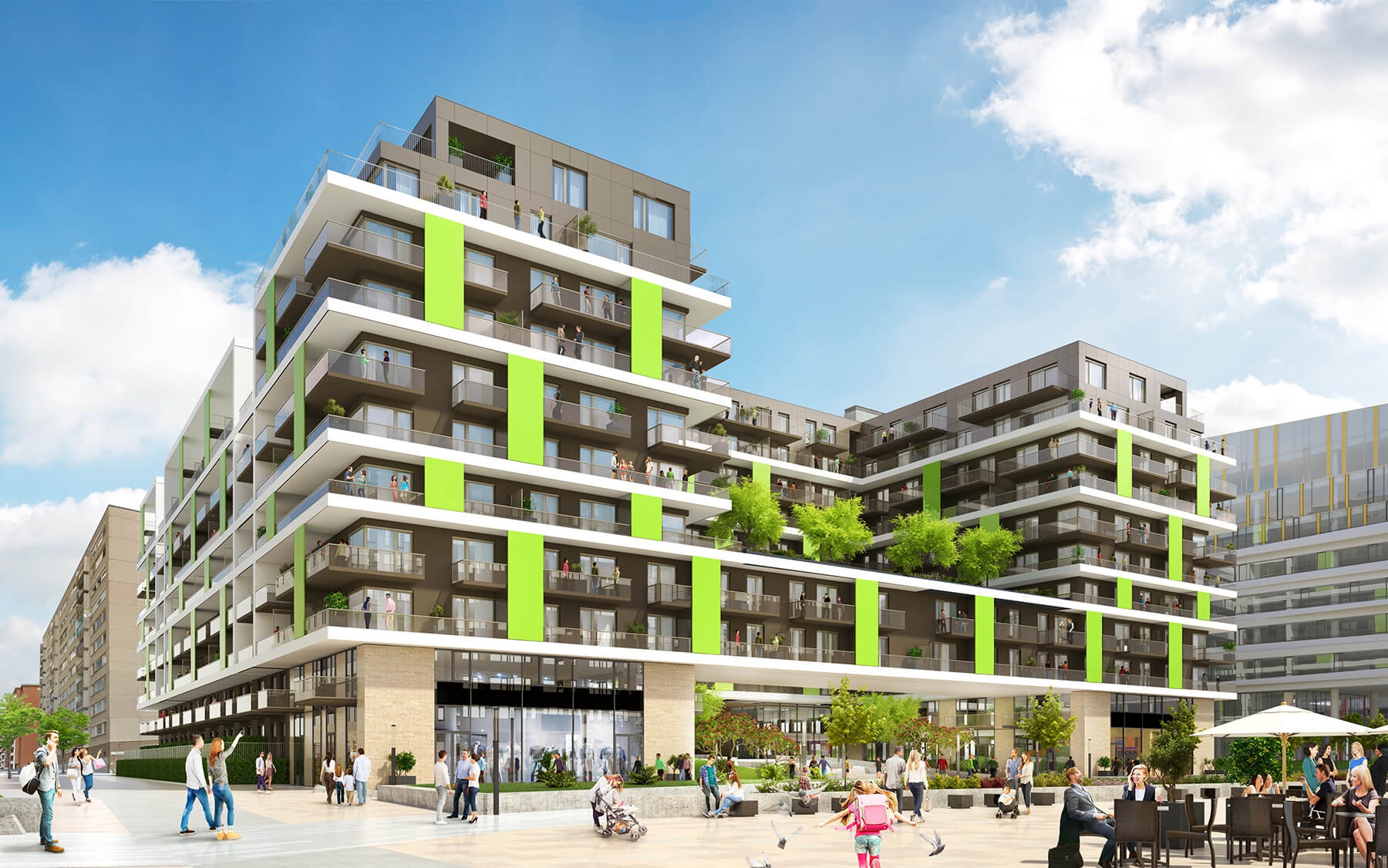 A vállalat tervei szerint e területen több, egymáshoz közeli telken, közös tengelyre felfűzve létesülnek majd a lakóépületek, így több ütemben 1000-nél is több lakás épül fel. Az első lakóház közvetlenül a Magyar Tudományos Akadémia új, modern kutatóközpontja, a Humán Tudományok Kutatóháza mellett áll majd, de ugyanabban a tömbben egy A kategóriás, új irodaház is hamarosan megnyitja kaput, közel 1000 dolgozó számára. A telekkel szemben szintén modern irodaházak kaptak helyet, egy szomszédos tömbben pedig a IX. kerületi rendőrkapitányság található.