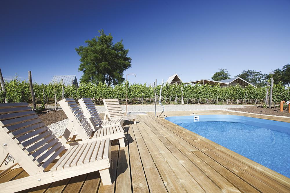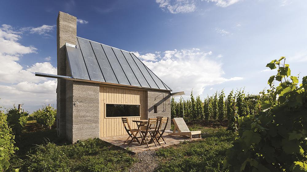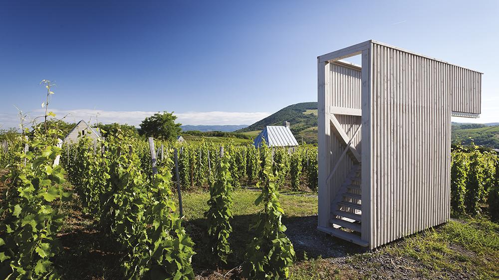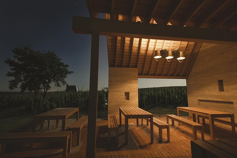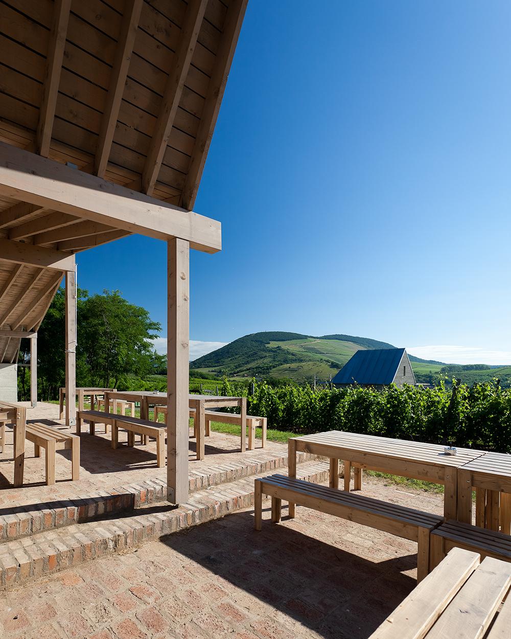 Továbbá a garázskapu-szerkezettel mozgatott, szinte egész szélességében a tájra nyitható „fal”, a tetők lemezfedése, átszellőző faszerkezetei, vagy a kunyhók kültéri zuhanyzóinak keresetlenségei. Ugyanakkor olyan részletek nagyon is rámutatnak a tervezők jelenlétére, mint a kilátó lécezése, ami lépcsőzés közben nem engedi a körbetekintést annak érdekében, hogy a panoráma szinte kirobbanjon a kilátó tetejére érve. Vagy az a tudatosság, ahogyan a terasz padlójának szintjét csak annyira emelik meg a tervezők, hogy a tőkék felett éppen elláson a vendég, ugyanakkor a növényeket minél közelebb érezze magához. De említhetnénk azt is, ahogyan a terasz mellett meghagytak egy pár akácfából álló kicsi ligetet, a lombkoronák árnyékában alatt sátrazni jó, ugyanakkor a fák magassága finoman szelídíti a terasztető magassági viszonyait.