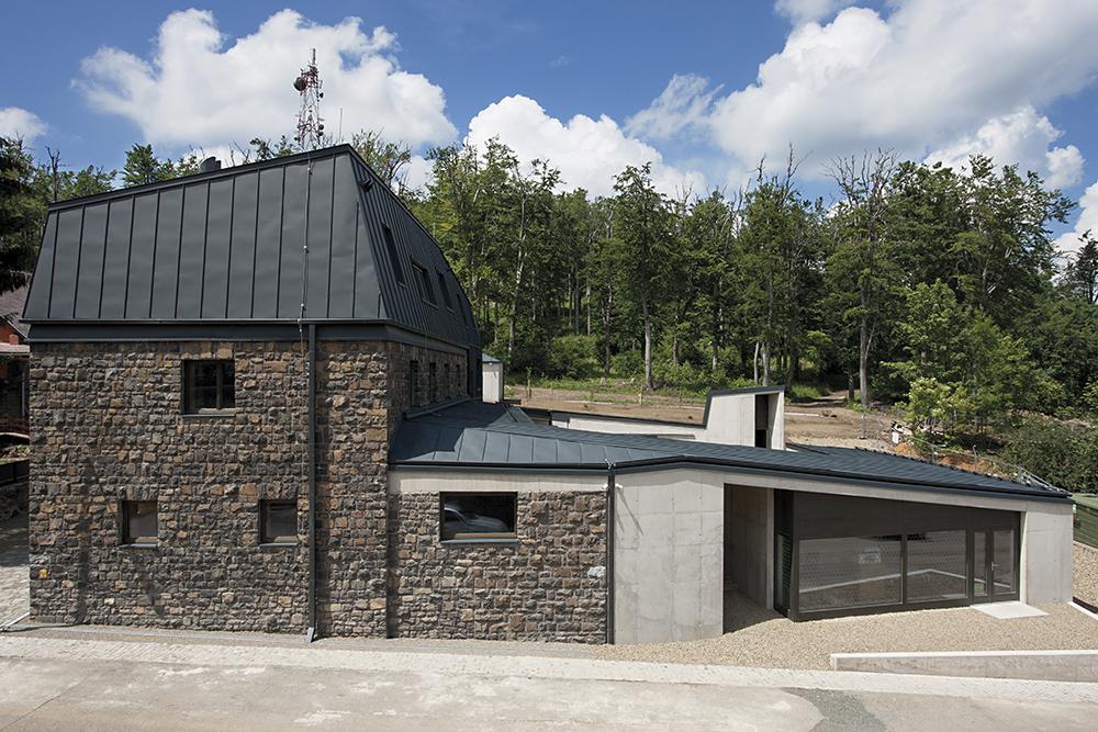 A kilátótól törtvonalú ösvény vezet le a turistaházig, ami érinti a beruházás során megmentett andezitből rakott, látszóbeton-elemekkel kiegészített nyilvános WC-t is. Ebből a szögből, kicsit rálátva az áttervezett épületre könnyen észrevehető, hogy az antracit színű fémtető fogja össze, kapcsolja eggyé a bővítést, a régit és újat. Sokféle, a laposabb, hét fokos lejtéseknél is szögtörést mutató tetőzet rendkívül izgalmas látványt tár a látogató elé, valódi „ötödik homlokzatként” funkcionál. Egyéni topográfiát, különös domborzatot jelenít meg, ami formai metaforája a környező hegyek, fennsíkok, völgyek alakjának. Ráadásul a tető alatt új funkciók, épületszárnyak és szintmagasítás épülhetett meg úgy, hogy a tömegek között aránytalanságot, a régi és új diszharmóniáját sehol sem fedezhetjük fel.